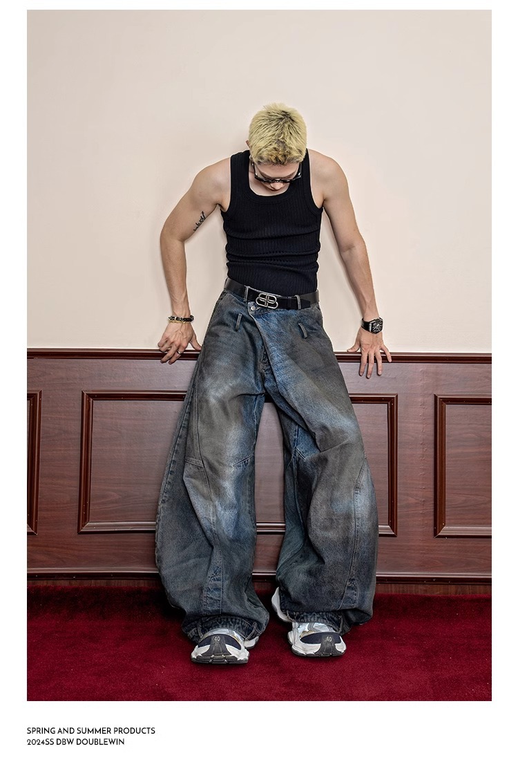 거리 고민 컬러 청바지 남자의 2024 가을 새로운 느슨한 디자인 감각 허리 넓은 다리 긴 바지