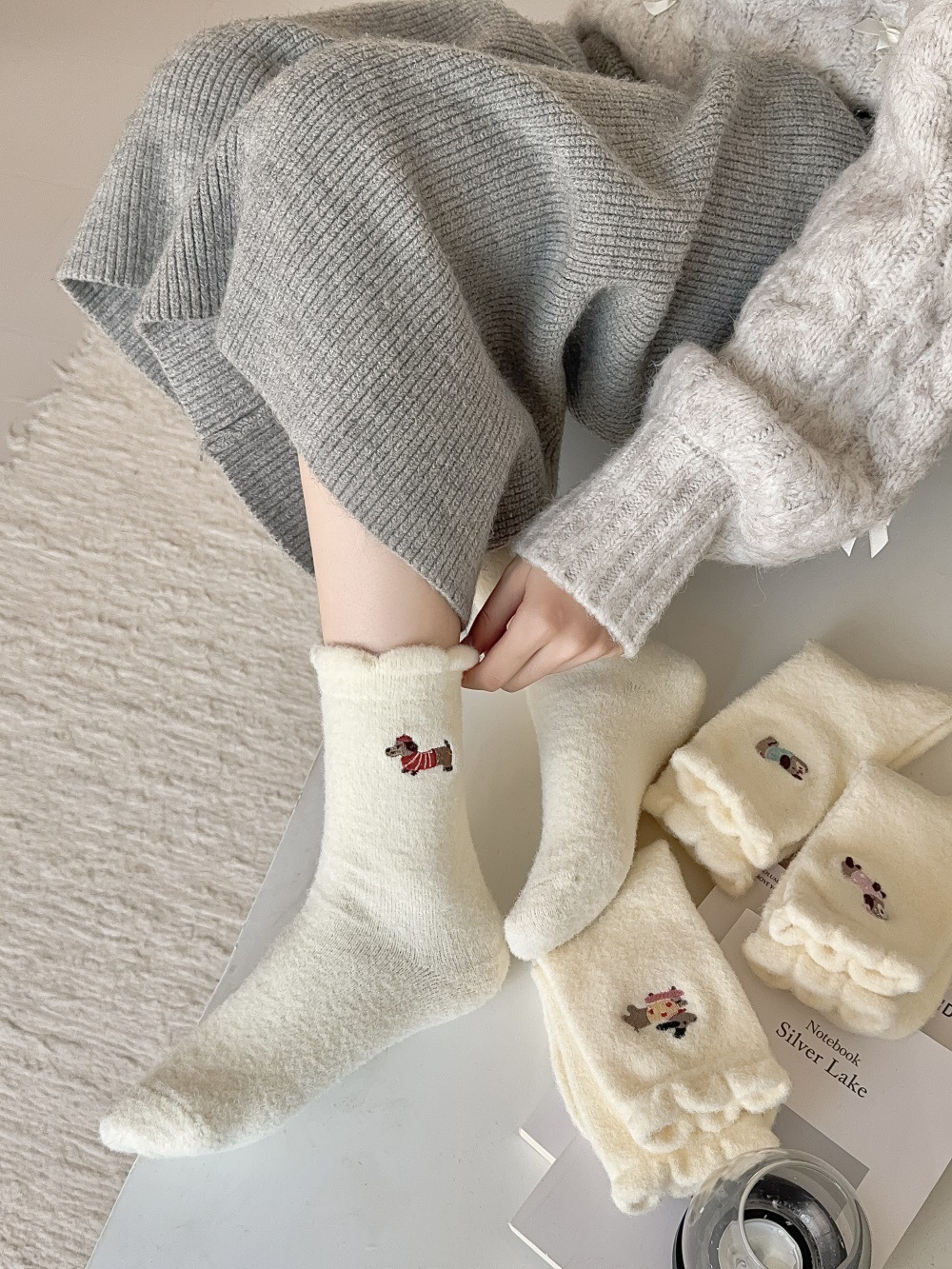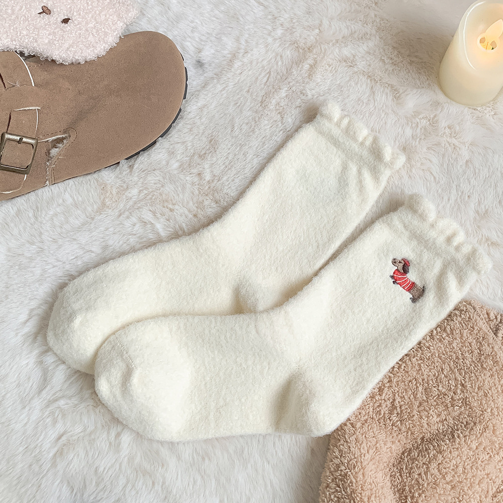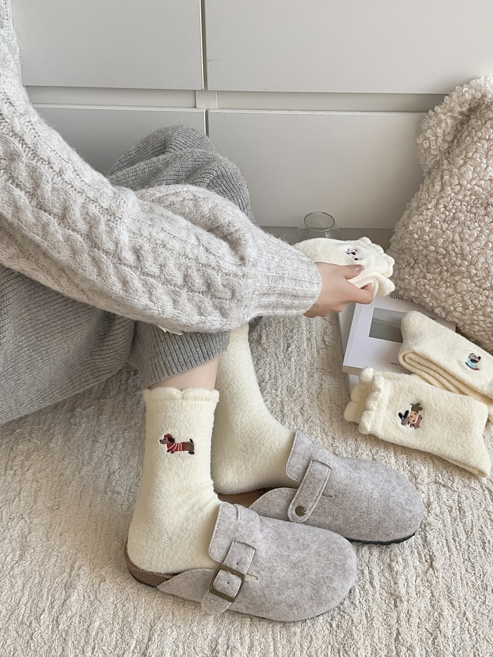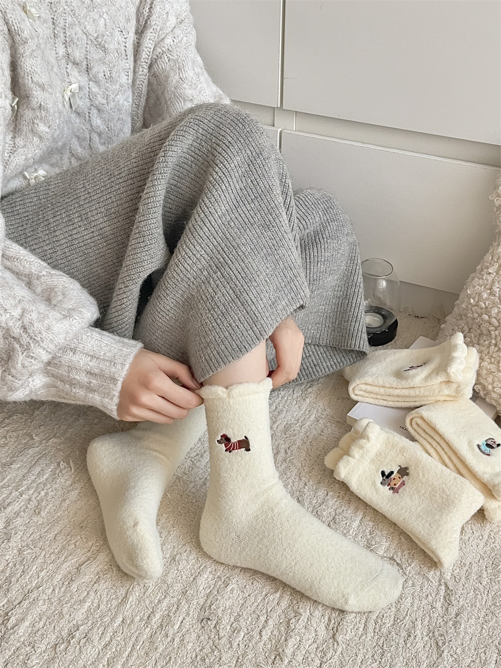Dachshund Dog 호주 벨벳 양말 어린이 중간 길이 양말 가을과 겨울 기모 두꺼운 따뜻한 귀여운 자수 흰색 양말 뼈없는 양말스토어 가기