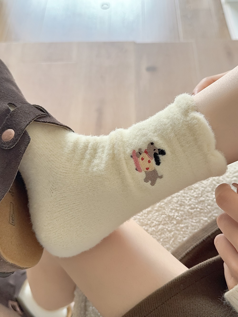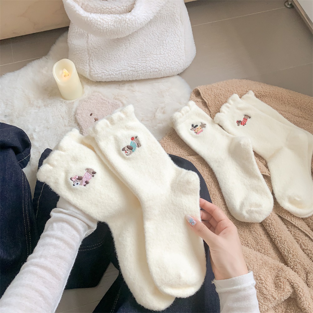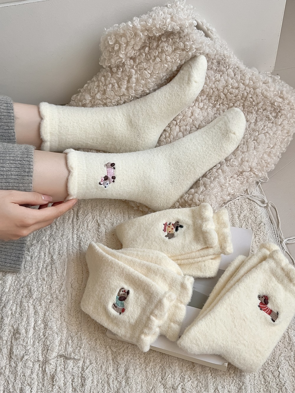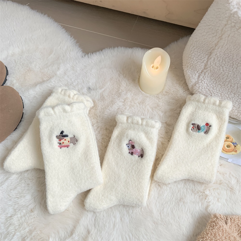 Dachshund Dog 호주 벨벳 양말 어린이 중간 길이 양말 가을과 겨울 기모 두꺼운 따뜻한 귀여운 자수 흰색 양말 뼈없는 양말