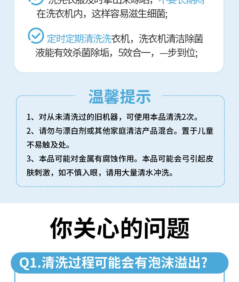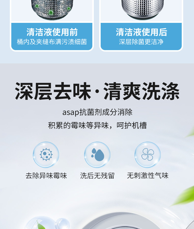 세탁기 세척제, 세척액, 탱크 세척제, 석회질 제거, 오염 제거, 항균액, 산소분해 분말, 살균액, 분해 세척 없이 사용 가능