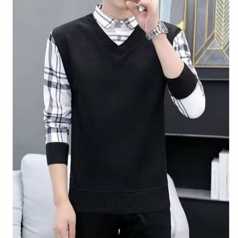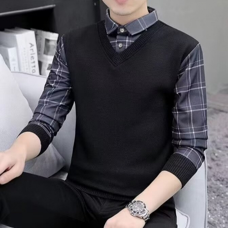 게으른 일본식 스퀘어 칼라 유행 새로운 풀오버 트렌디 브랜드 셔츠 칼라 긴 소매 캐주얼 가짜 2 피스 스웨터 남성용