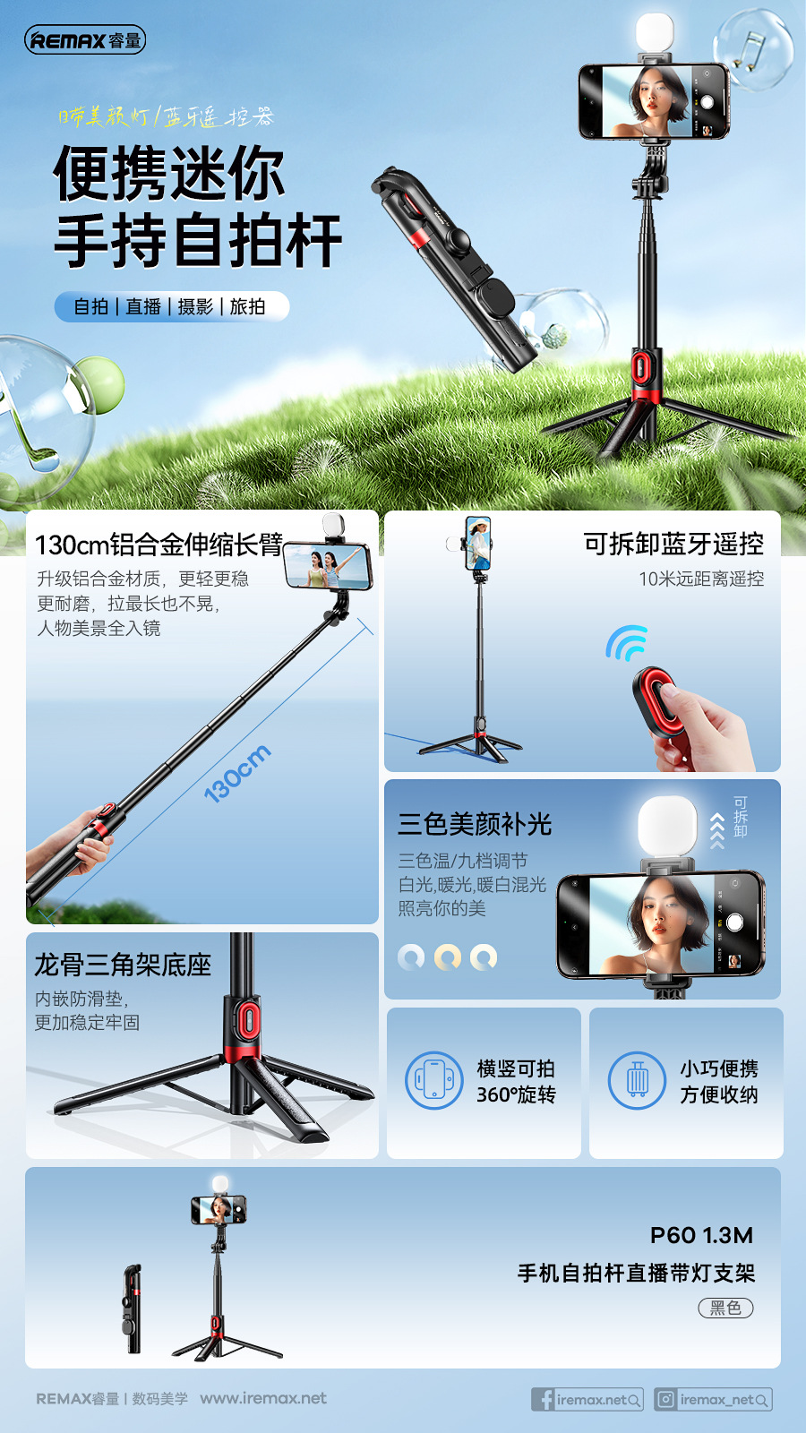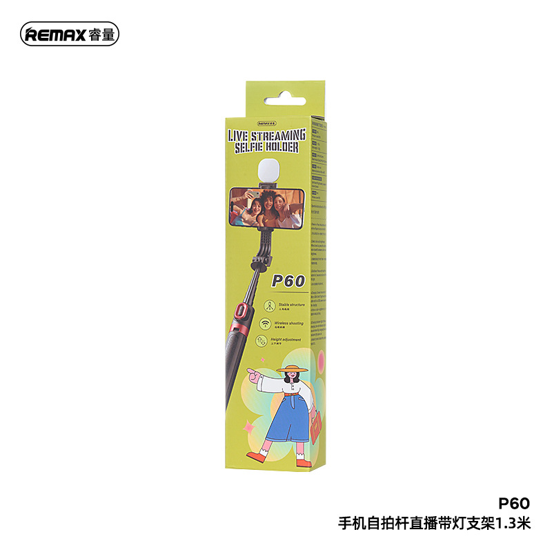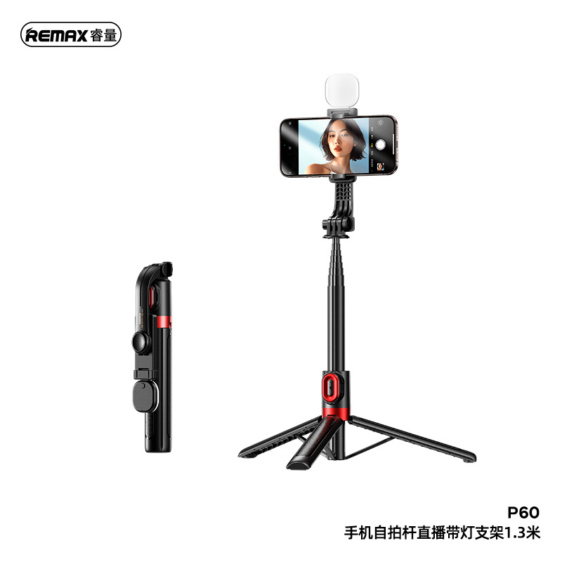 라이트 브래킷이있는 REMAX Rui 라이브 휴대 전화 셀카 스틱 1.3 미터 자체 제어 카메라 스틱 흔들림 방지 접이식