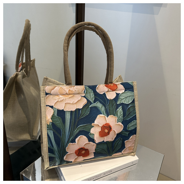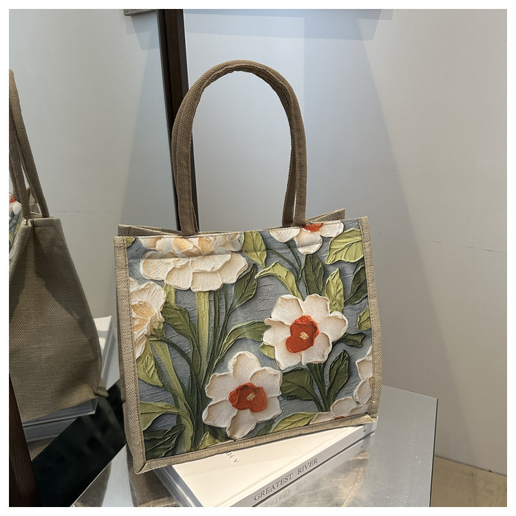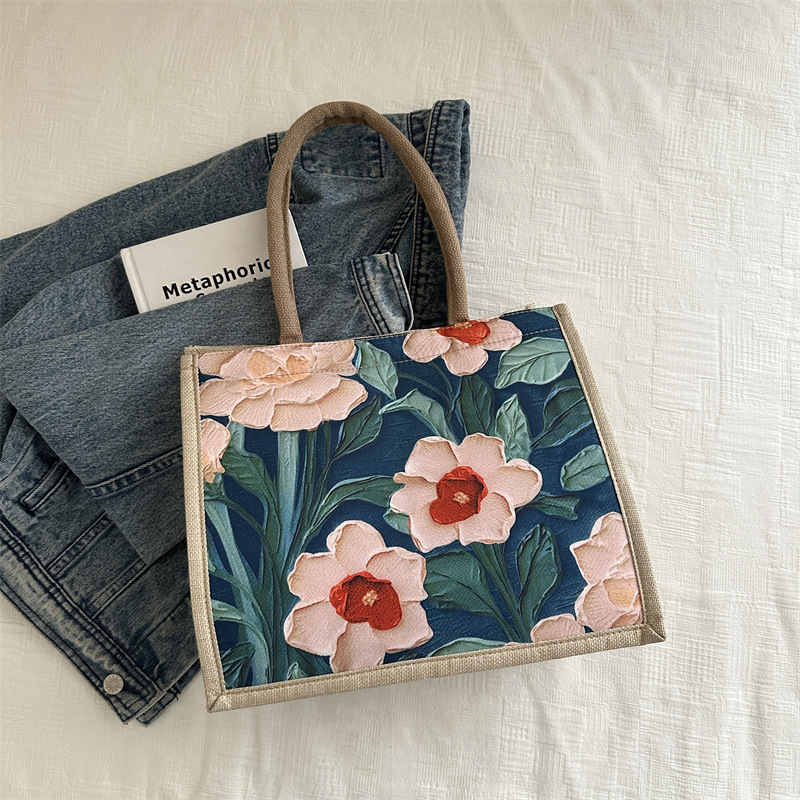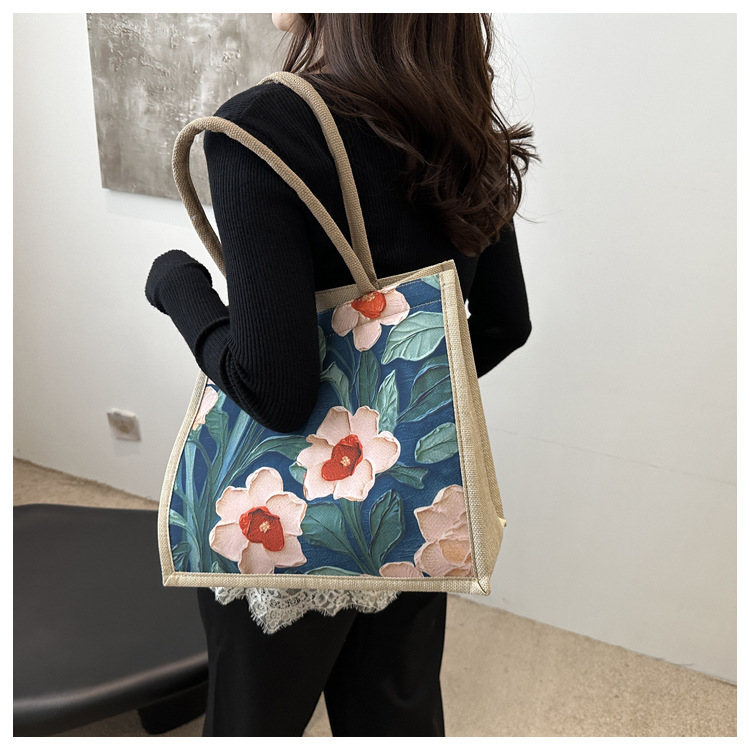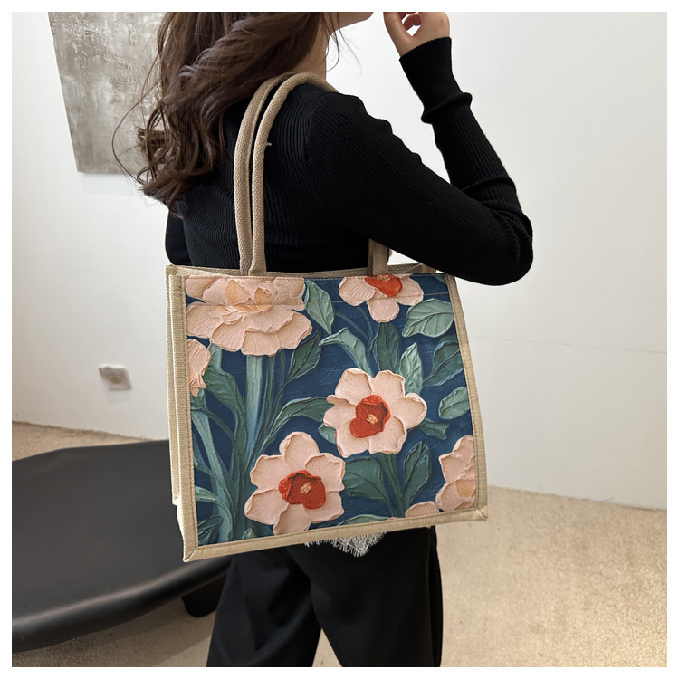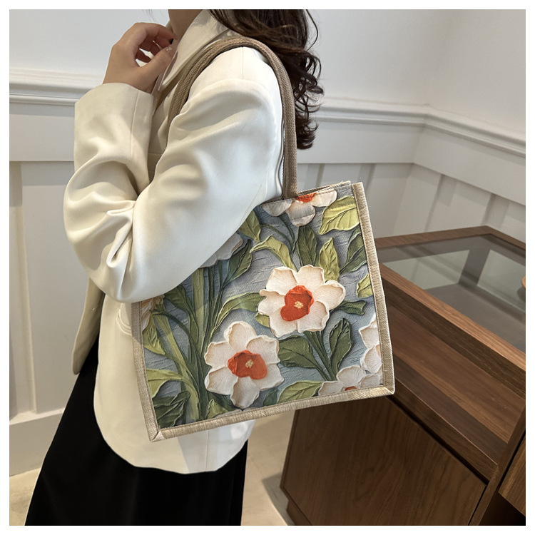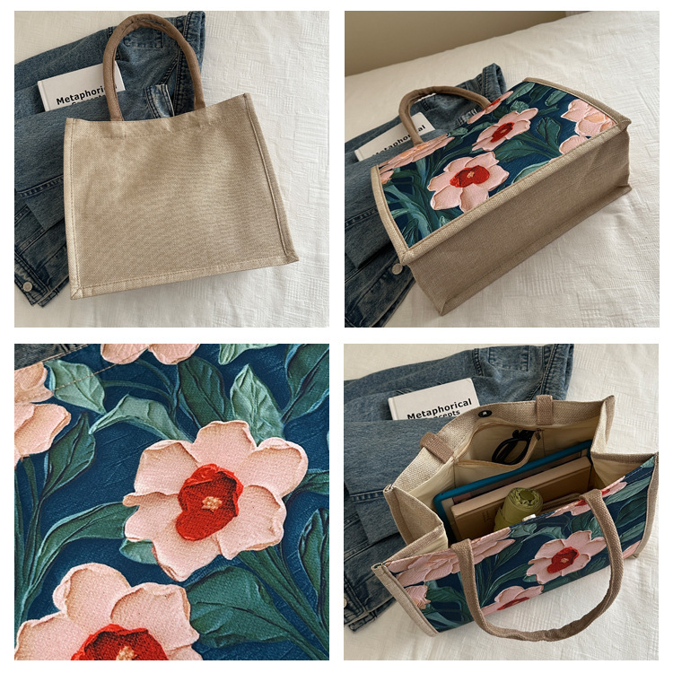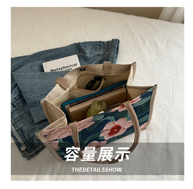 대용량 리넨 통근 가방 2024 새로운 어깨 토트 백 민족 스타일 학생 핸드백 클래스스토어 가기