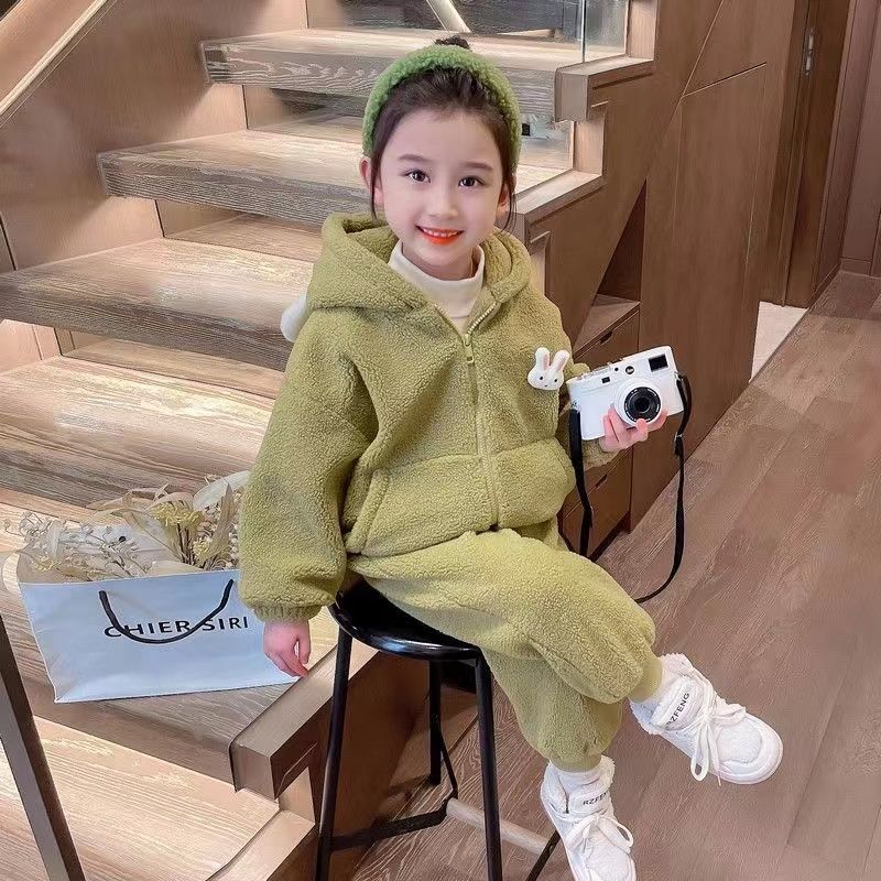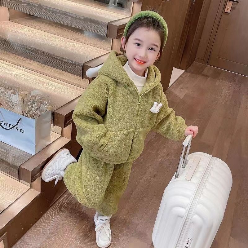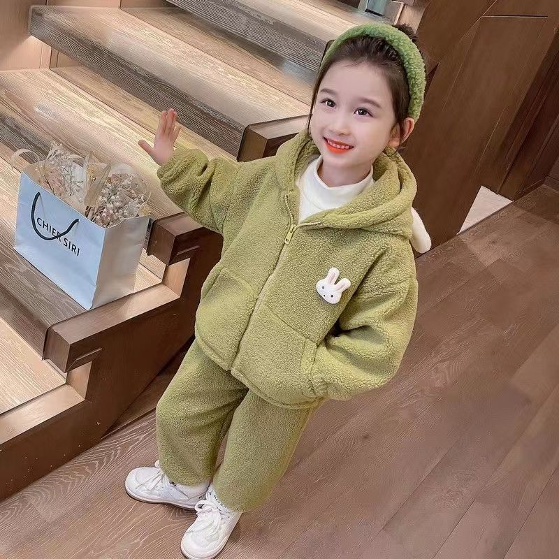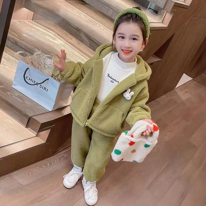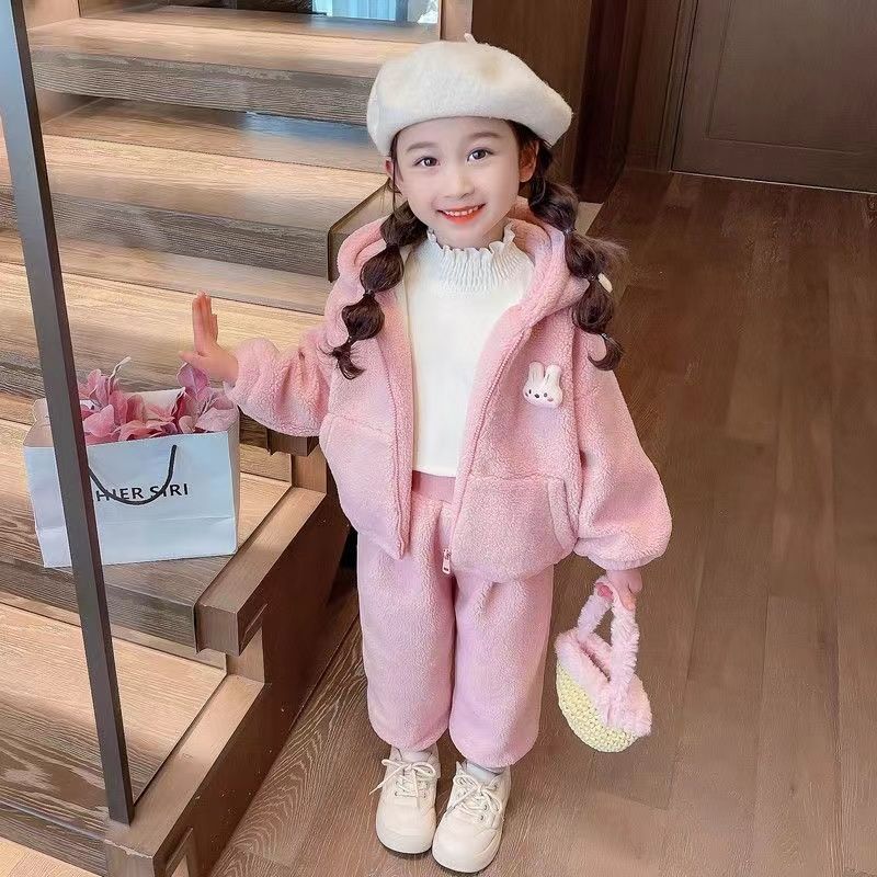 소녀 패션 따뜻한 기모 투피스 세트 2024 가을/겨울 새로운 후드 스웨트 재킷 캐주얼 바지 소녀 트렌디스토어 가기