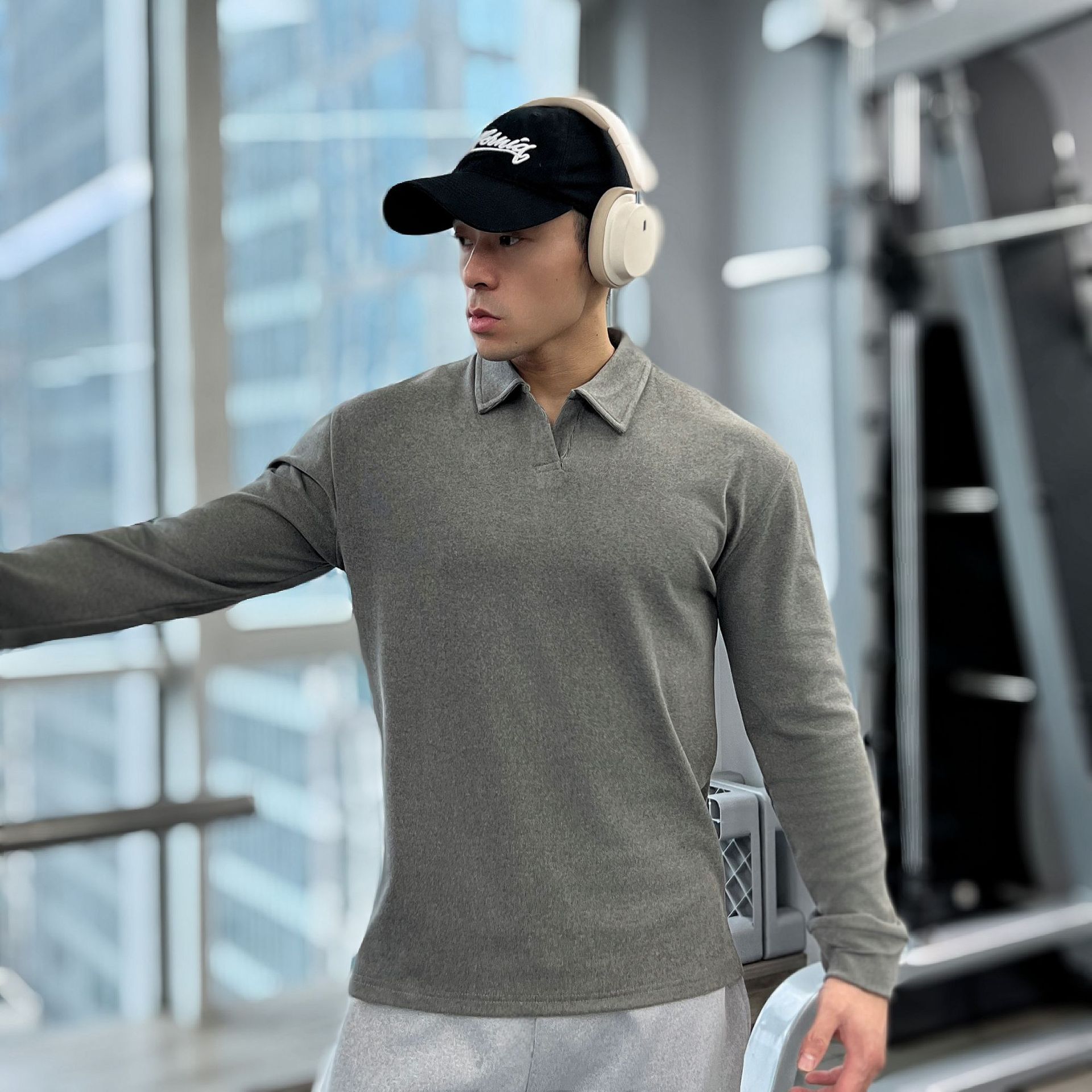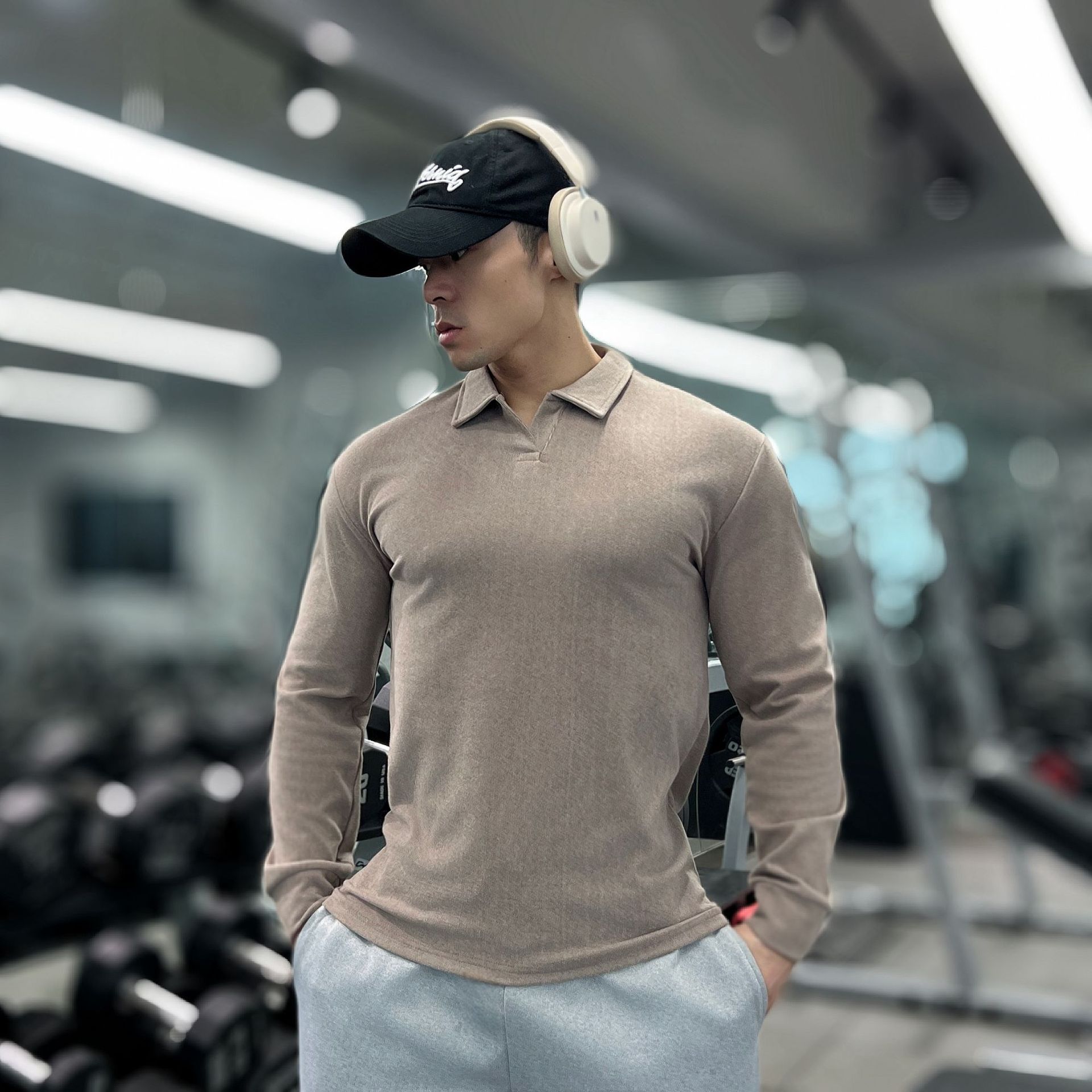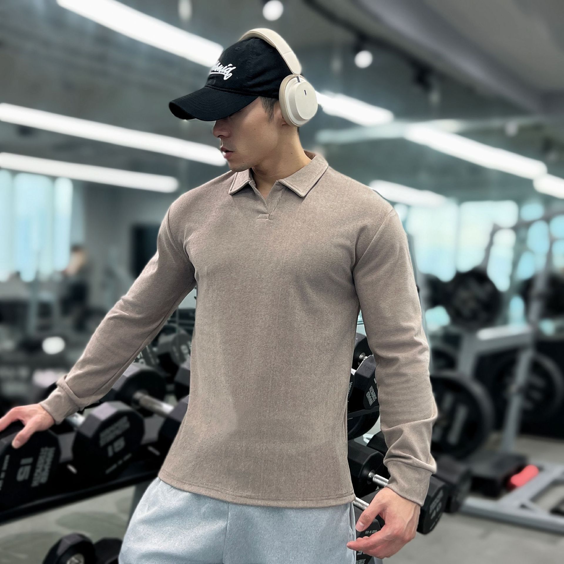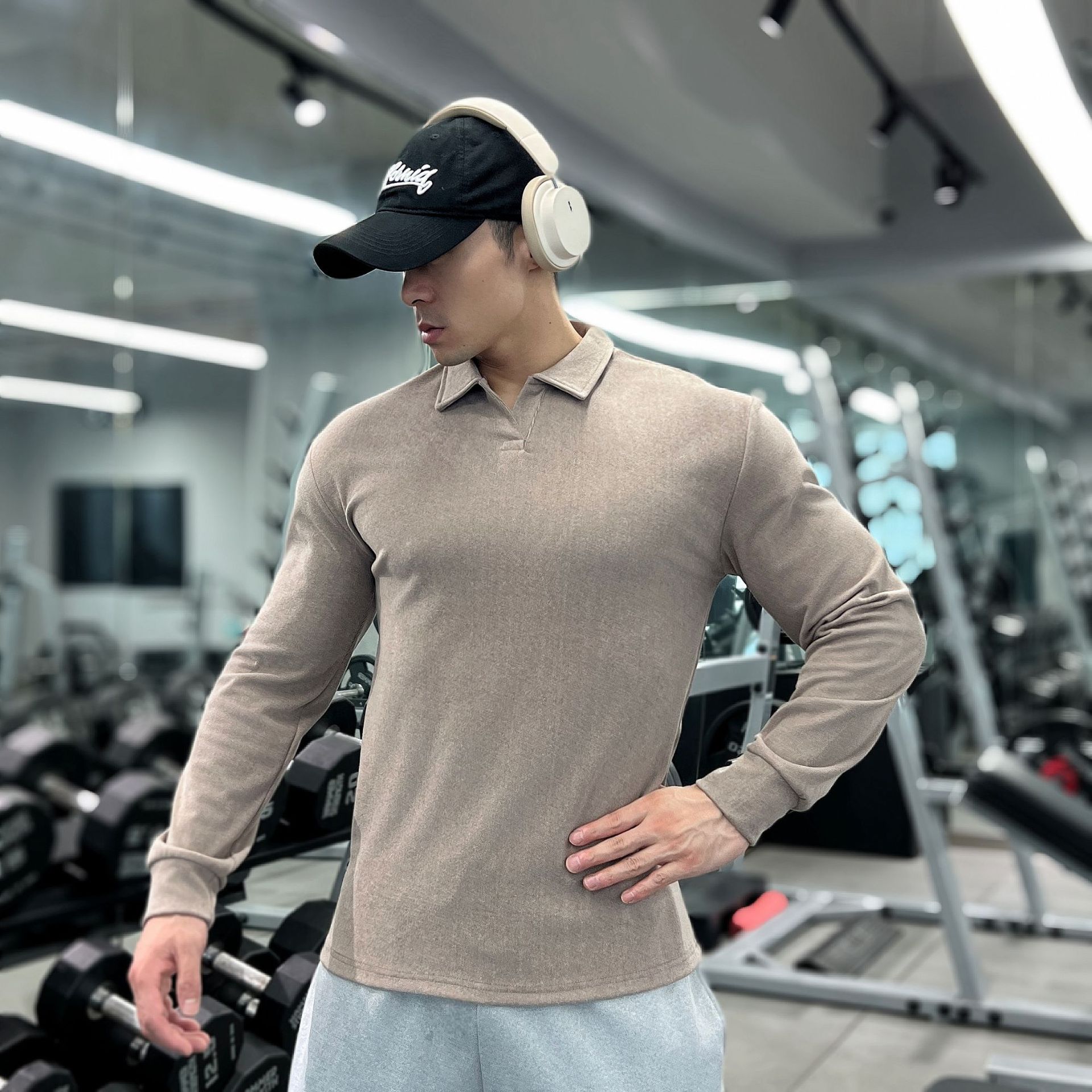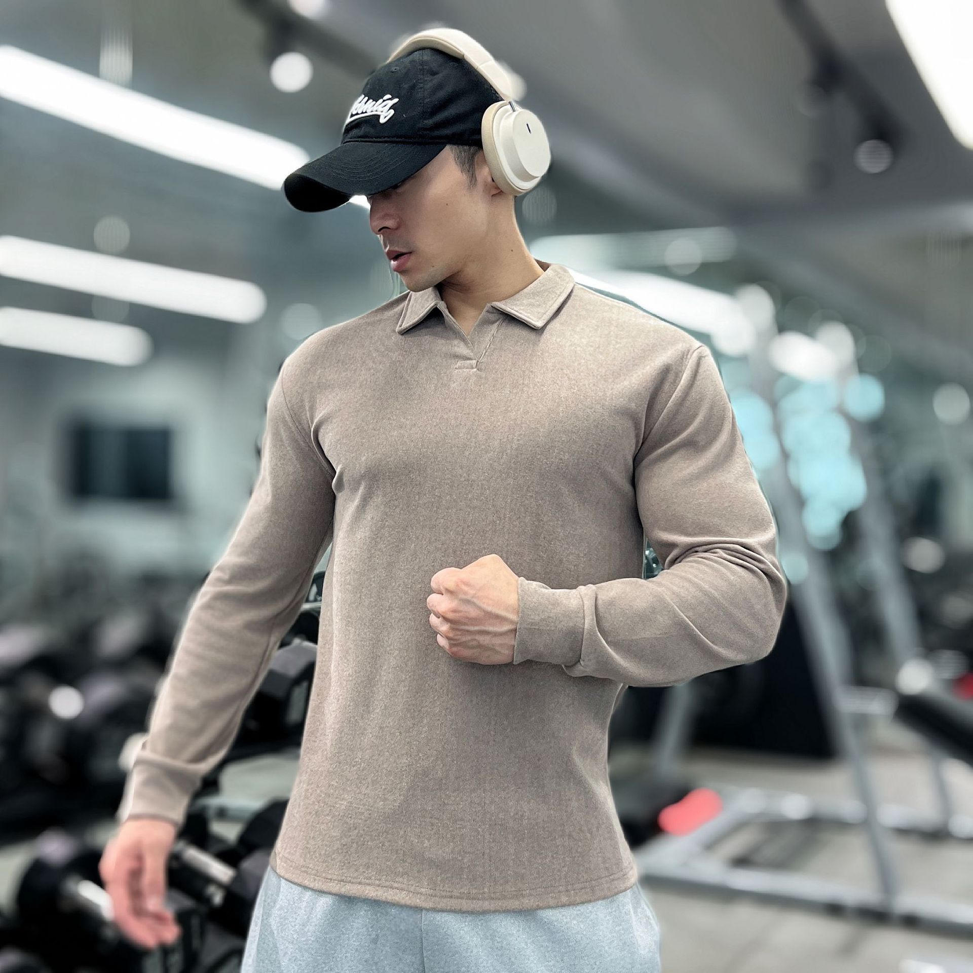 가을, 겨울 무거운 양면 독일 벨벳 따뜻한 슬림 피트니스 지퍼/레트로 폴로 칼라 스포츠 고탄력 바닥 긴팔 T스토어 가기