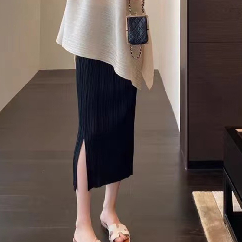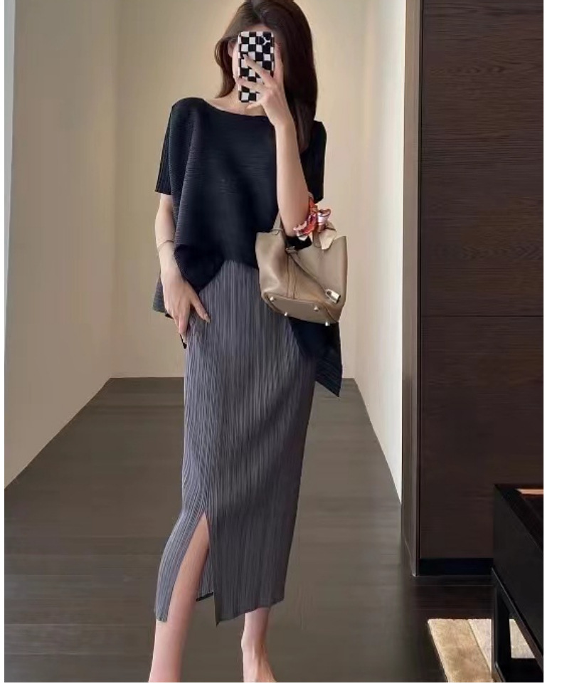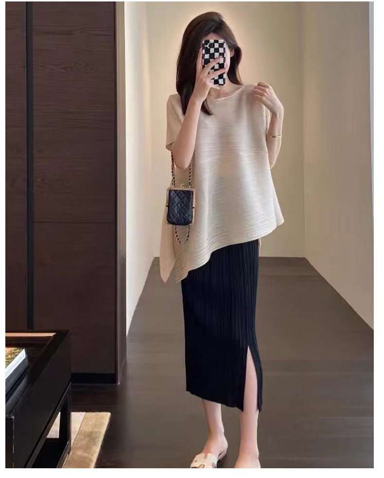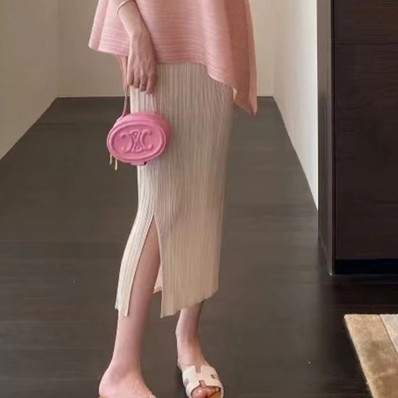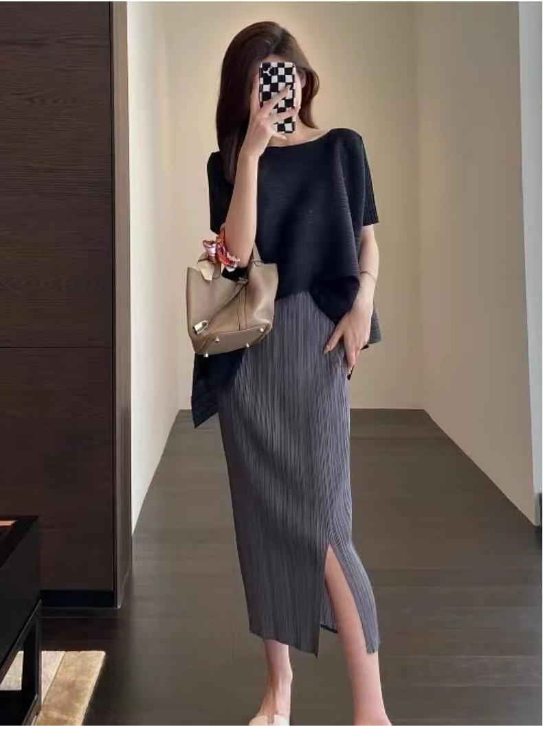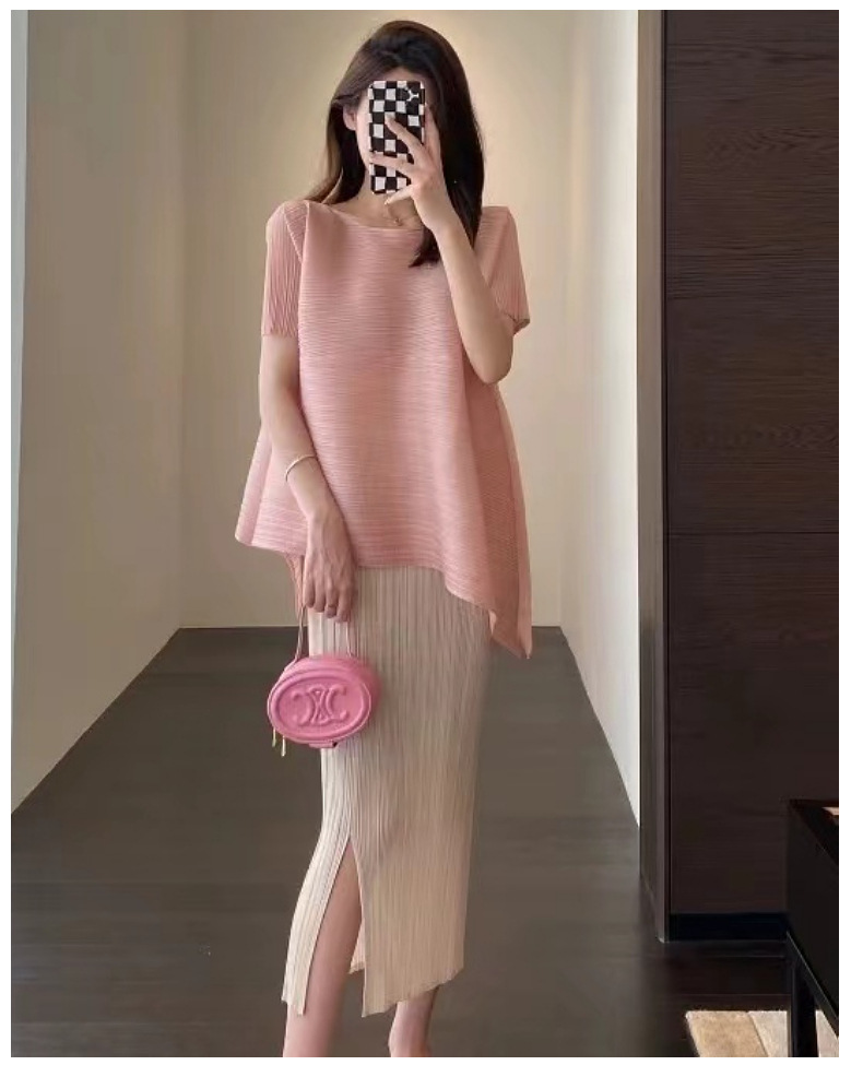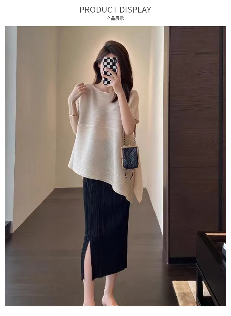 미야케 2024 새로운 스타일의 기질 사교계 솔리드 컬러 넓은 편안한 슬 랜트 탑 힙합 스커트 여름 세트 여성스토어 가기