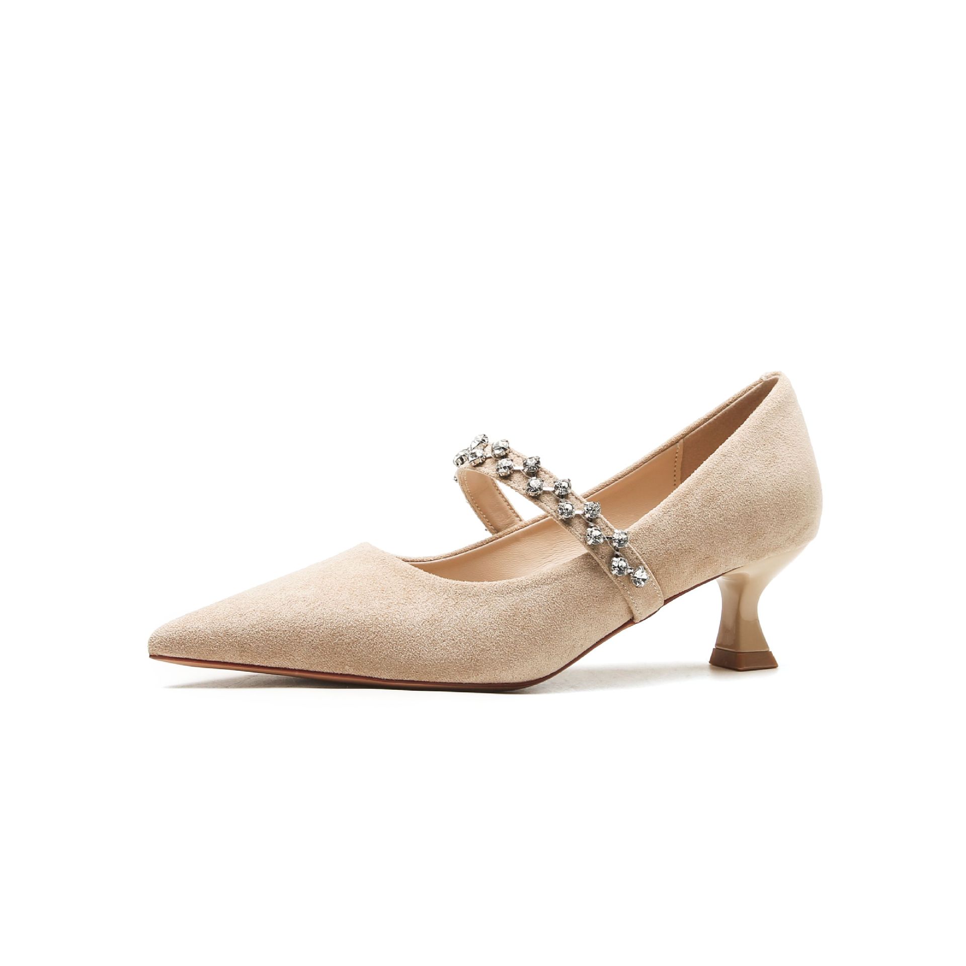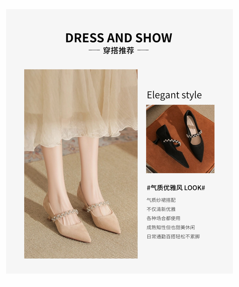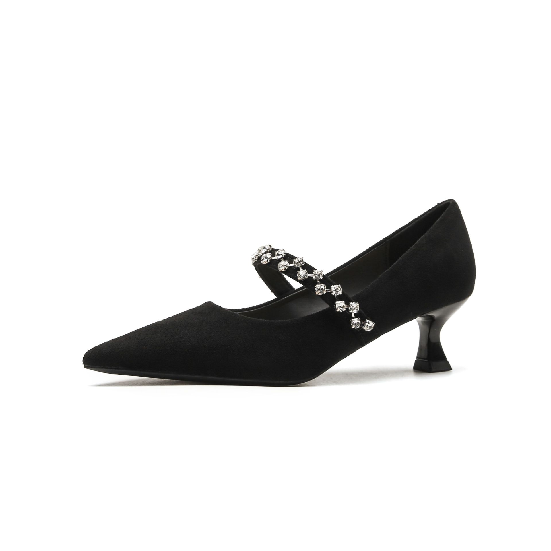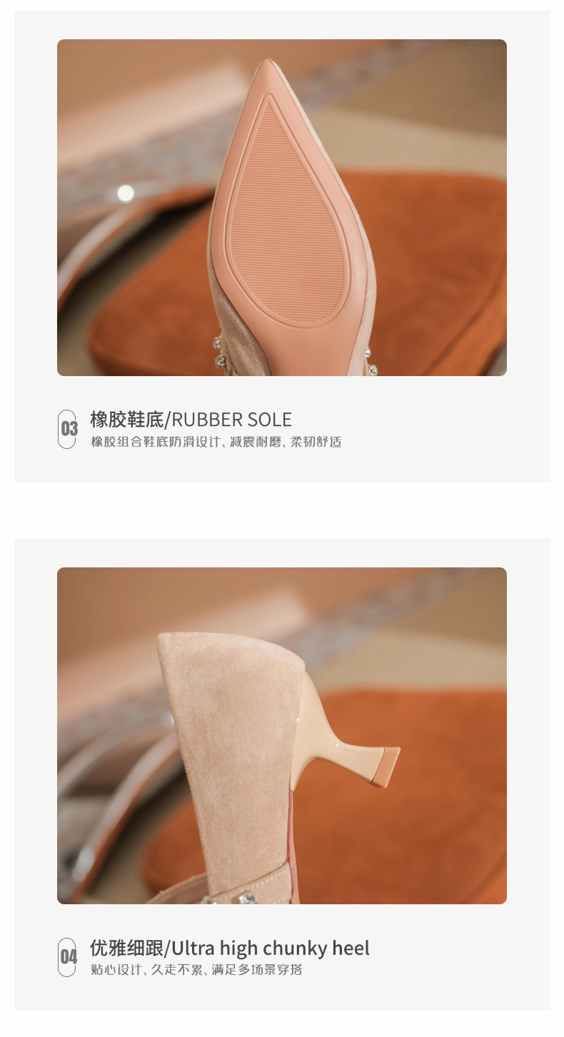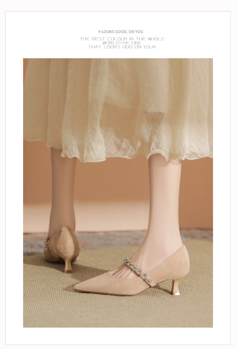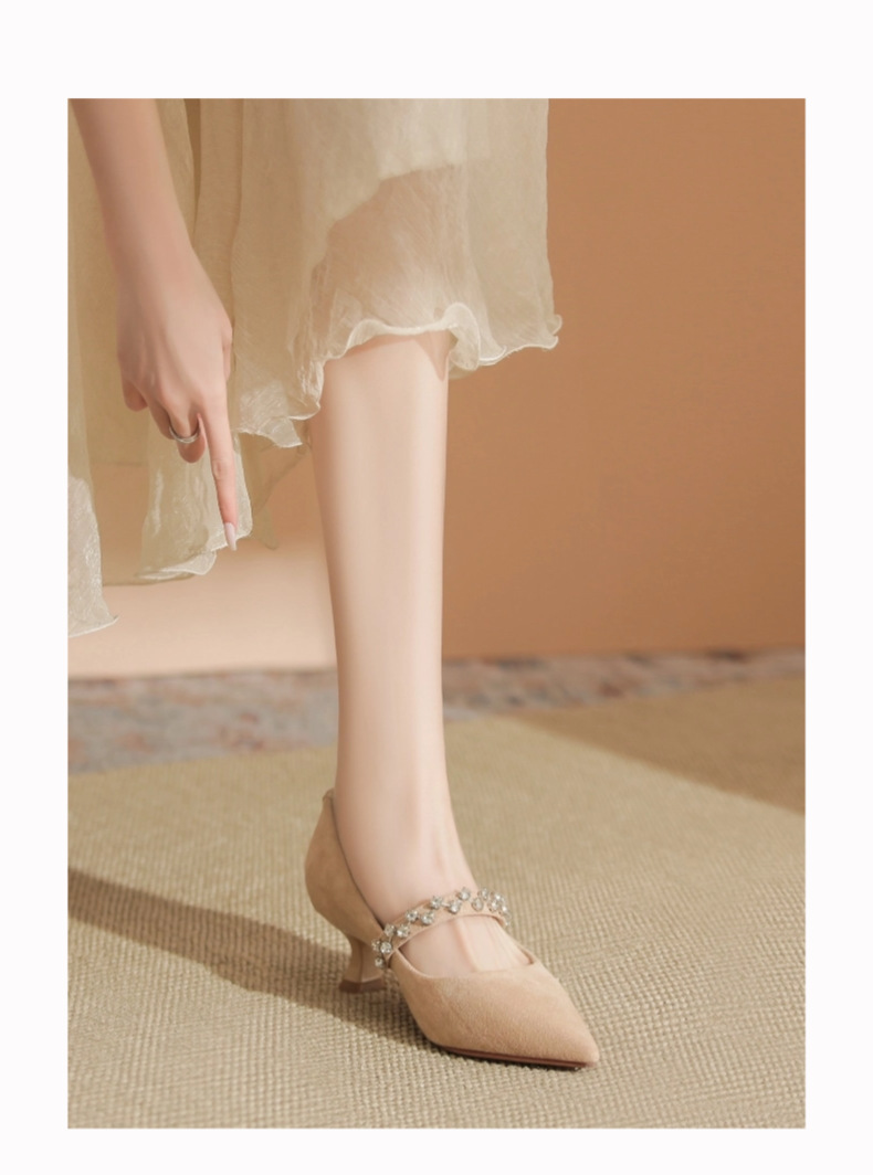 5000-1 스웨이드 싱글-얕은 하이힐, 라인스톤 포인티드 힐 여성 신발 편안한 싱글 레이어 신발