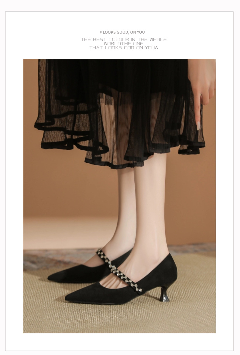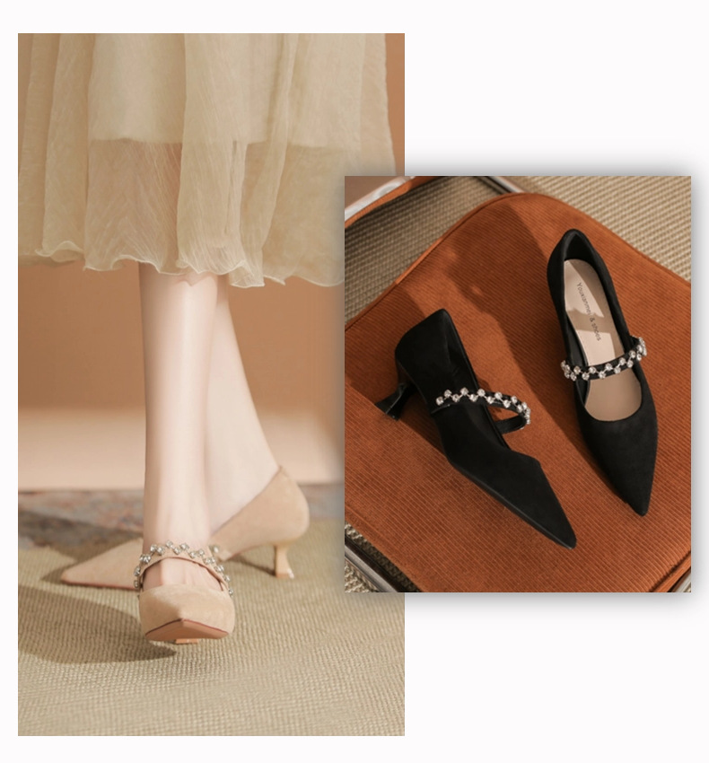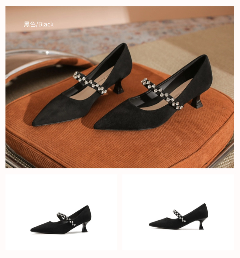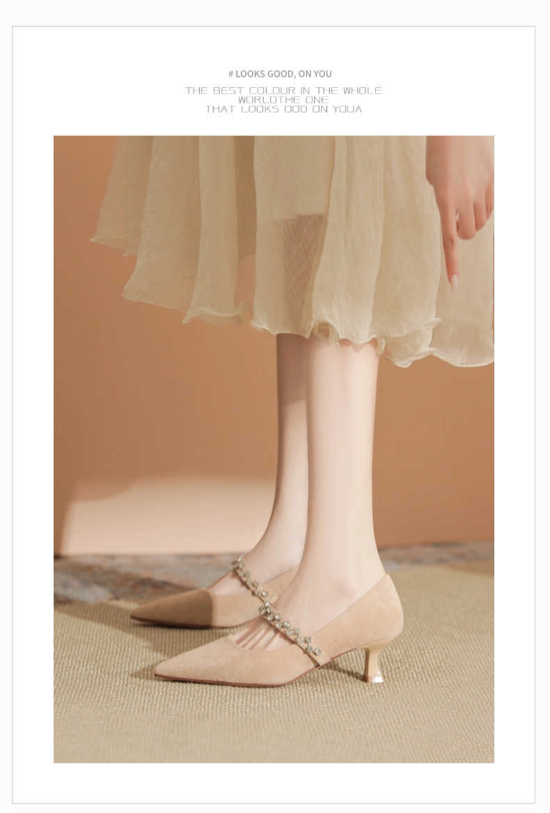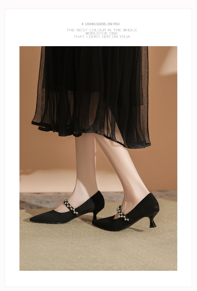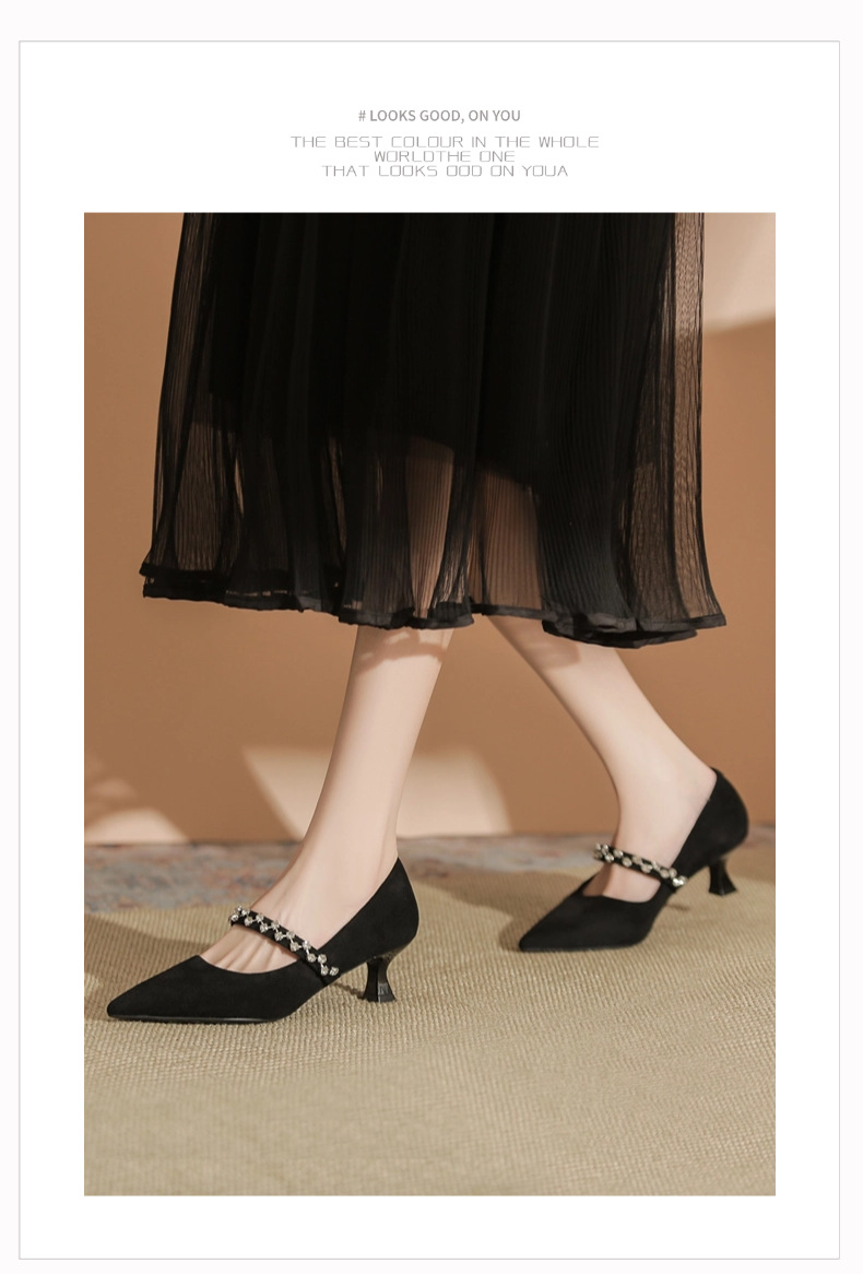 5000-1 스웨이드 싱글-얕은 하이힐, 라인스톤 포인티드 힐 여성 신발 편안한 싱글 레이어 신발스토어 가기