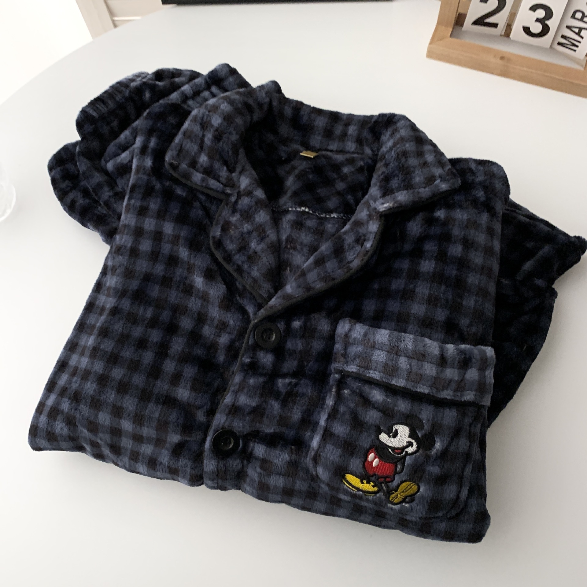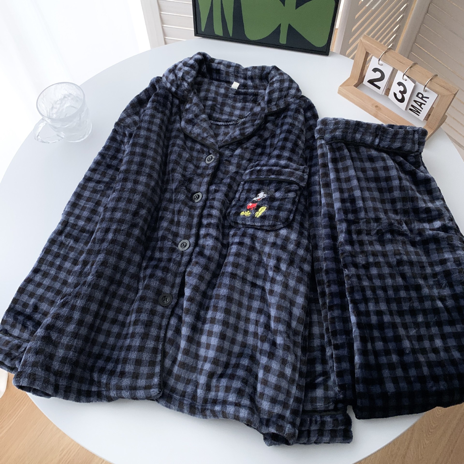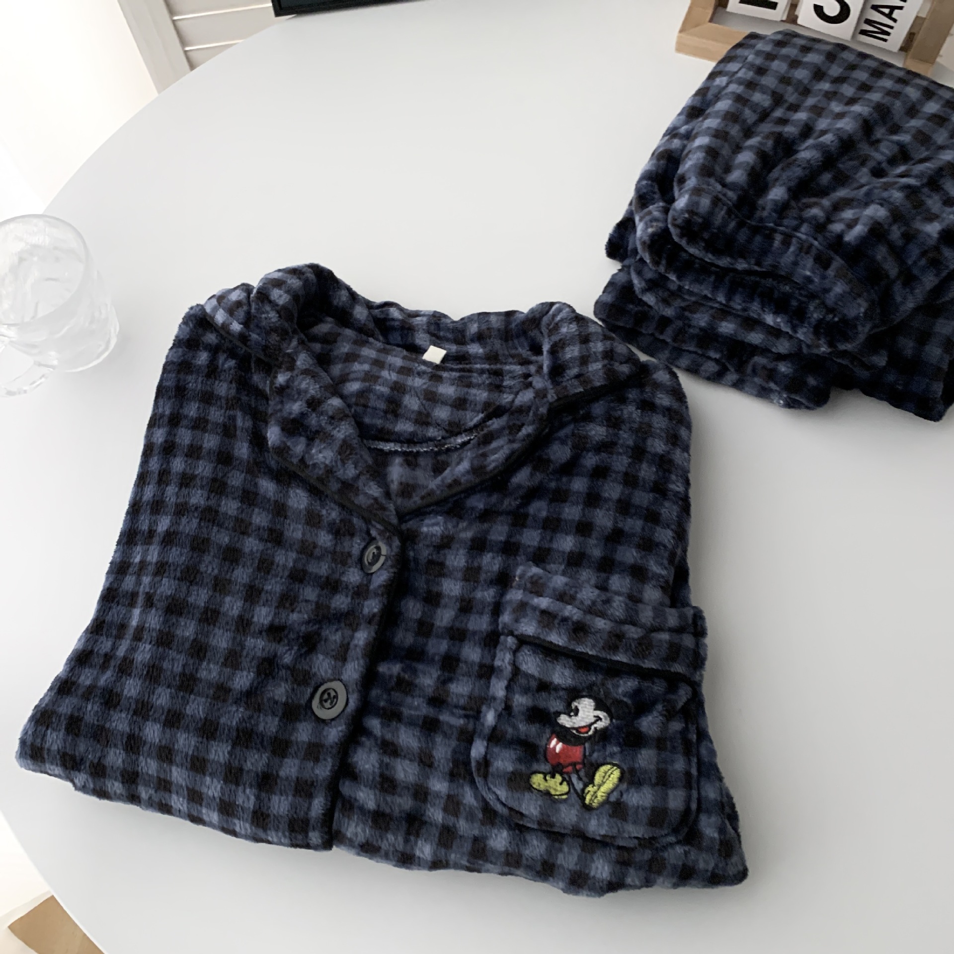 리얼 샷 # 격자 무늬 미키 플란넬 파자마 여성 겨울 커플 인터넷 인기 귀여운 일본 봄과 가을 홈 의류스토어 가기