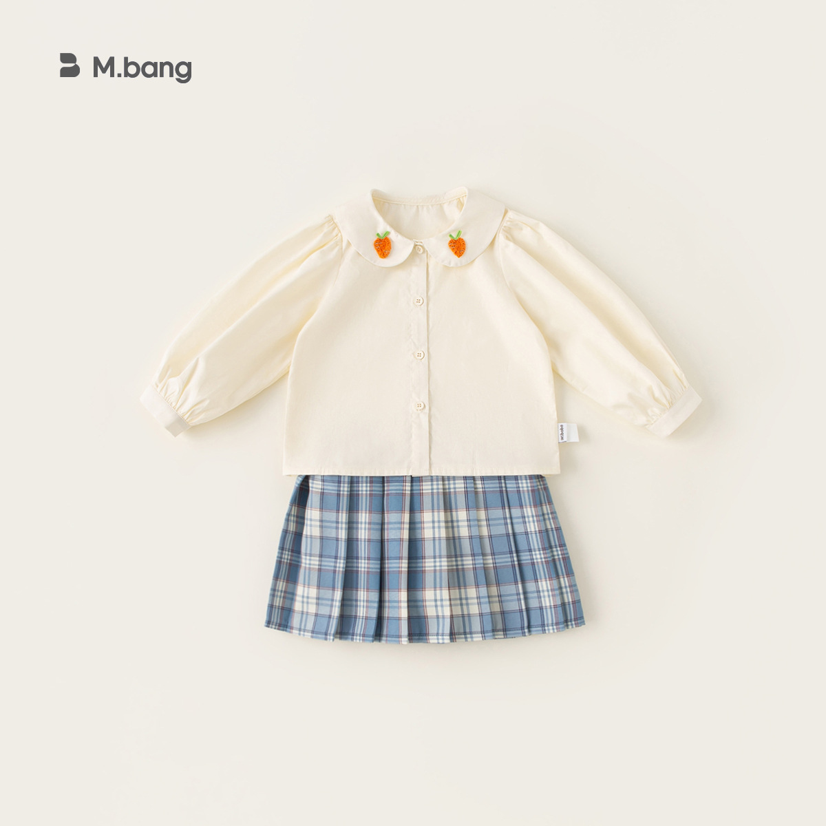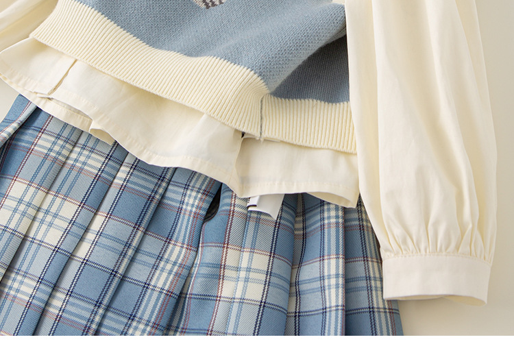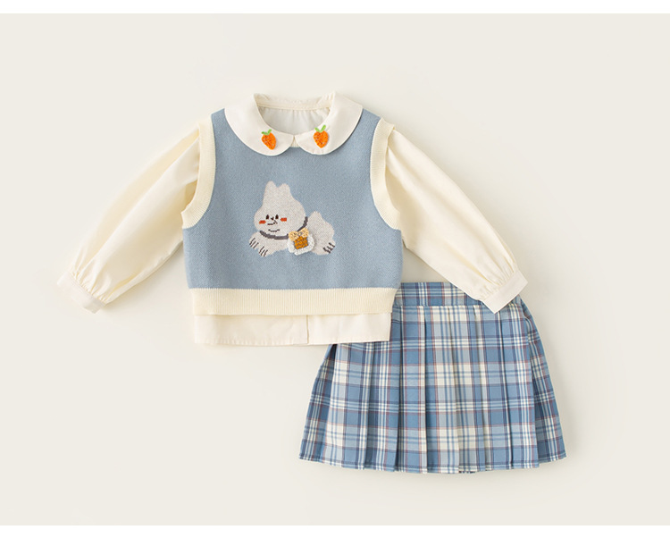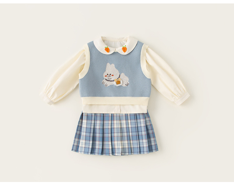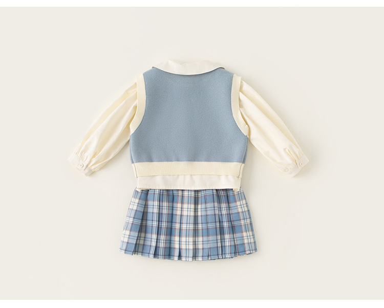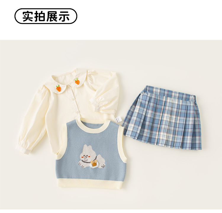 Yubao 아동복 소녀 세트 봄 새 여성 보물 니트 조끼 어린이 셔츠 격자 무늬 주름 치마 3 종 세트