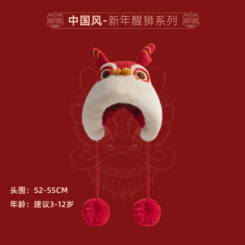 아기 사자 댄스 모자 새해 붉은 축제 중국 스타일 호랑이 머리 모자 귀여운 어린이 가을과 겨울 따뜻한 귀 보호 푹신한 모자