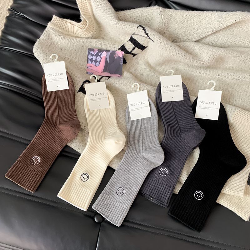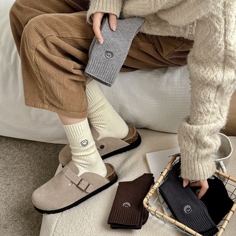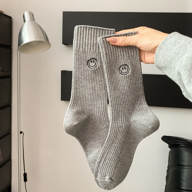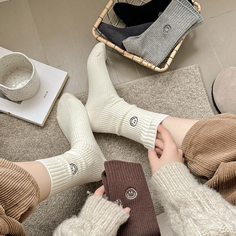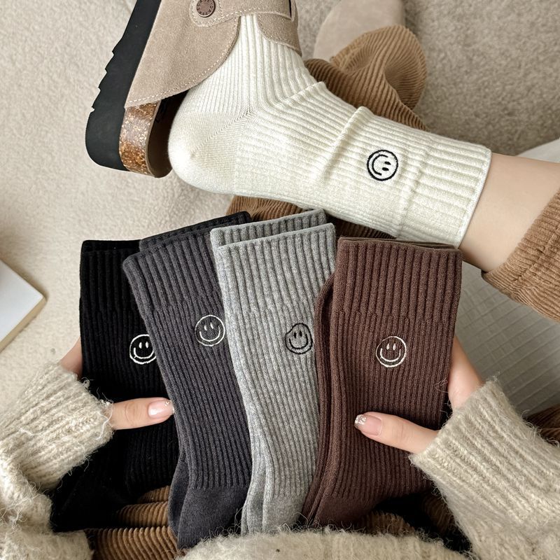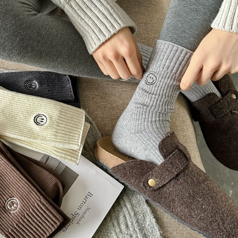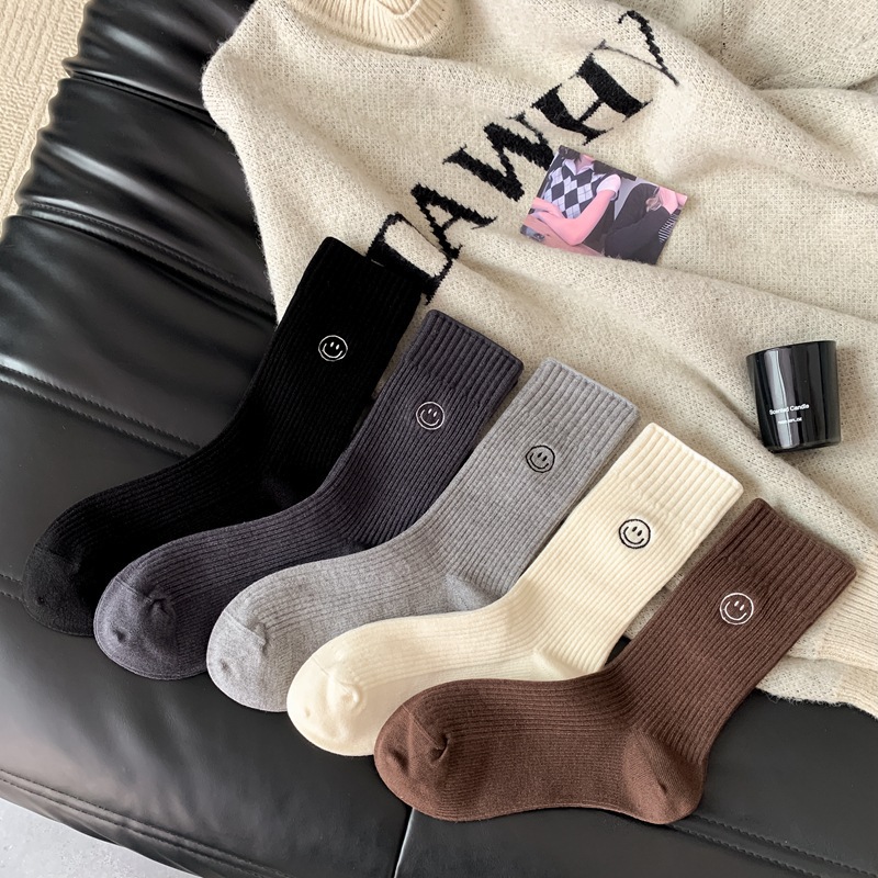 가을과 겨울 더블 니들 스포츠 레저 솔리드 컬러 스마일리 페이스 자수 따뜻한 두꺼운 캐시미어 한국식 중형 롱 배럴 스택 양말