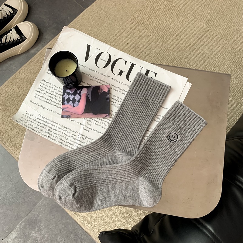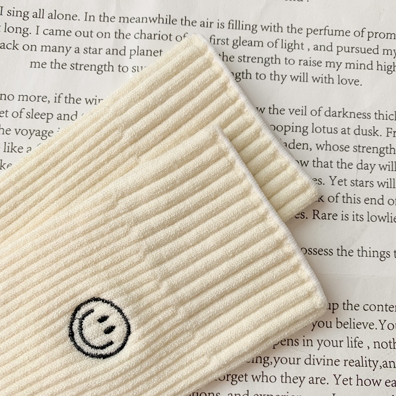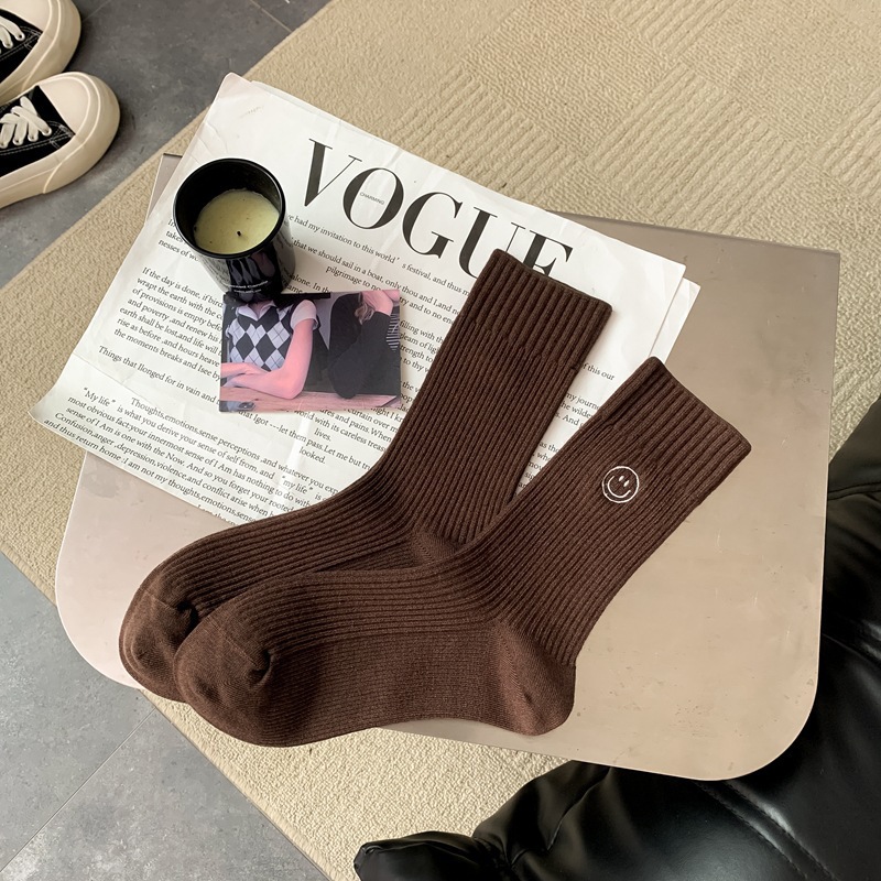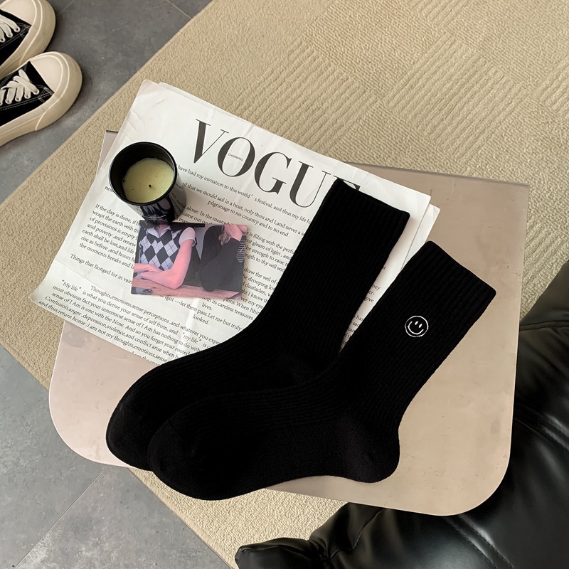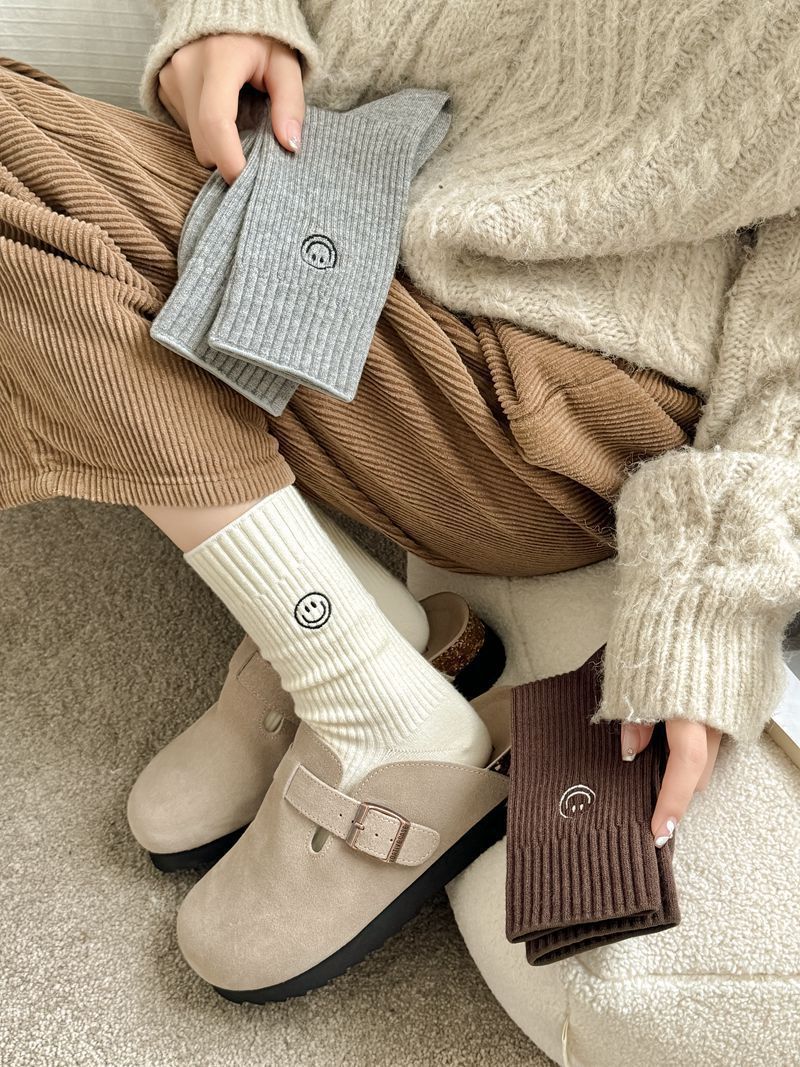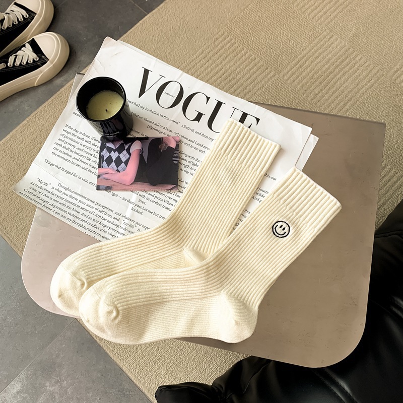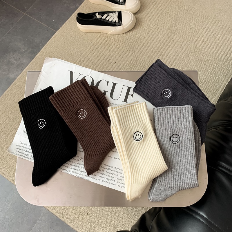 가을과 겨울 더블 니들 스포츠 레저 솔리드 컬러 스마일리 페이스 자수 따뜻한 두꺼운 캐시미어 한국식 중형 롱 배럴 스택 양말