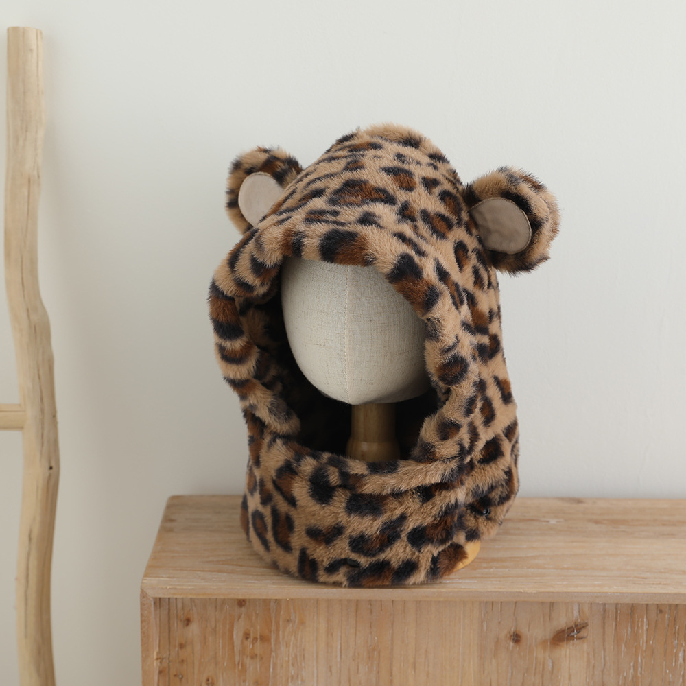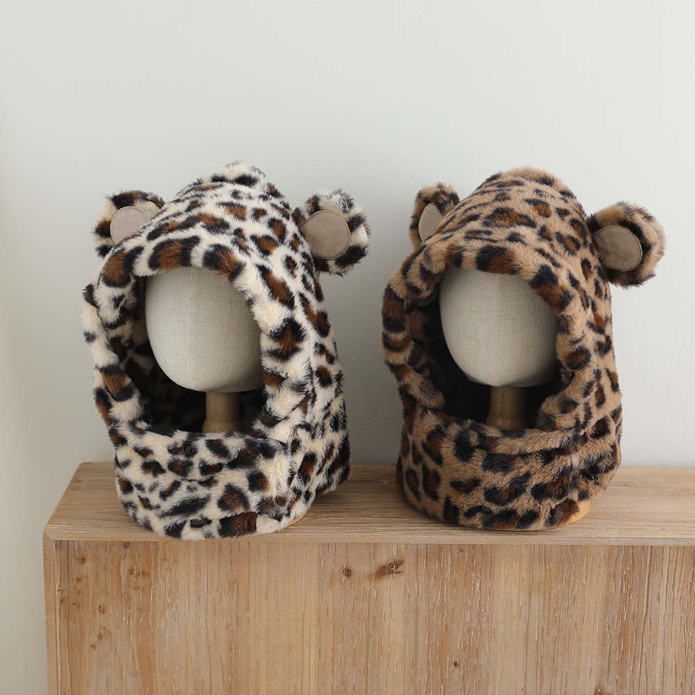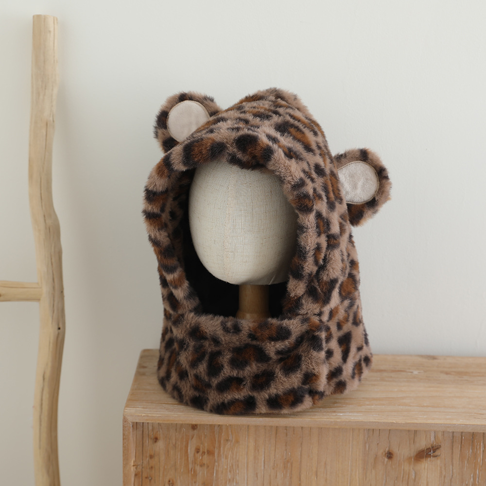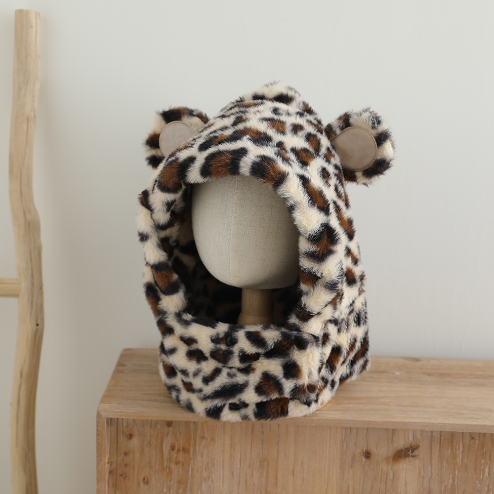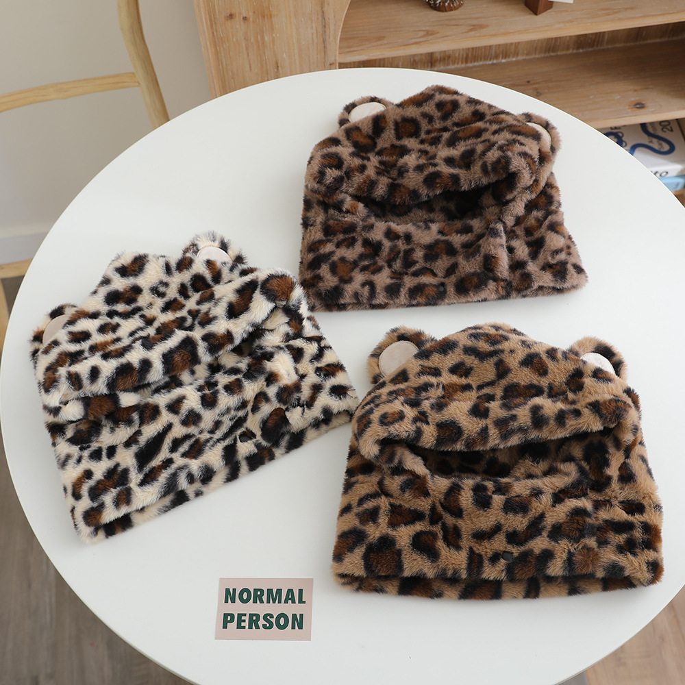 한국 어린이의 부드러운 밀랍 레오파드 무늬 스카프 모자 올인원 따뜻하고 세련된 외국식 베일 플러시 귀 보호 모자 레이 펑 모자