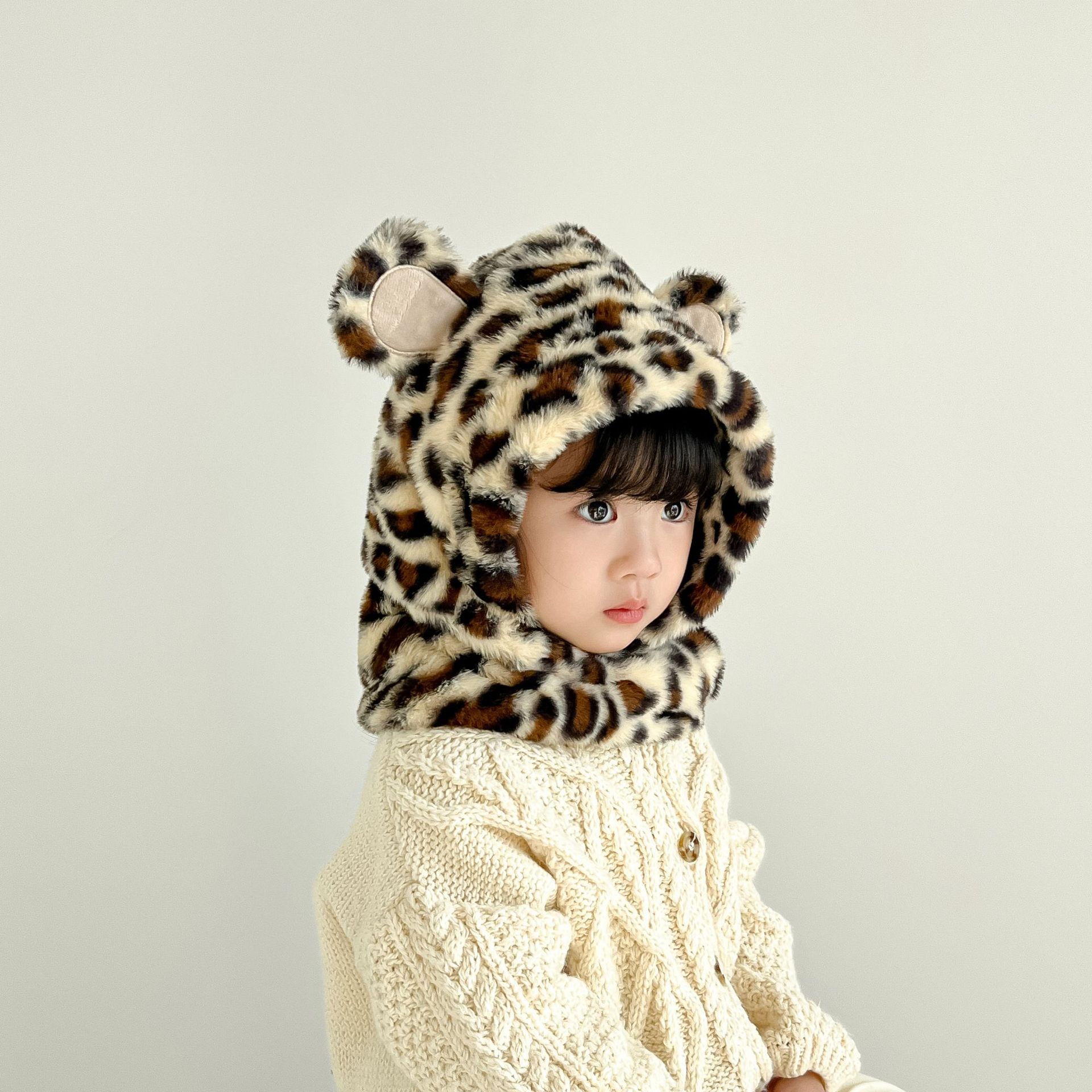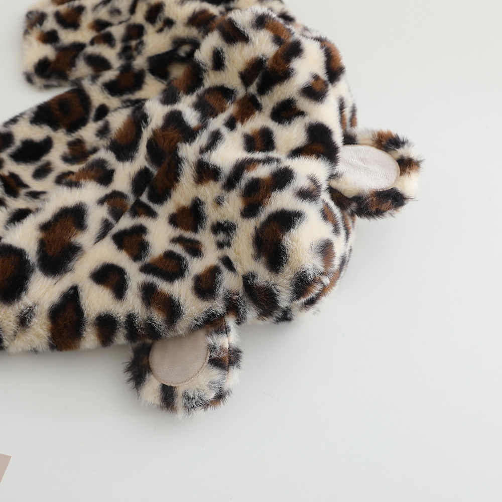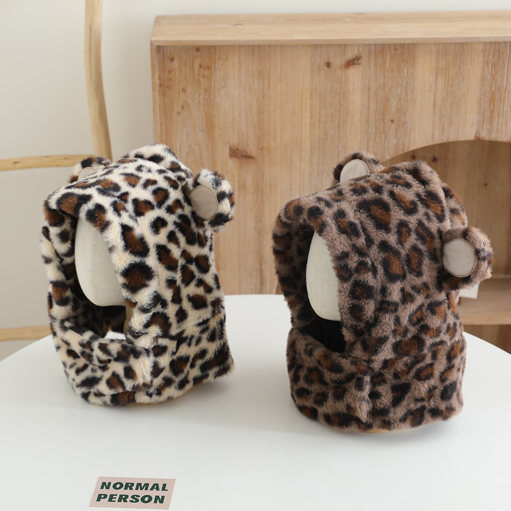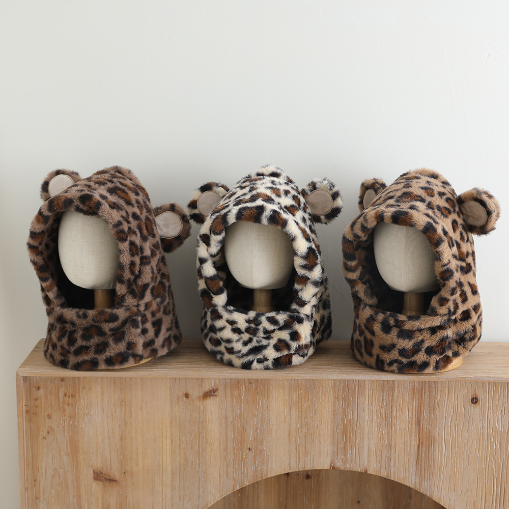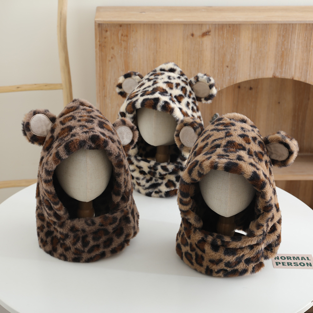 한국 어린이의 부드러운 밀랍 레오파드 무늬 스카프 모자 올인원 따뜻하고 세련된 외국식 베일 플러시 귀 보호 모자 레이 펑 모자