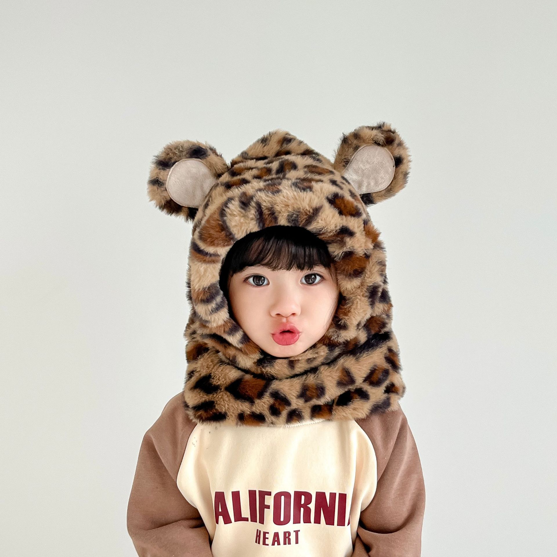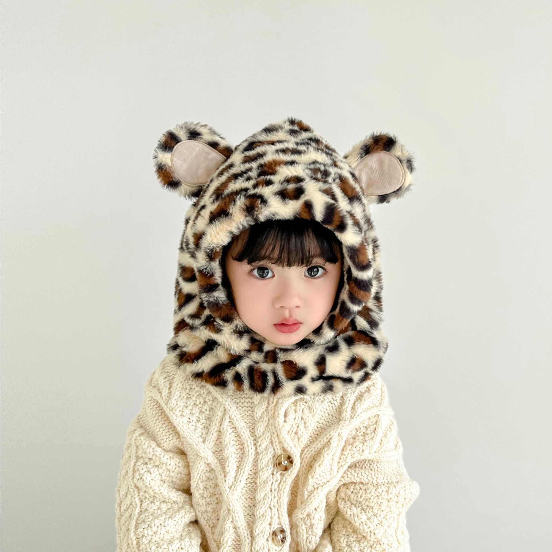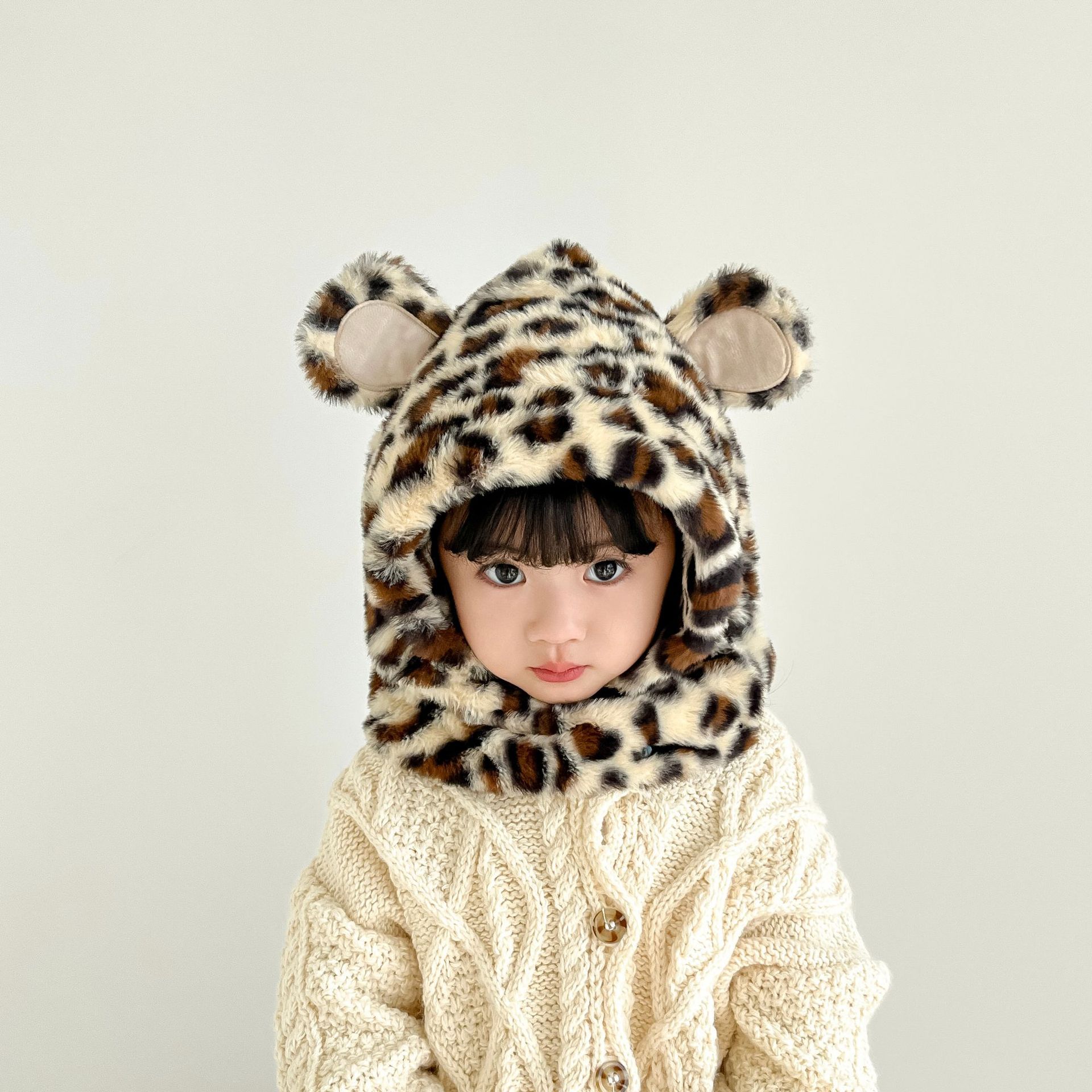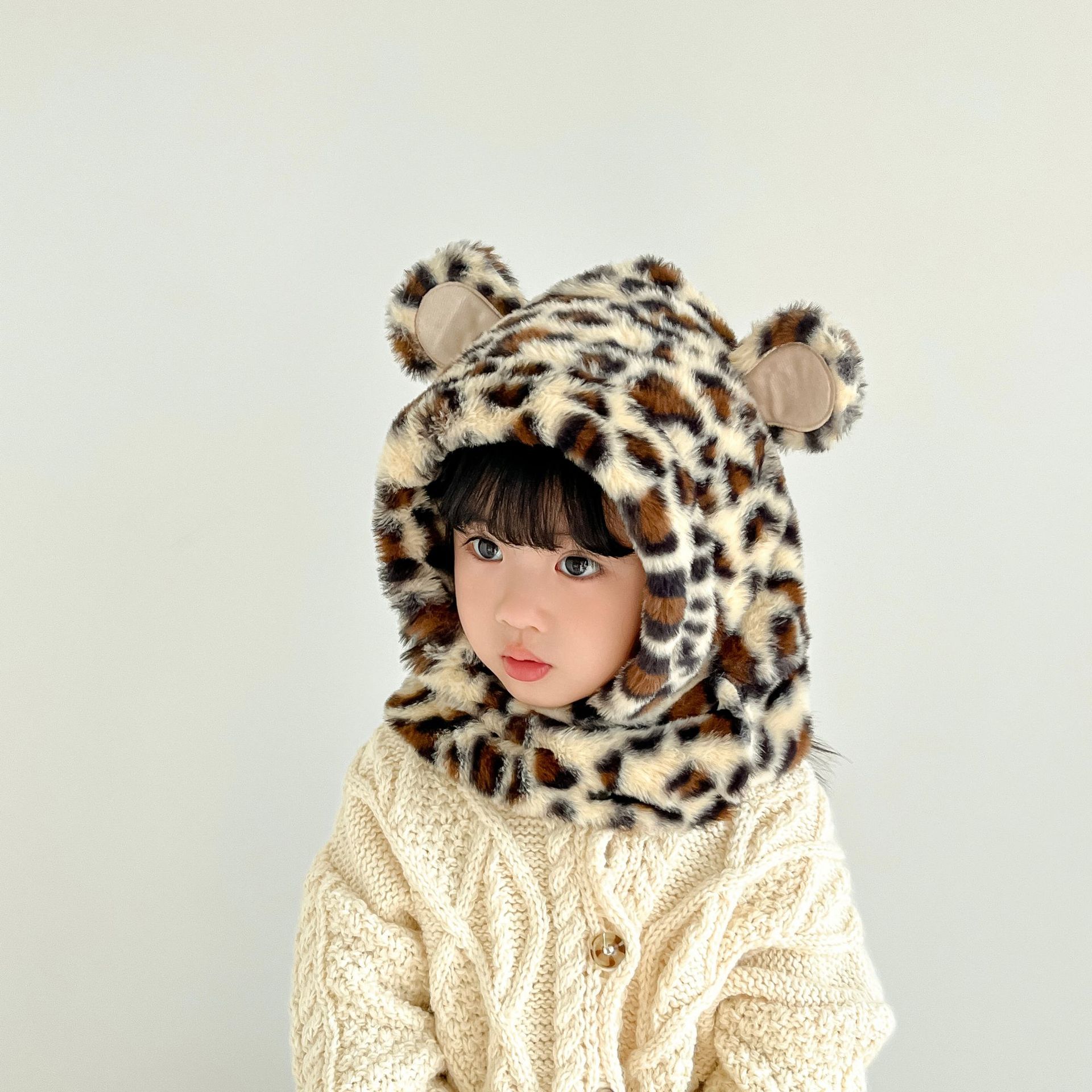 한국 어린이의 부드러운 밀랍 레오파드 무늬 스카프 모자 올인원 따뜻하고 세련된 외국식 베일 플러시 귀 보호 모자 레이 펑 모자