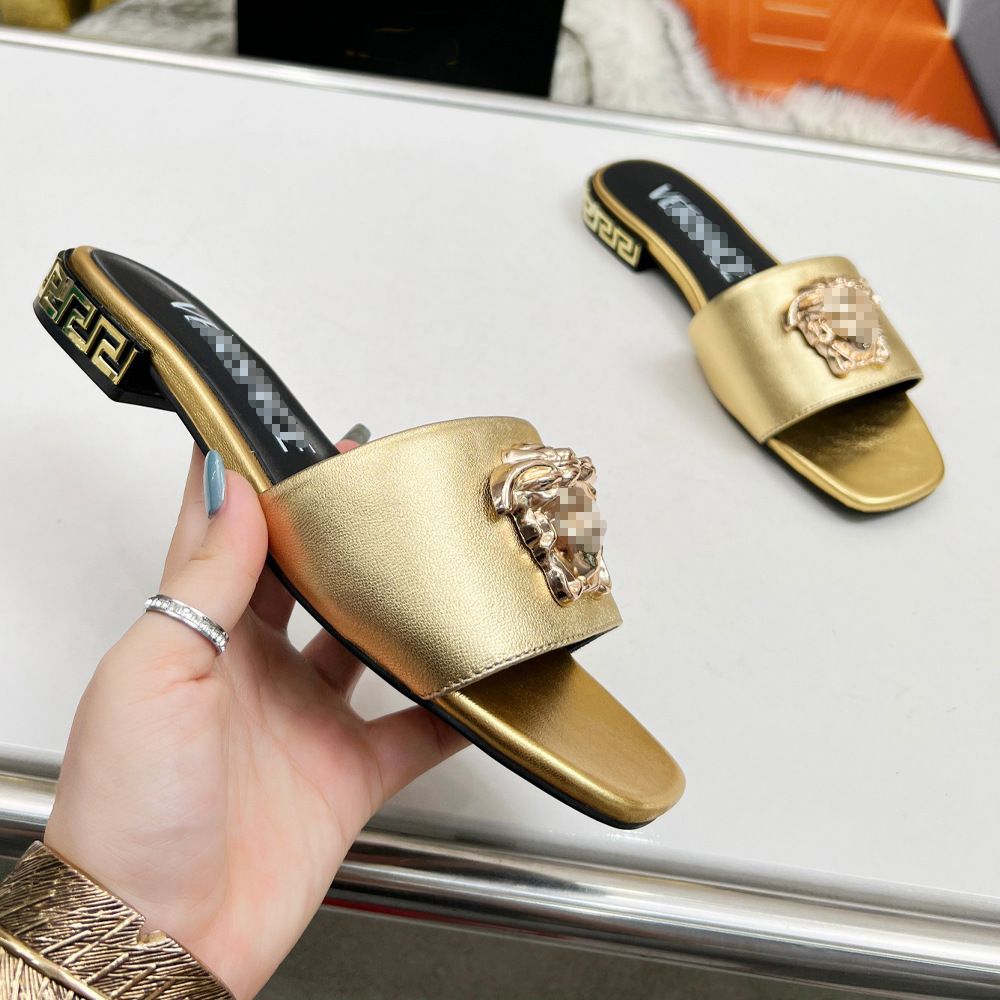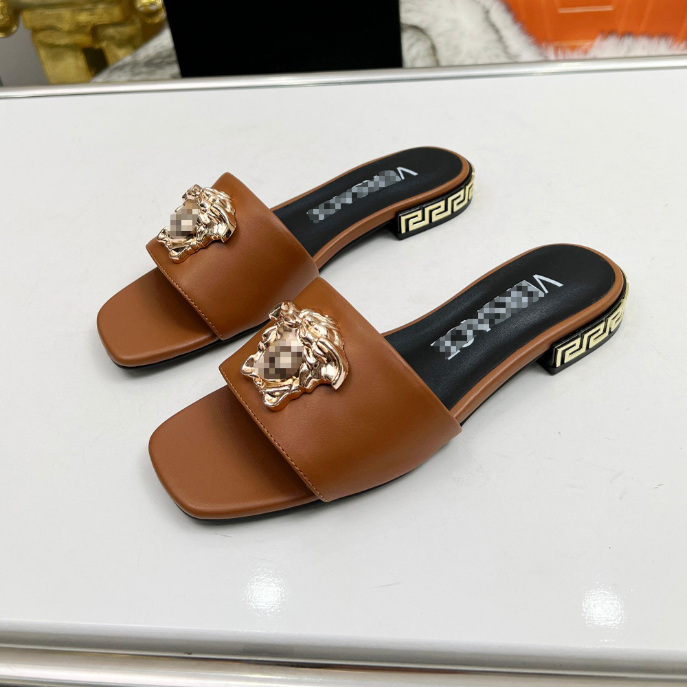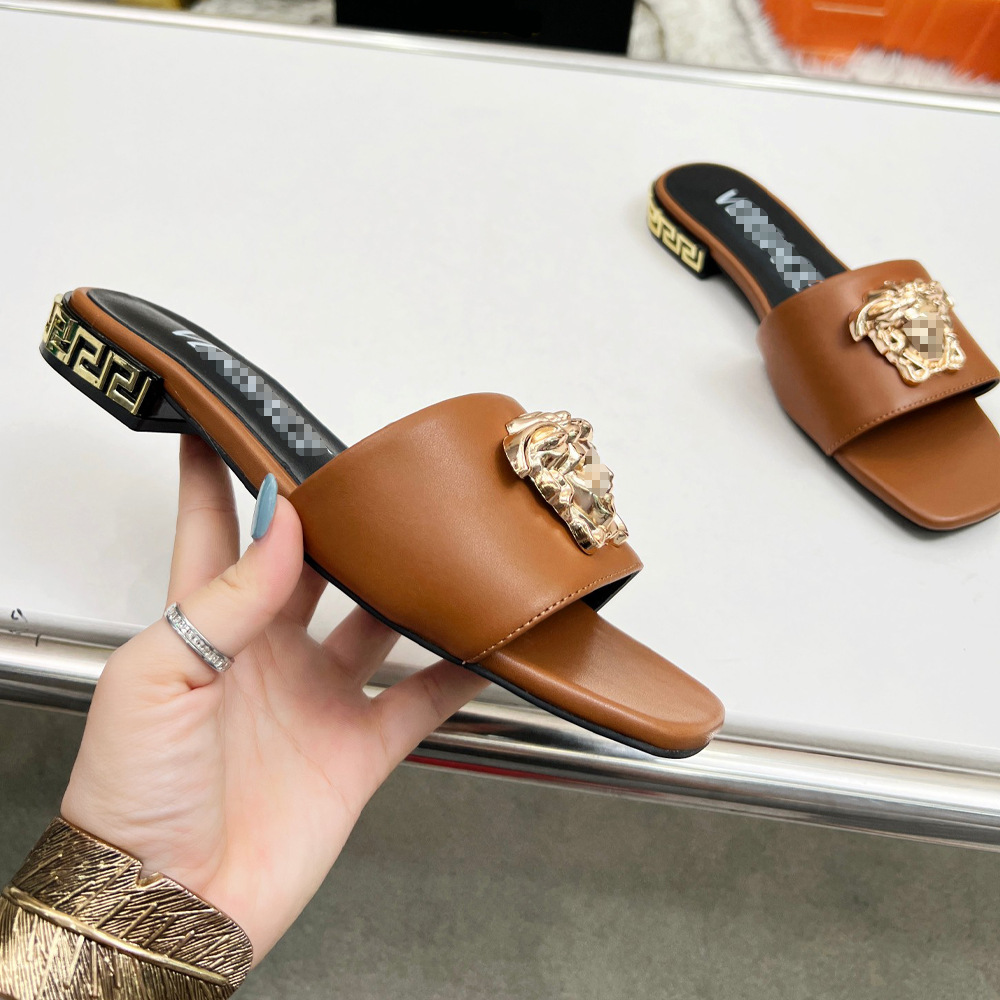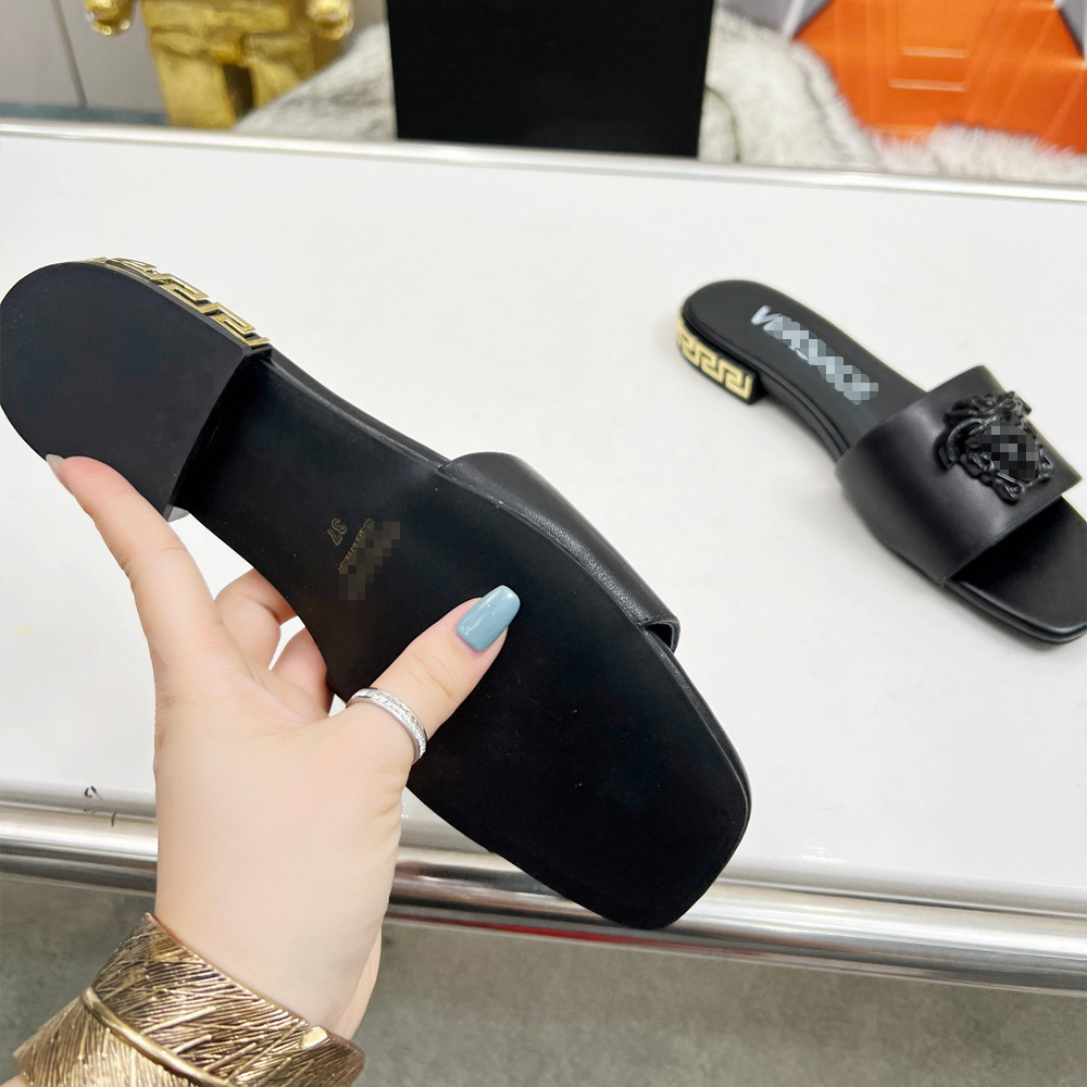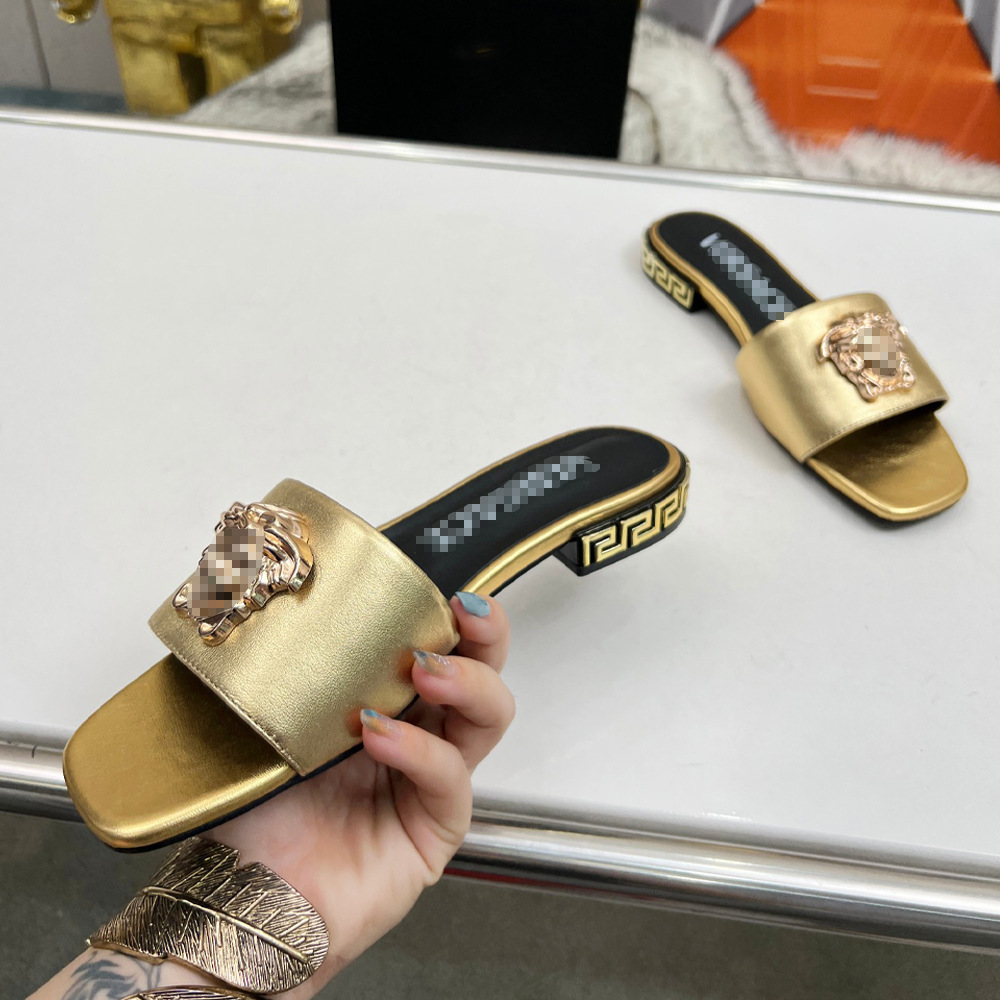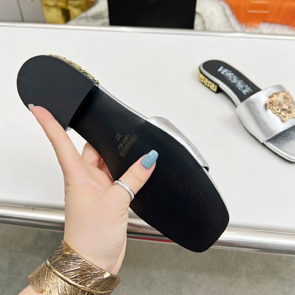정품 가죽 패션 샌들 2024 새로운 뷰티 헤드 레터 메탈 홀리데이 비치 슬리퍼 유럽, 미국 및 중동 국경 조수스토어 가기