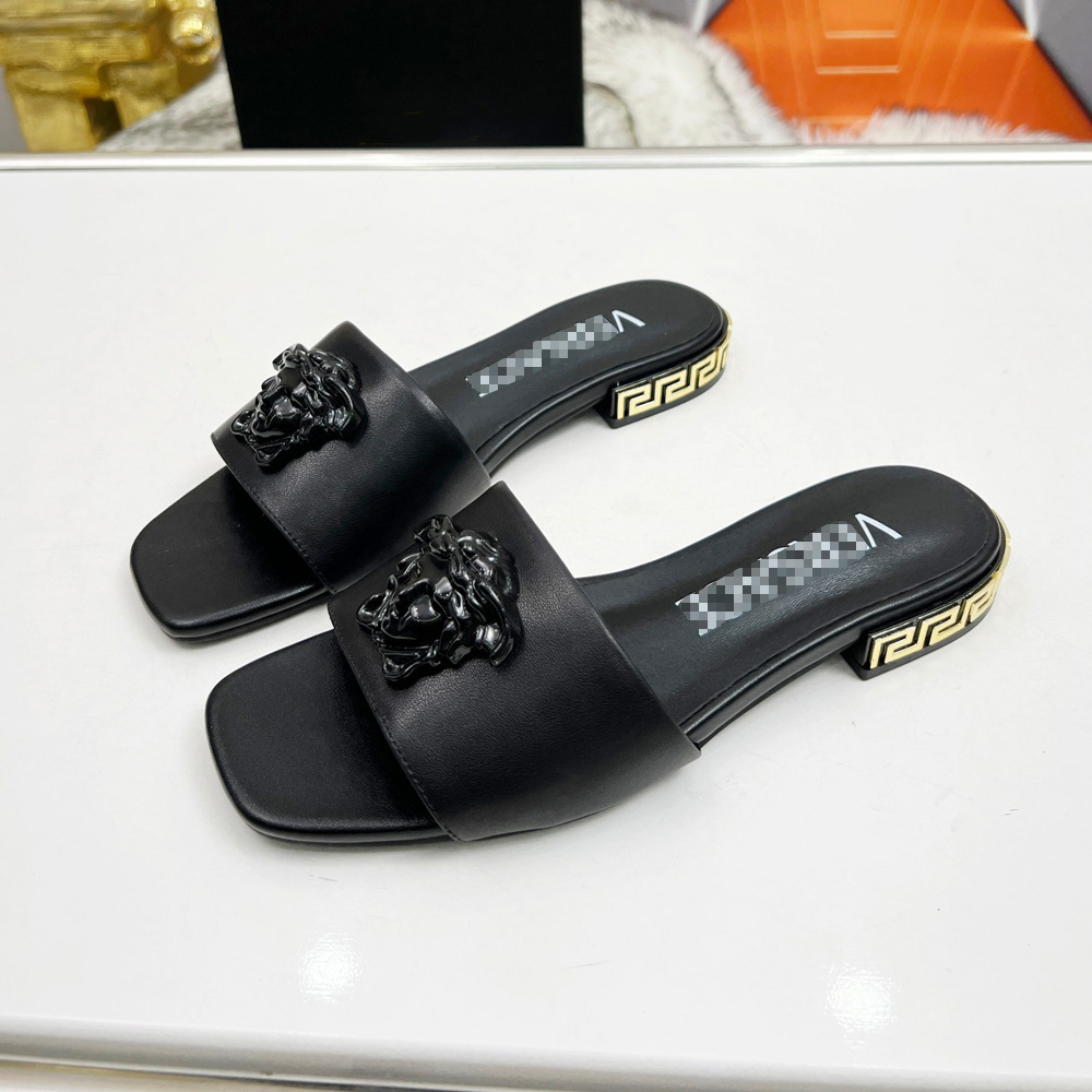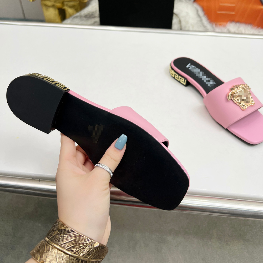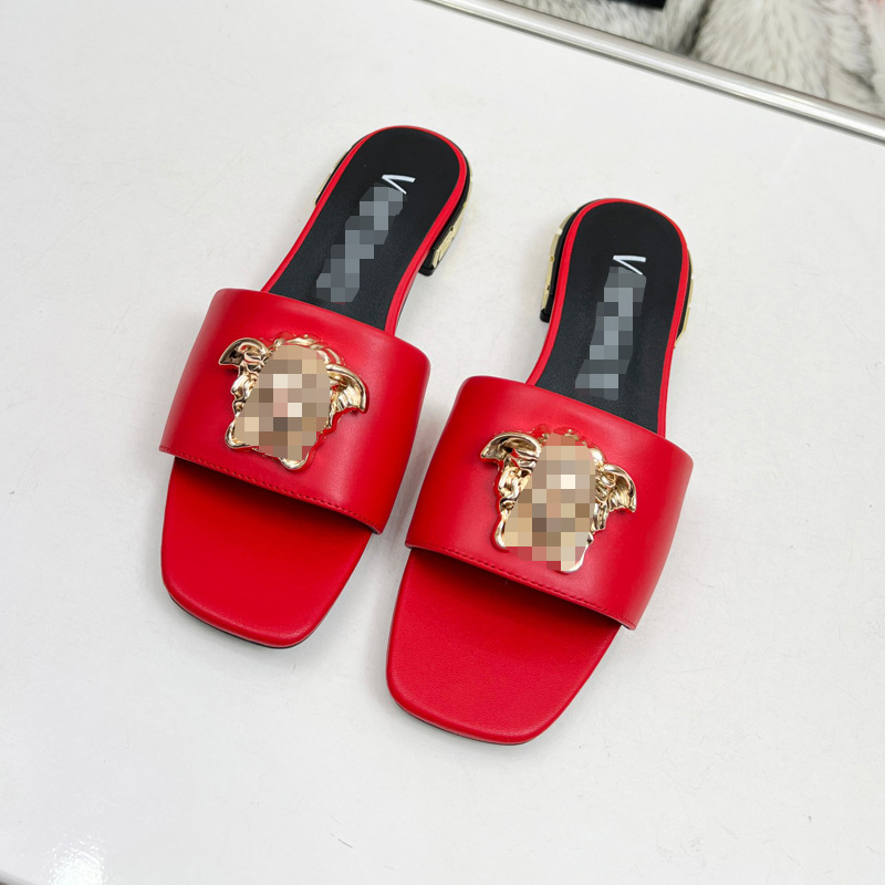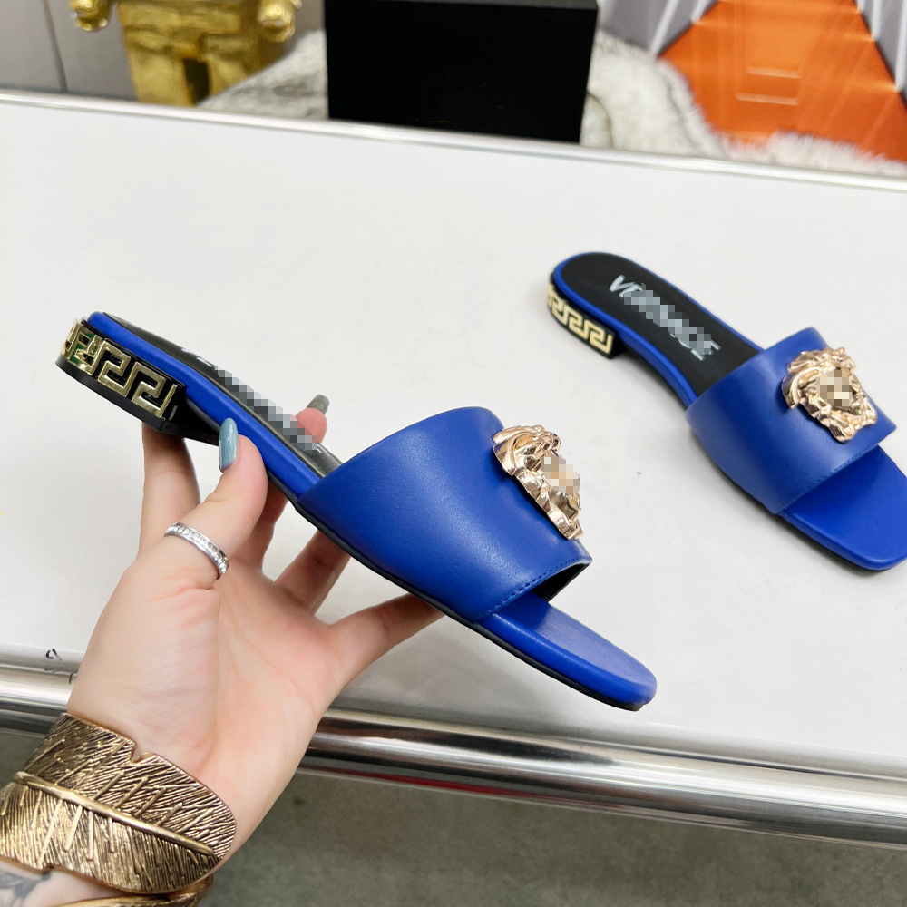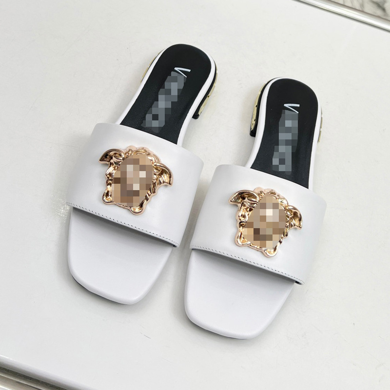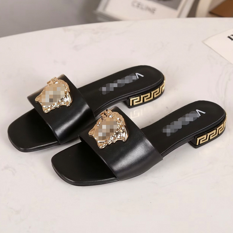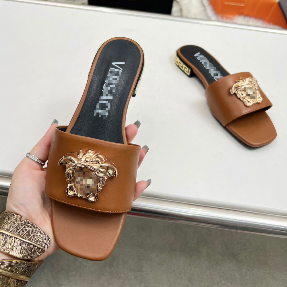 정품 가죽 패션 샌들 2024 새로운 뷰티 헤드 레터 메탈 홀리데이 비치 슬리퍼 유럽, 미국 및 중동 국경 조수스토어 가기