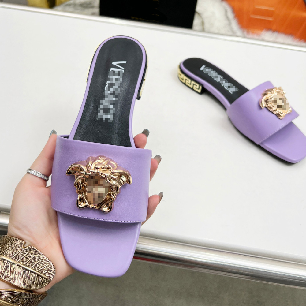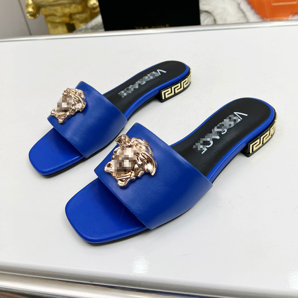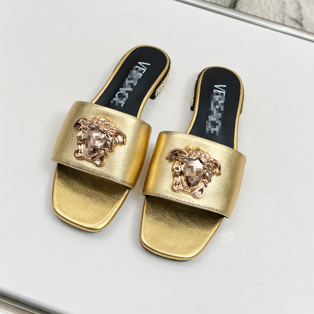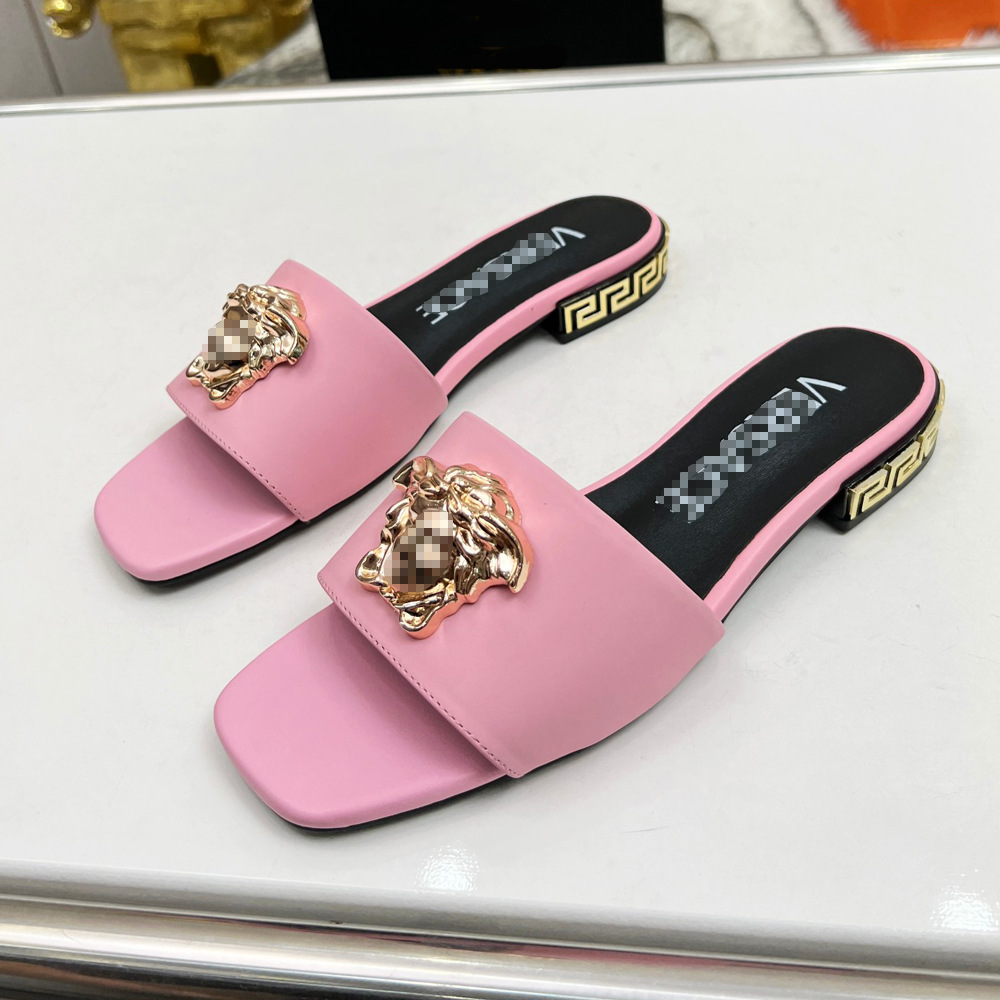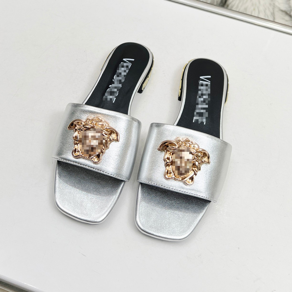 정품 가죽 패션 샌들 2024 새로운 뷰티 헤드 레터 메탈 홀리데이 비치 슬리퍼 유럽, 미국 및 중동 국경 조수스토어 가기