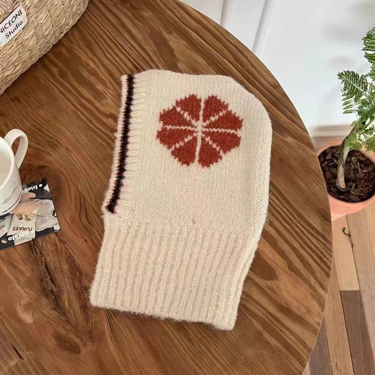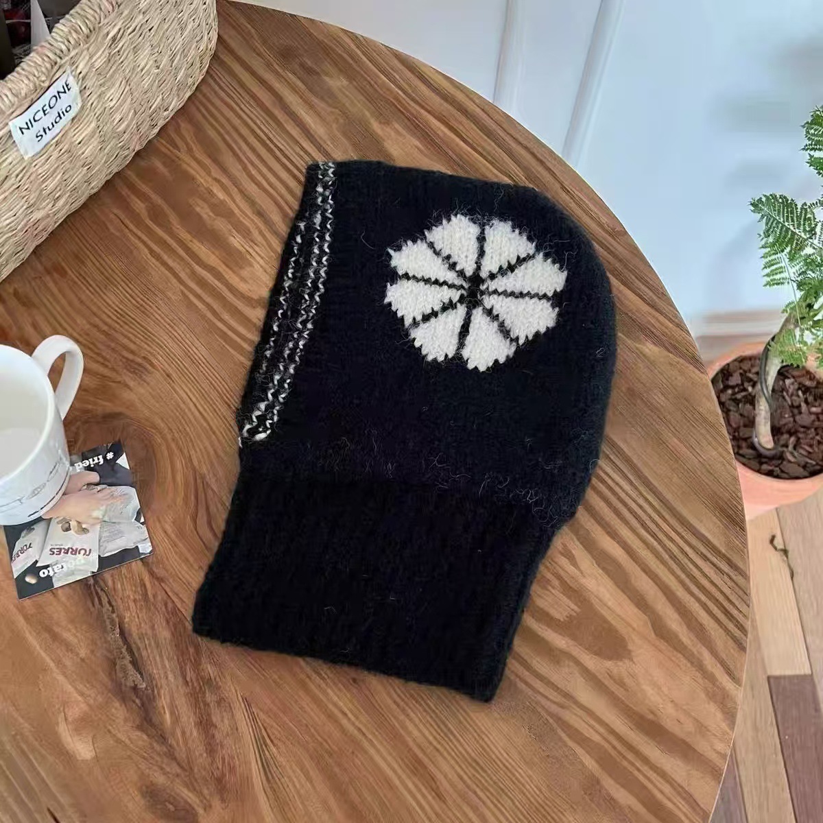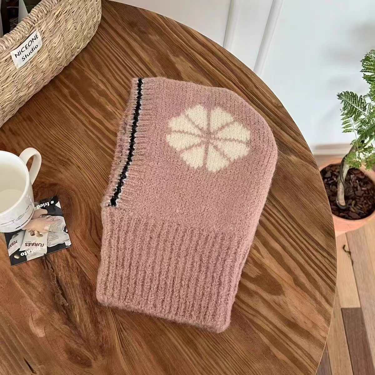 韩版ins 儿童拉法帽时尚花朵针织帽冬季保暖毛线帽围脖护耳一体帽