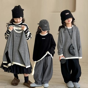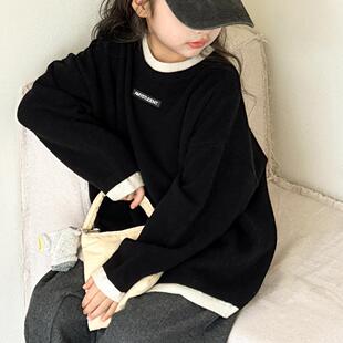 女童毛衣2024秋冬新款中大童假两件圆领套头羊毛混纺洋气儿童上衣