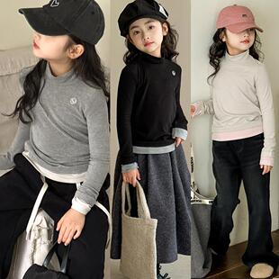 女童打底衫秋冬洋气儿童假两件长袖体恤冬季中大童内搭半高领上衣