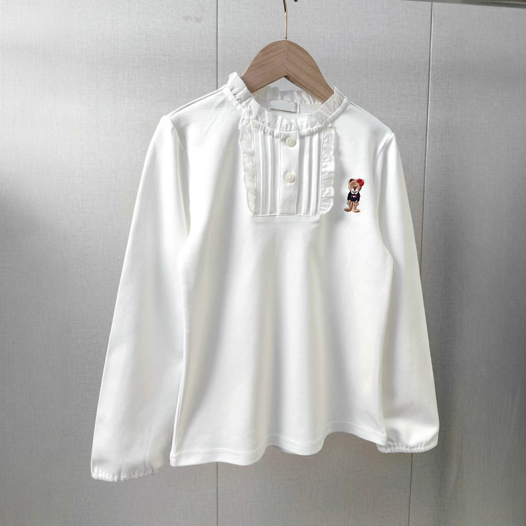재고 소녀베이스 셔츠 25 년 봄 중년 어린이 곰팡이 레이스 칼라 단색 양면 긴팔 기본 티셔츠