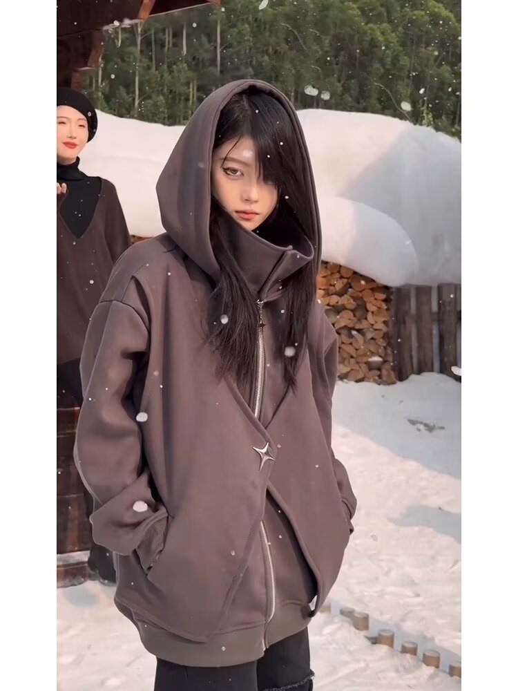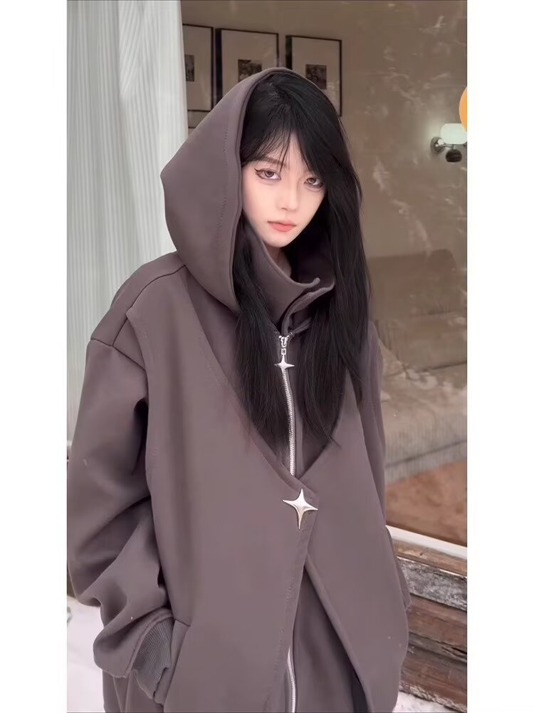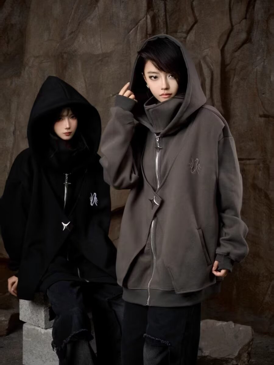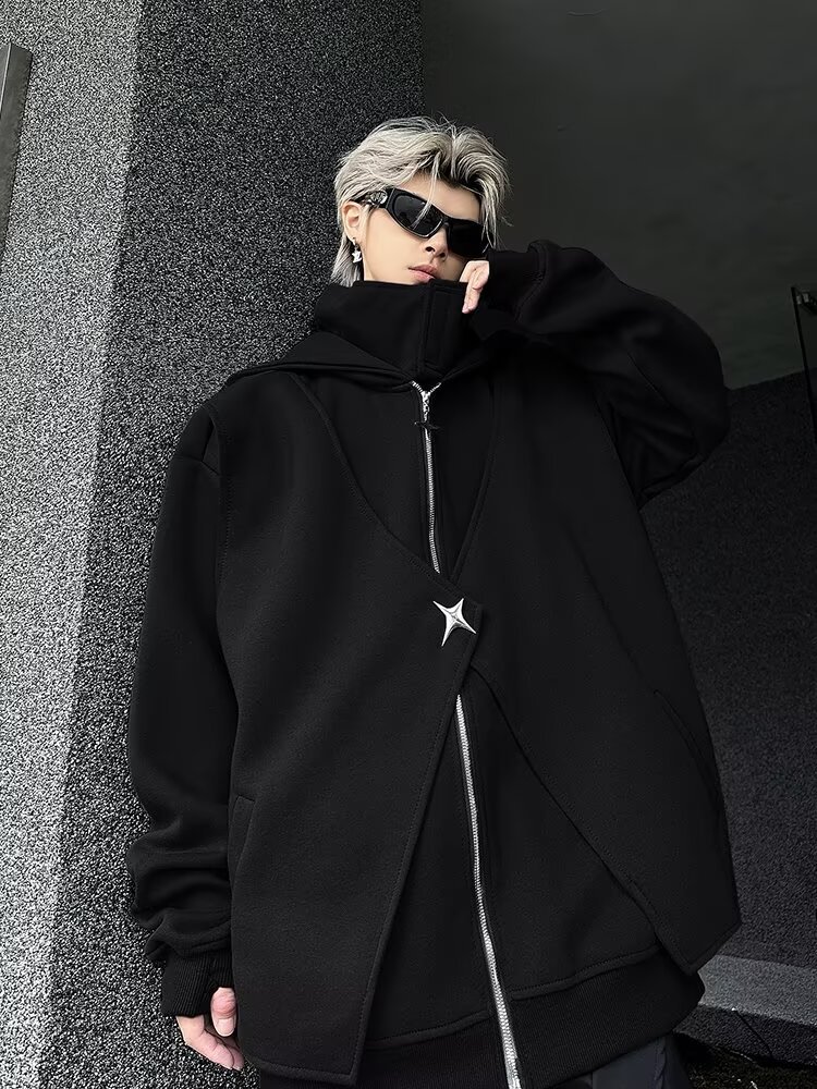 아메리칸 스타일 스웨터 트렌디 한 카디건 스웨터 남자 가을과 겨울 높은 칼라 가짜 두 헤비 하이 스트리트 커플 후드 재킷