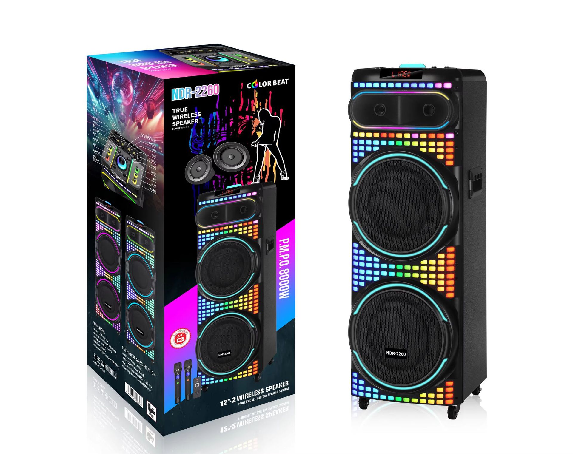 Functions: USB,TF,BT,TWS,FM, foam, color box, universal wheel