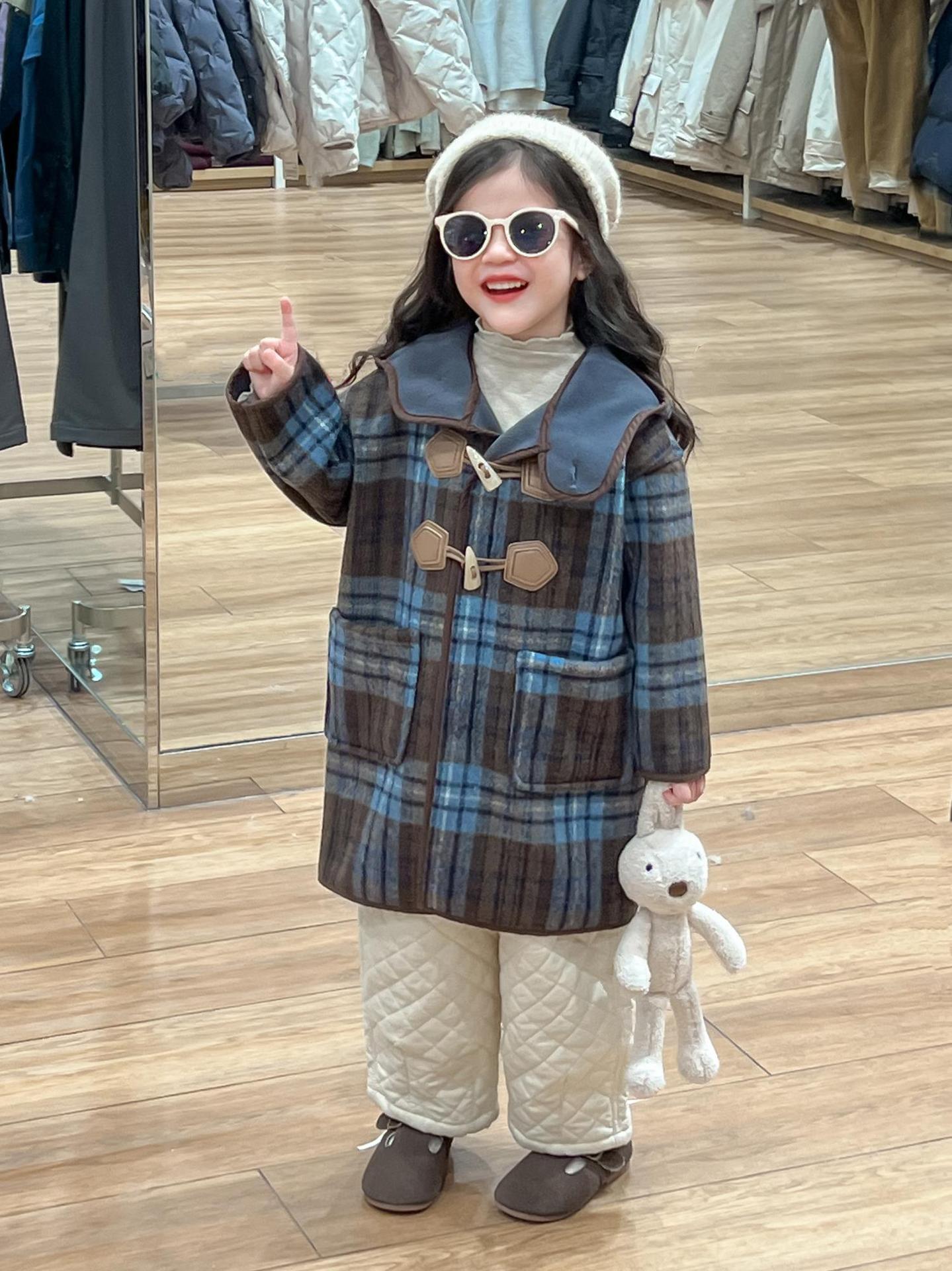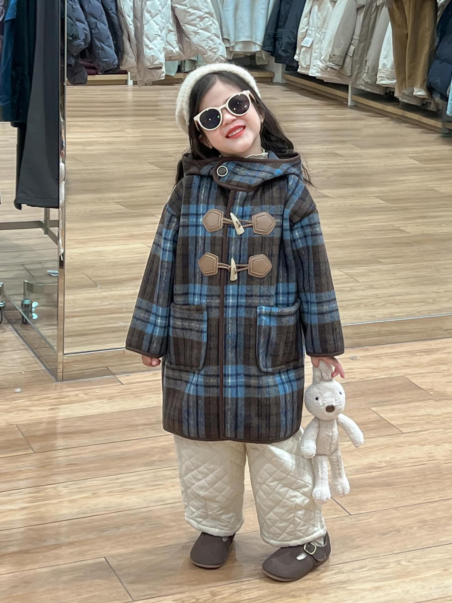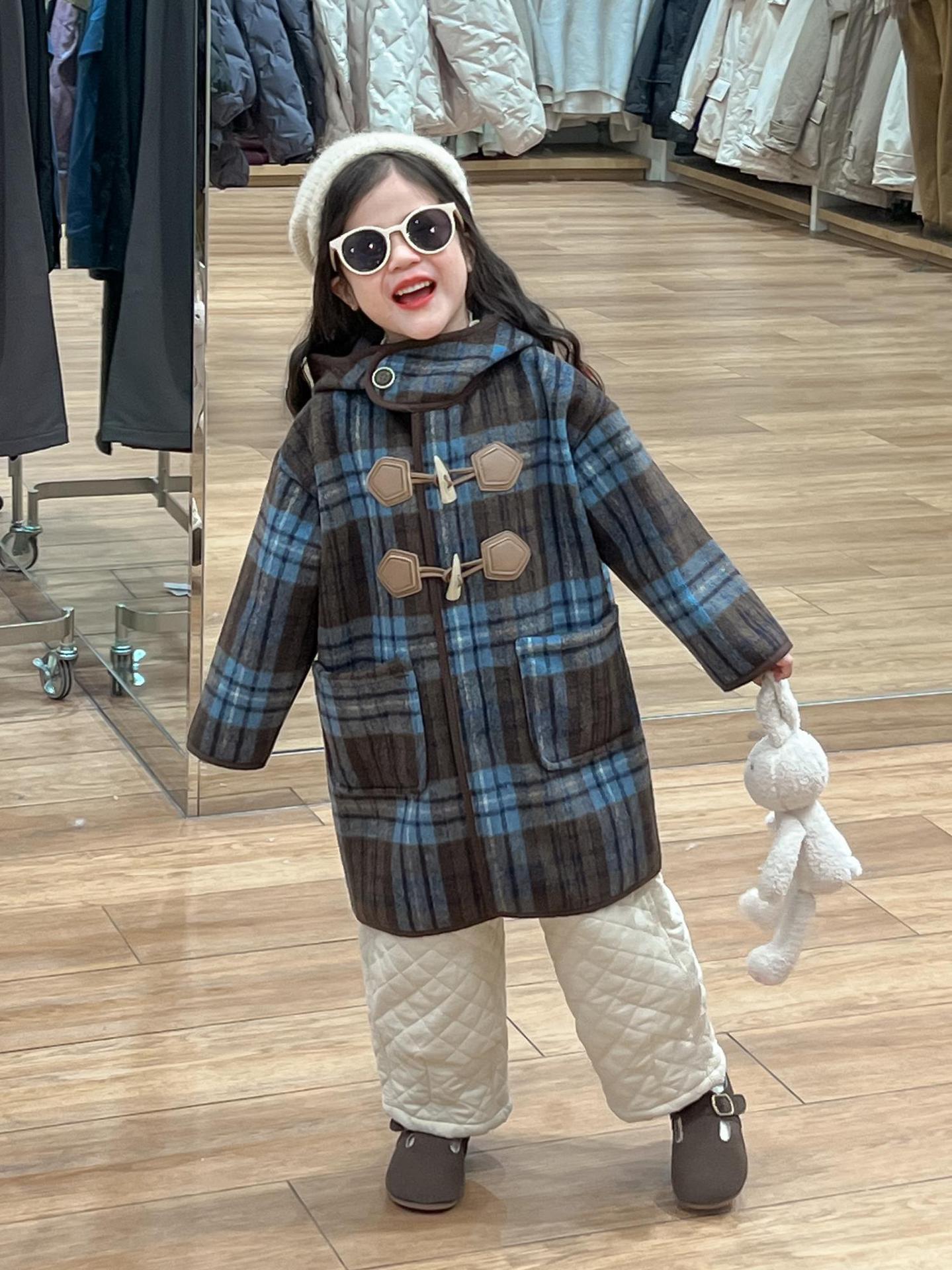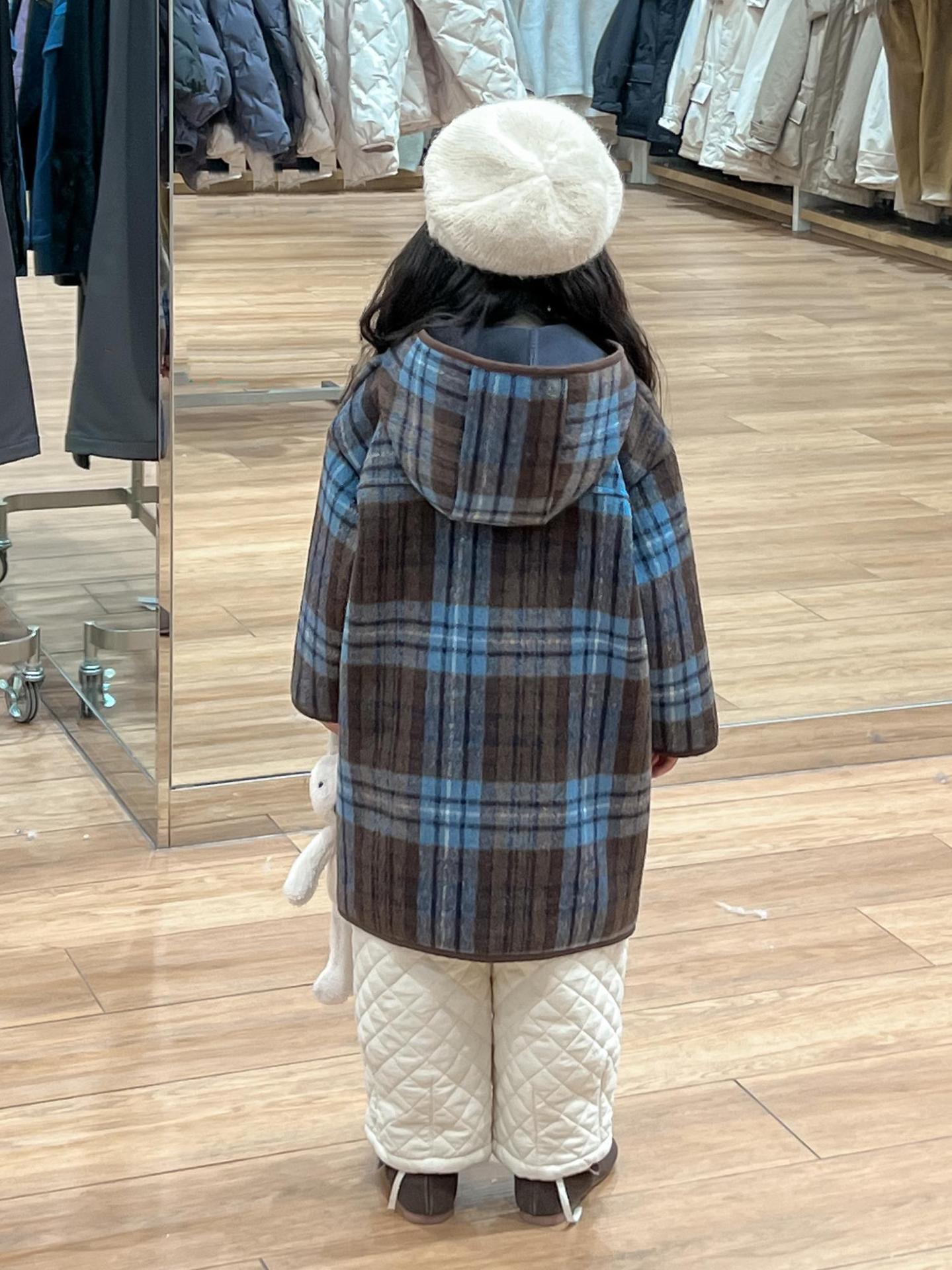 2024 겨울 소녀의 빈티지 칼리지 스타일 블루 지 아오 벨벳 중간 길이의 루즈 후드 두꺼운 울 코트 코트스토어 가기