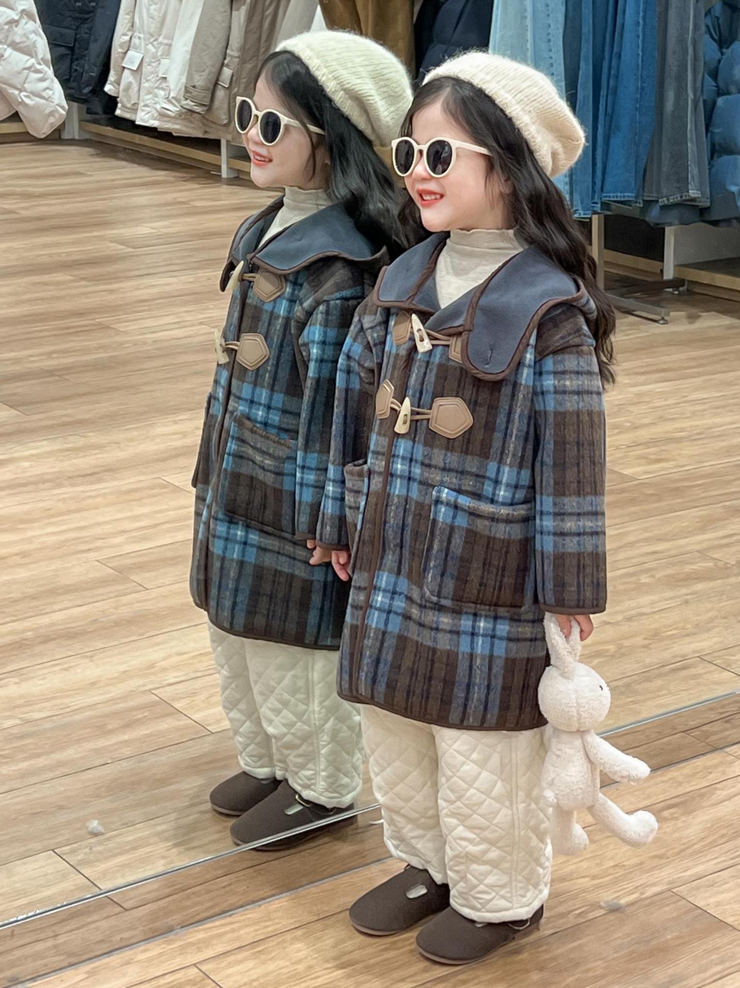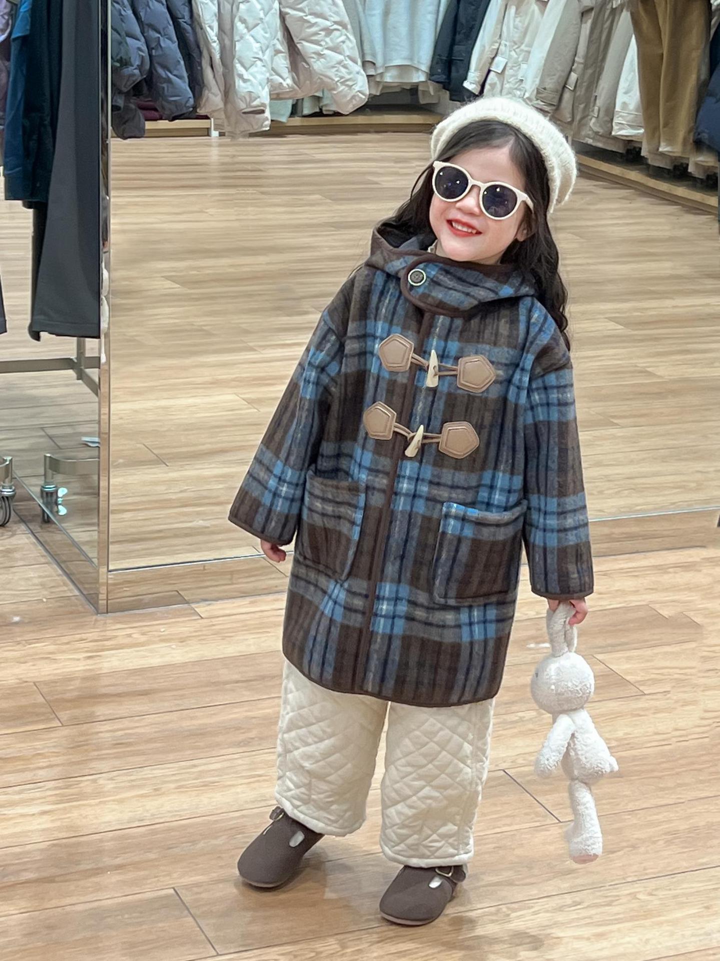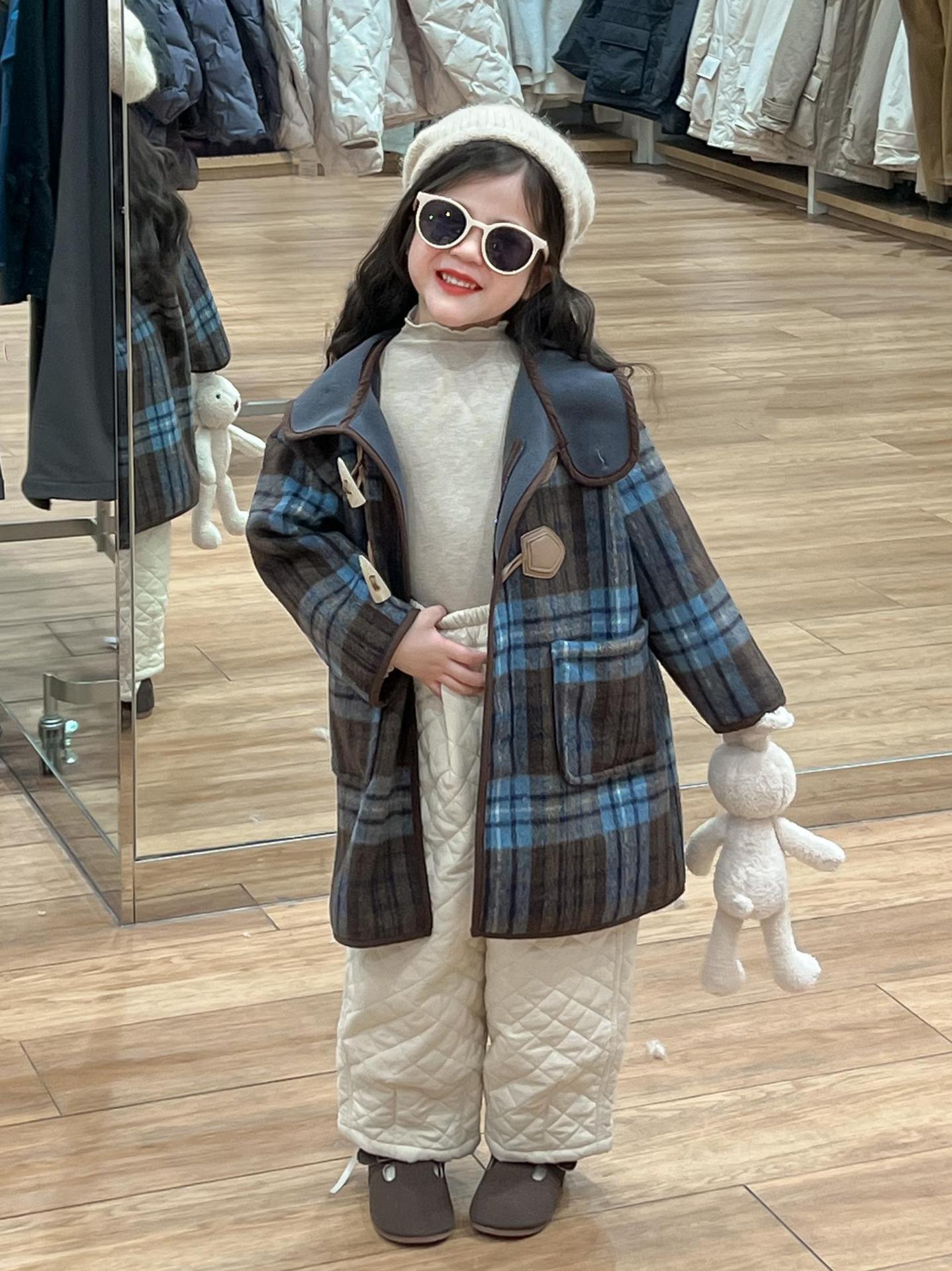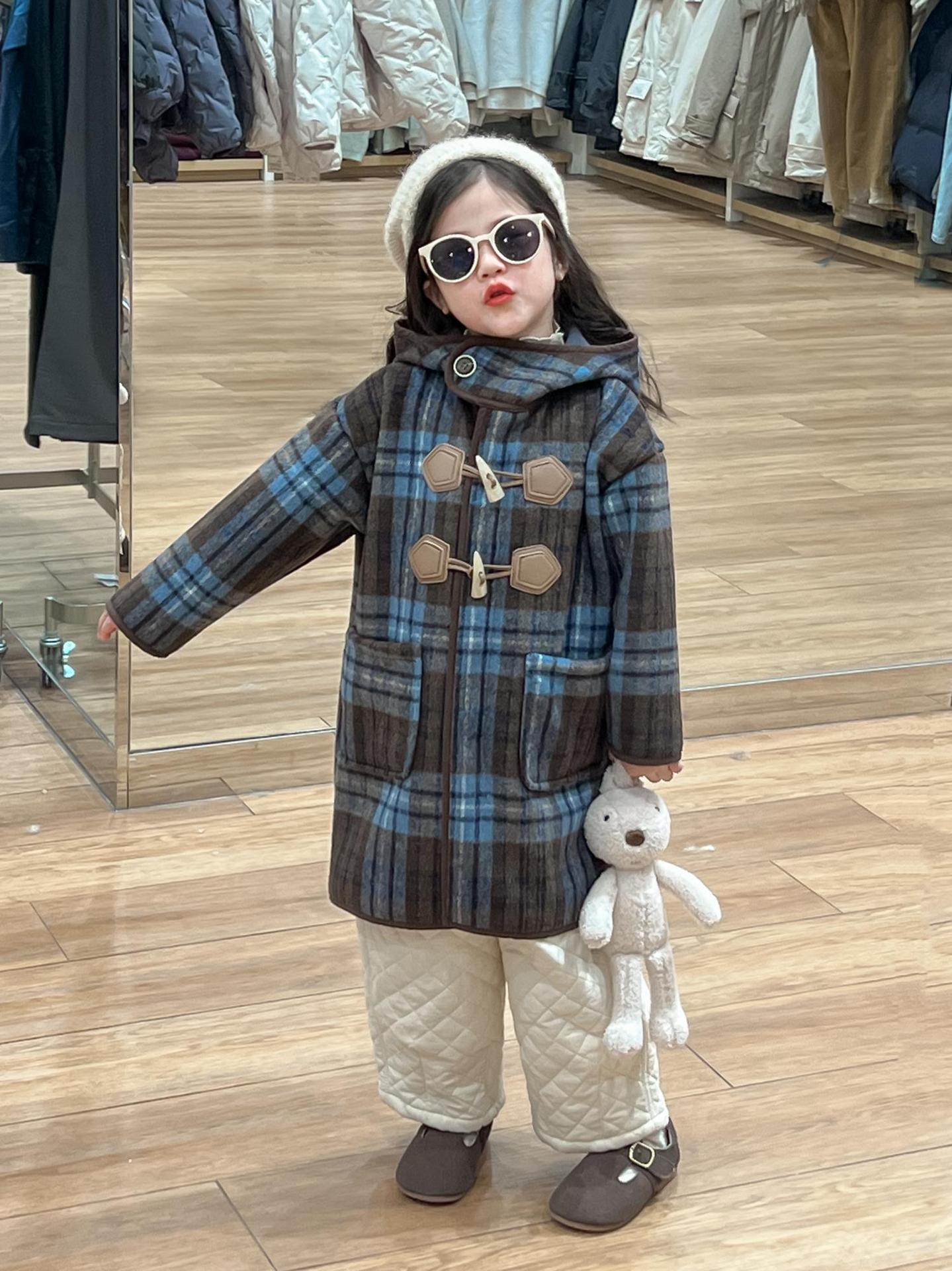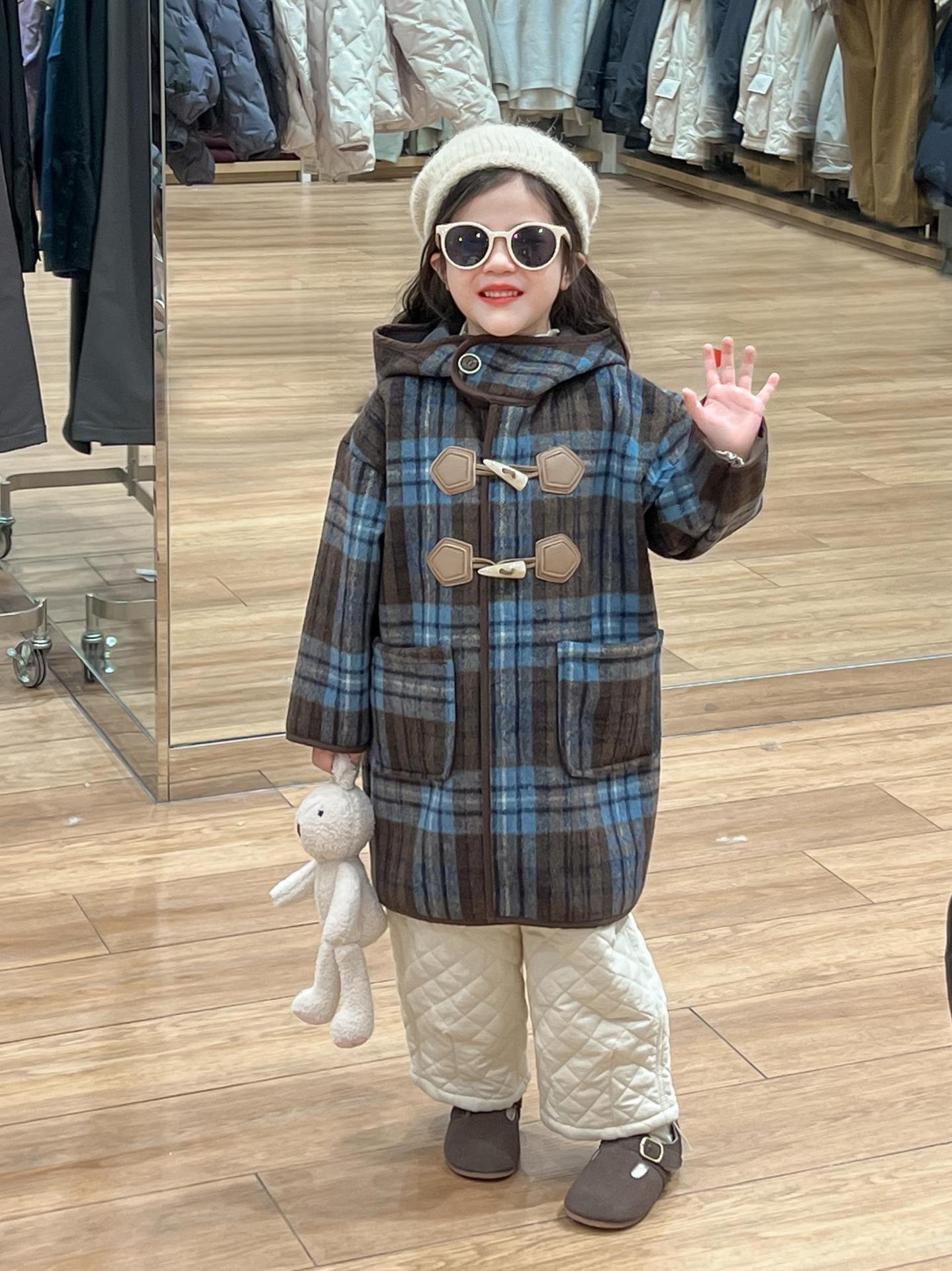 2024 겨울 소녀의 빈티지 칼리지 스타일 블루 지 아오 벨벳 중간 길이의 루즈 후드 두꺼운 울 코트 코트스토어 가기