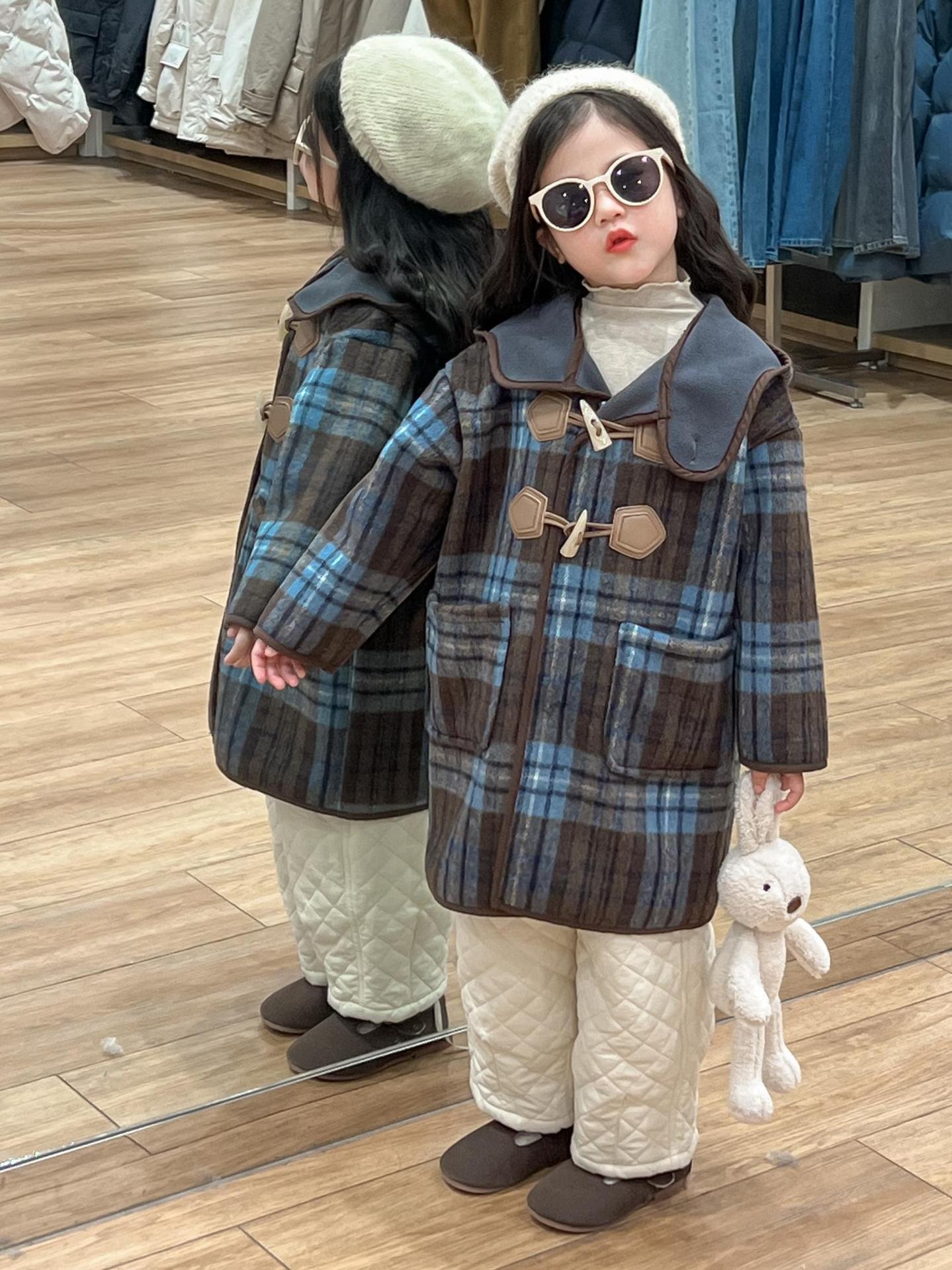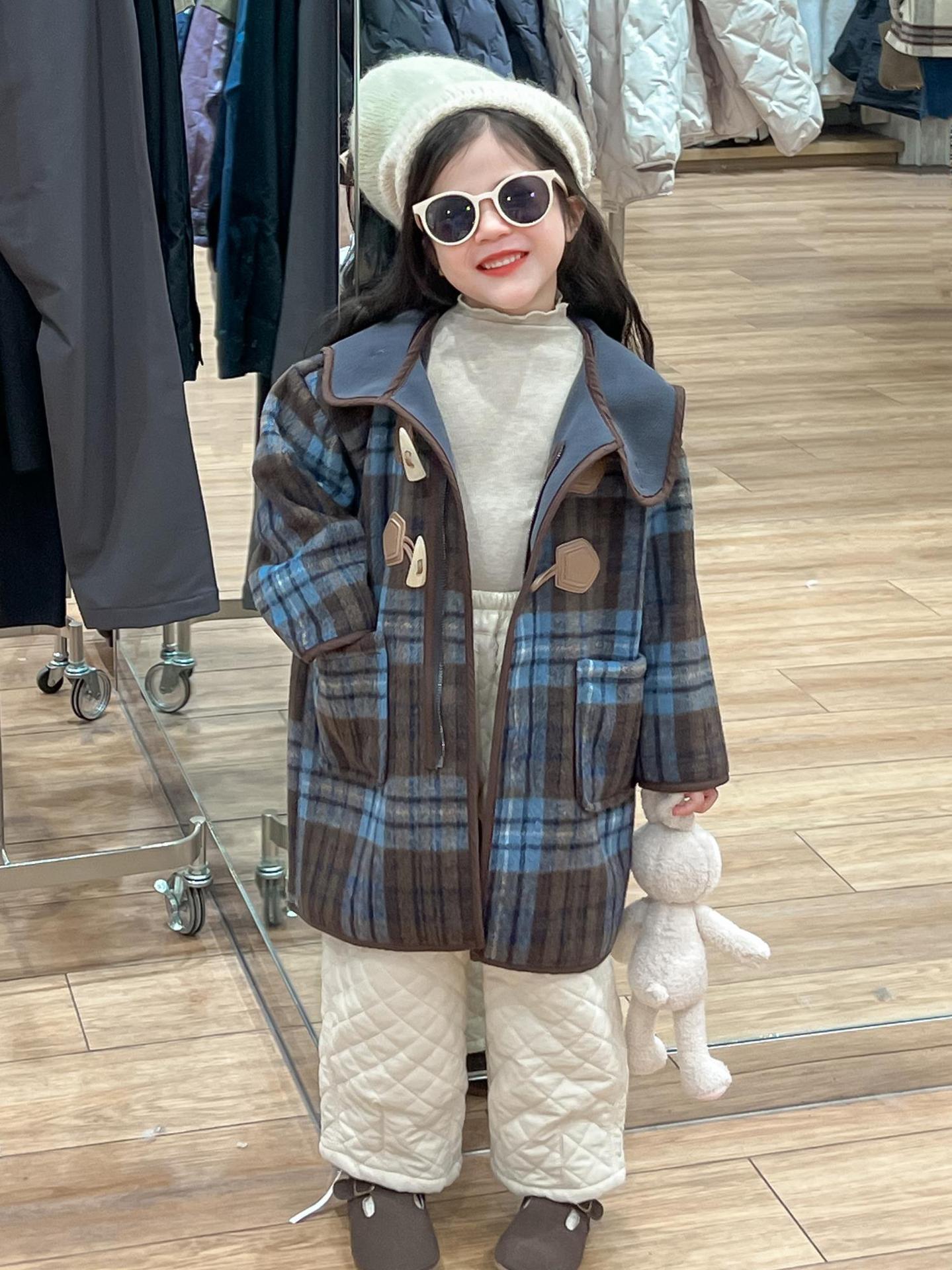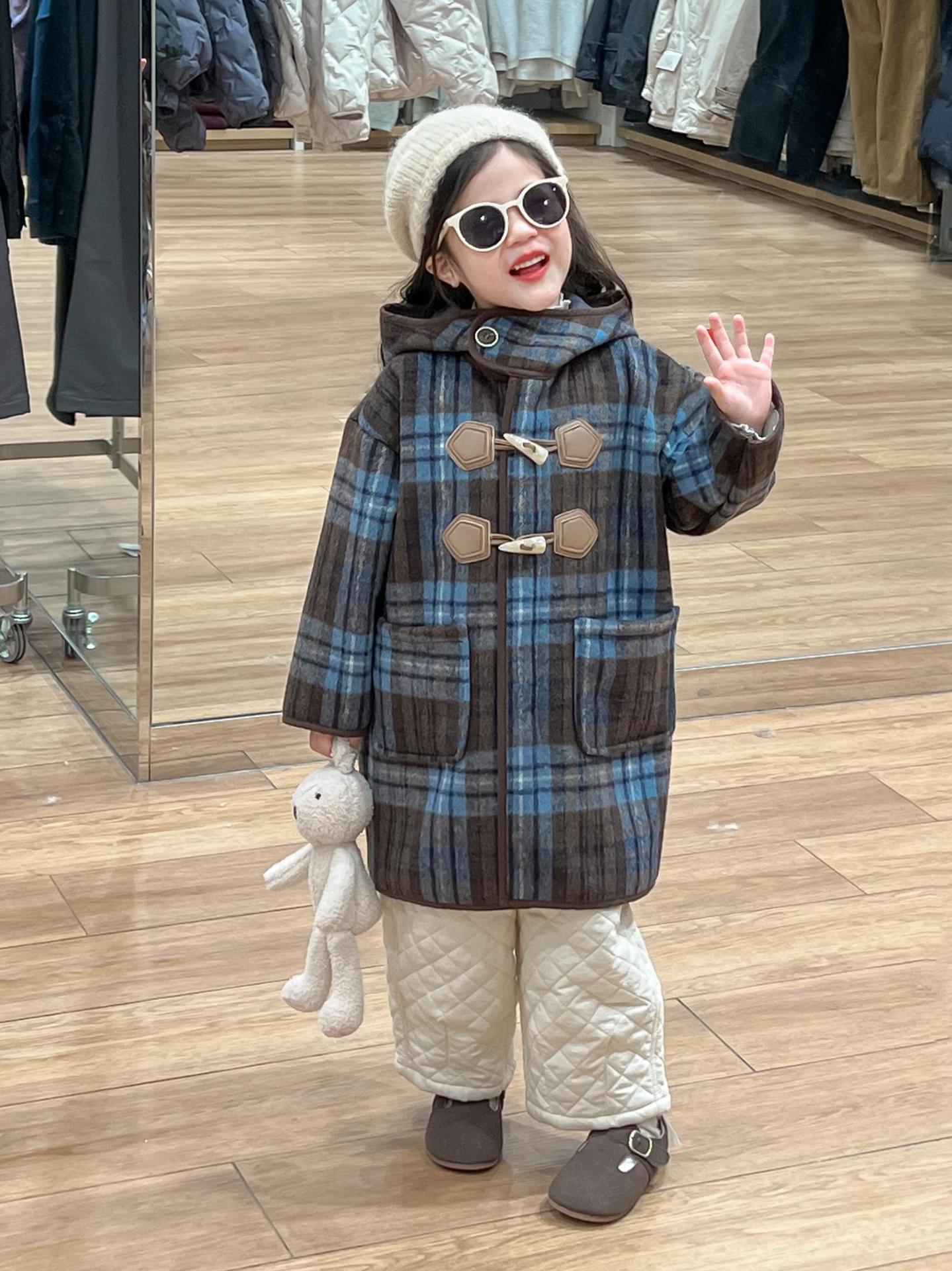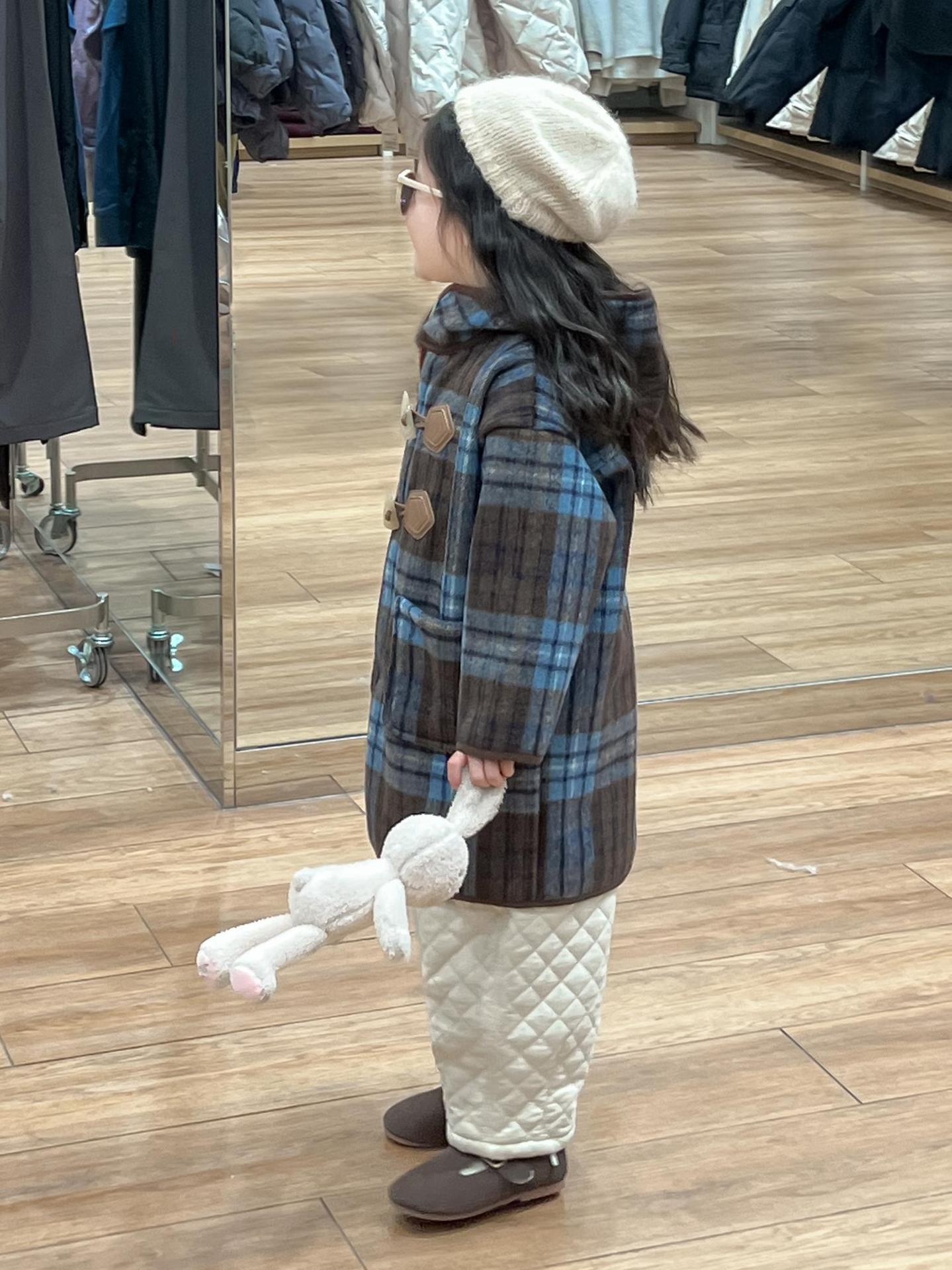 2024 겨울 소녀의 빈티지 칼리지 스타일 블루 지 아오 벨벳 중간 길이의 루즈 후드 두꺼운 울 코트 코트스토어 가기