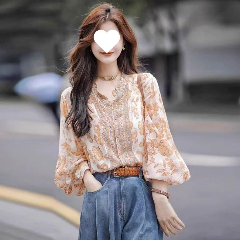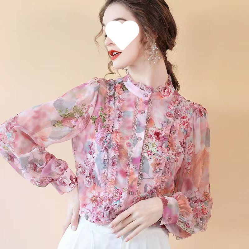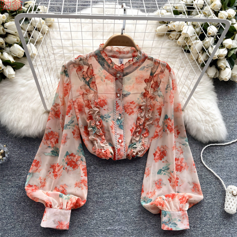 Y9Z 프랑스 달콤한 인쇄 쉬폰 셔츠 여성의 봄 디자인 센스 기질 세련된 러플 랜턴 슬리브 탑스토어 가기