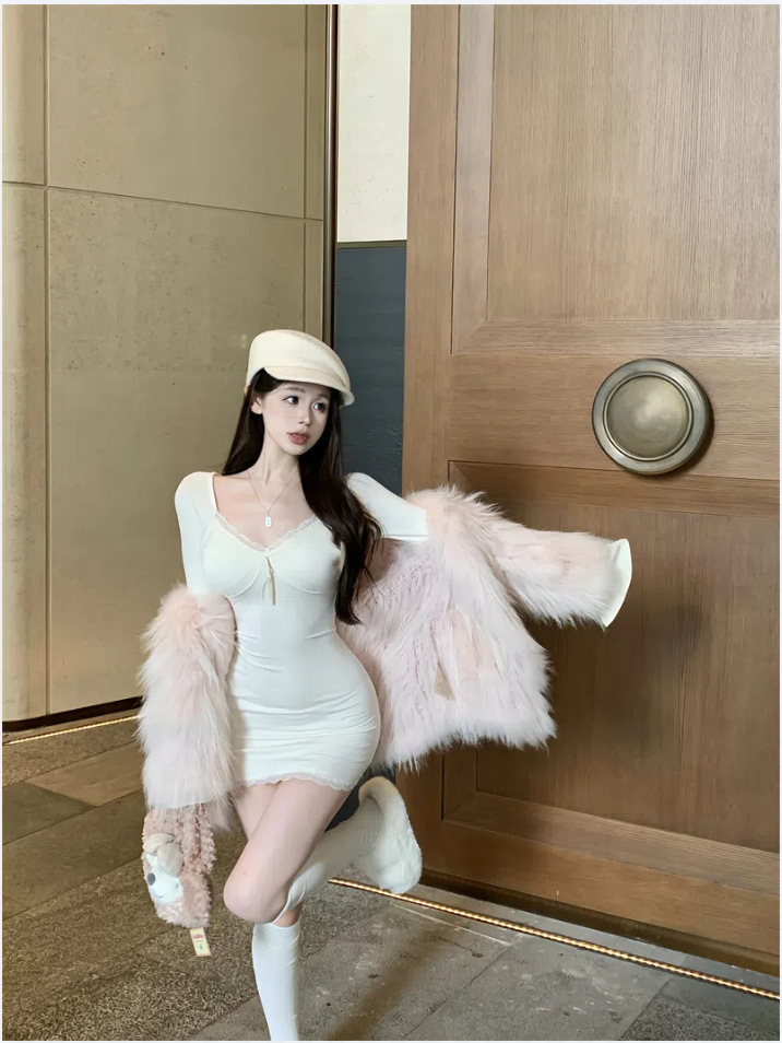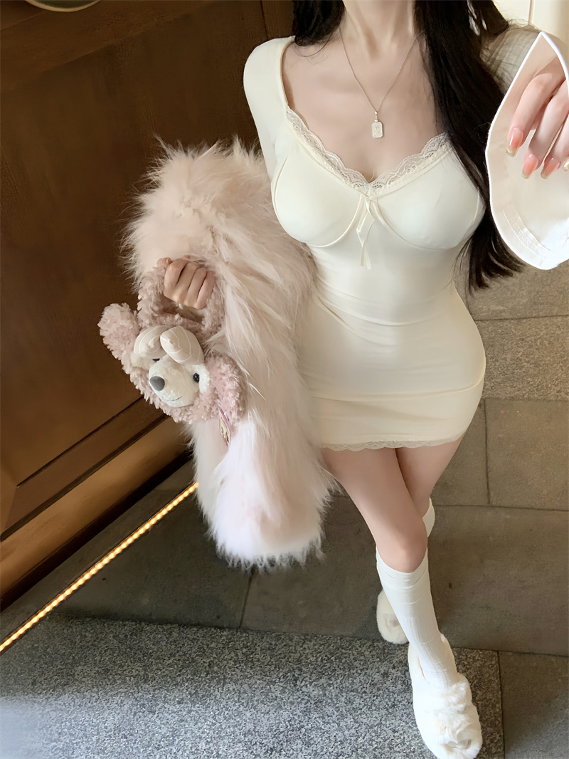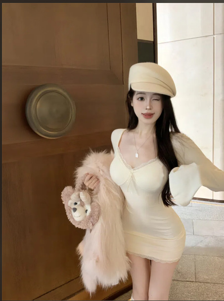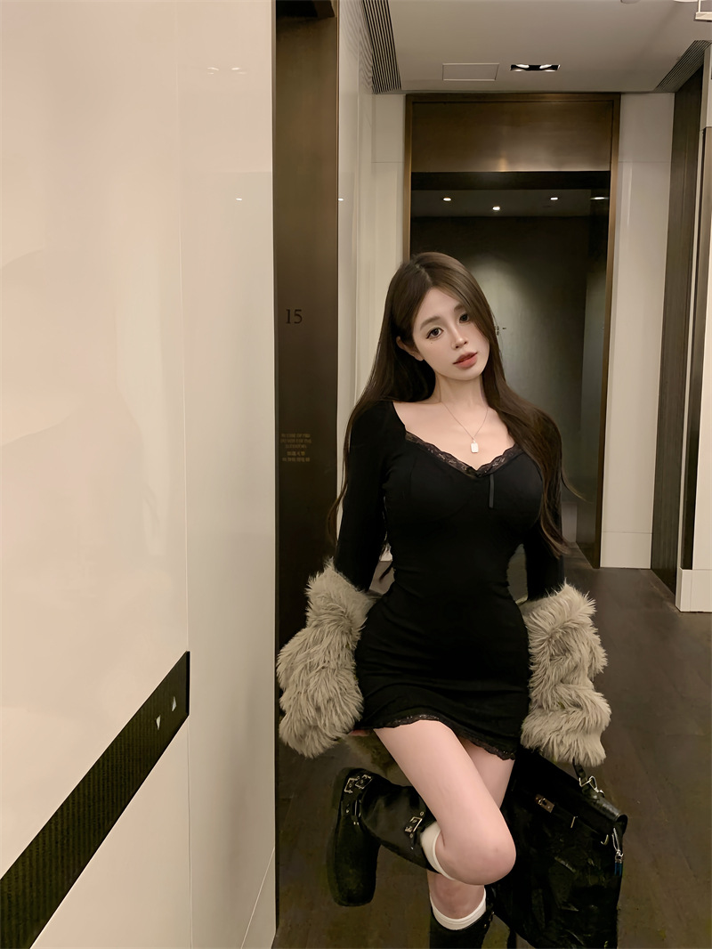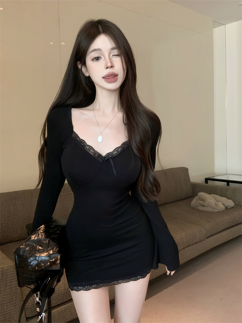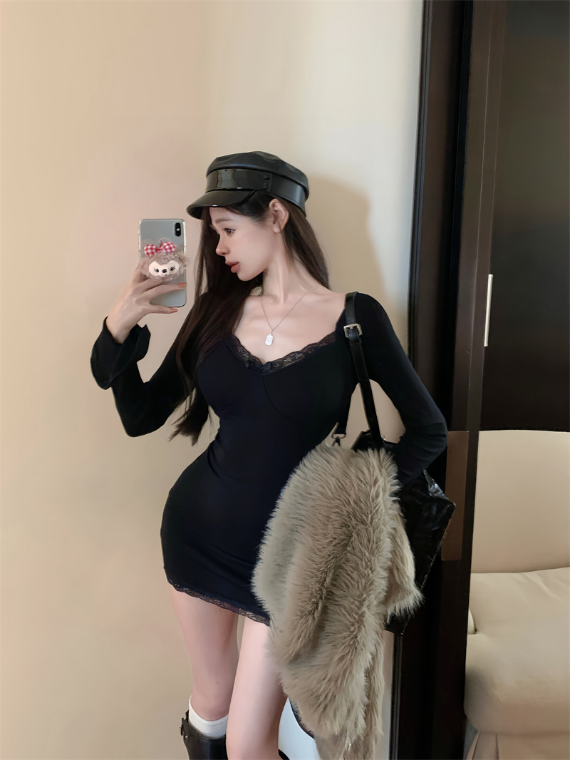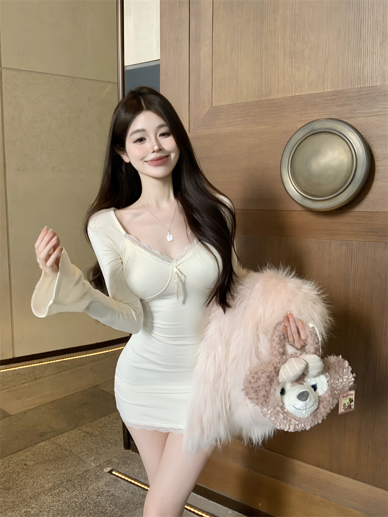 가을 의류 디자인 센스 레이스 사이드 호른 슬리브 타이트 슬리밍 엉덩이 스커트 여성용 베이스 외부 긴 소매 원피스 착용스토어 가기