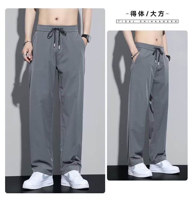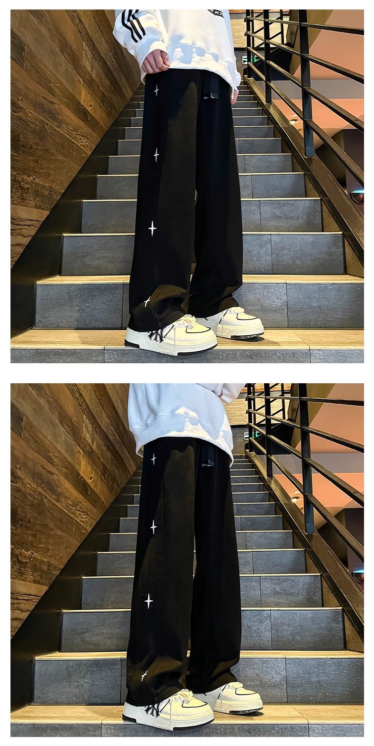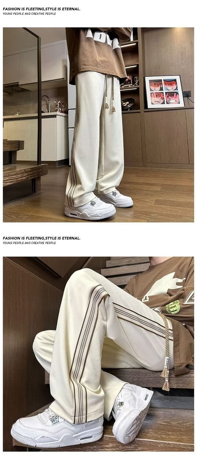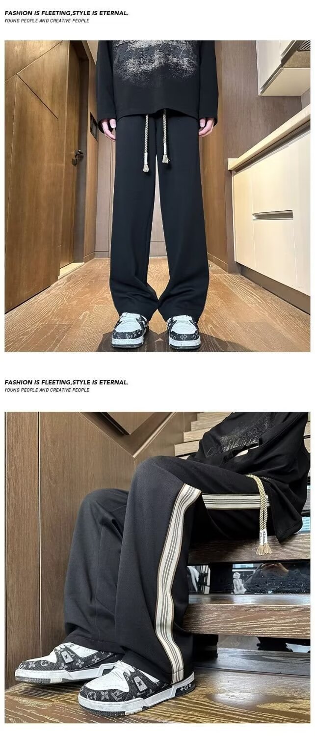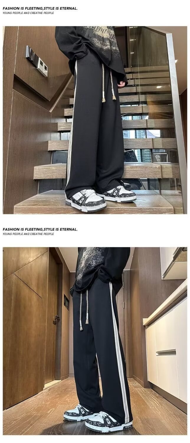 유행 브랜드 줄무늬 캐주얼 바지 남자 봄과 가을 넓은 다리 스트레이트 바지 홍콩 스타일 플러스 사이즈 느슨한 스포츠 바지스토어 가기