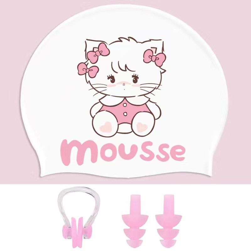 • 고양이 수영 모자 + 흰색 수영 고글 + 분홍색 코 클립 귀마개