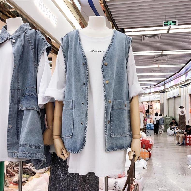 봄과 가을 느슨한 여성 민소매 데님 조끼 오버레이 쌓인 조끼 루즈 스티칭 재킷 올 매치 캐주얼 포니스토어 가기