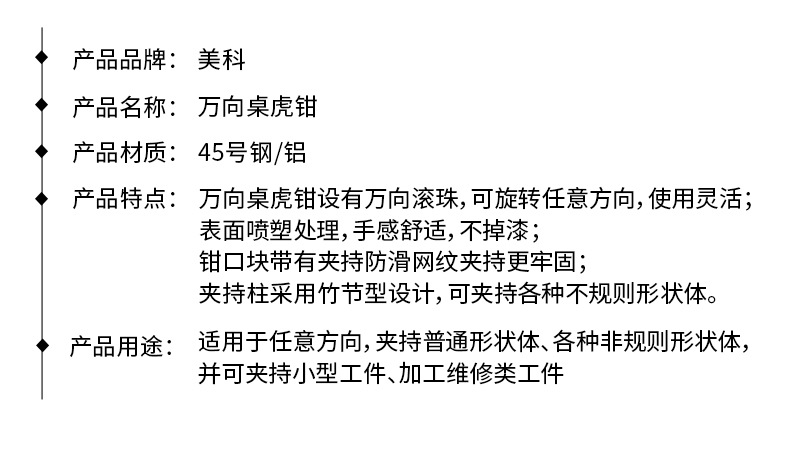 • 알루미늄 범용 테이블 바이스(스테인리스 조)에는 클램핑 액세서리가 함께 제공됩니다.