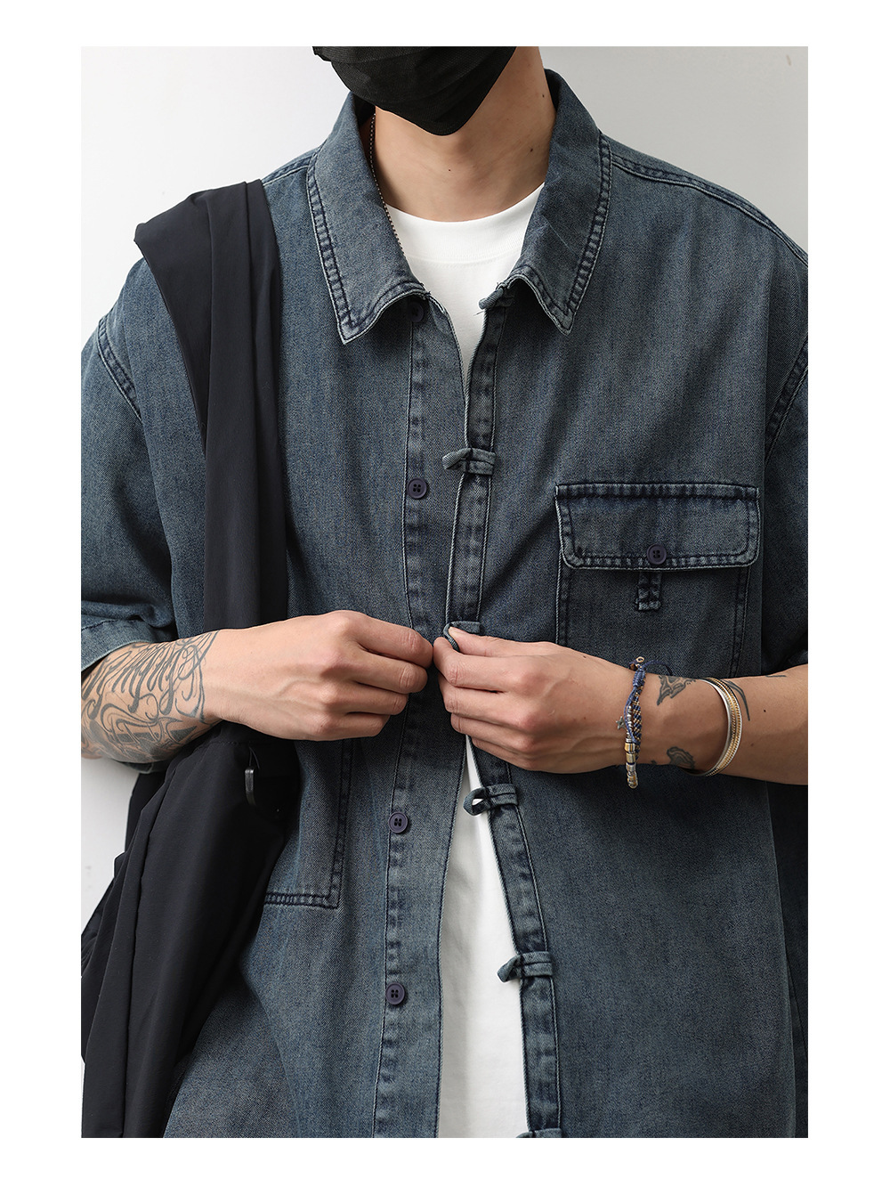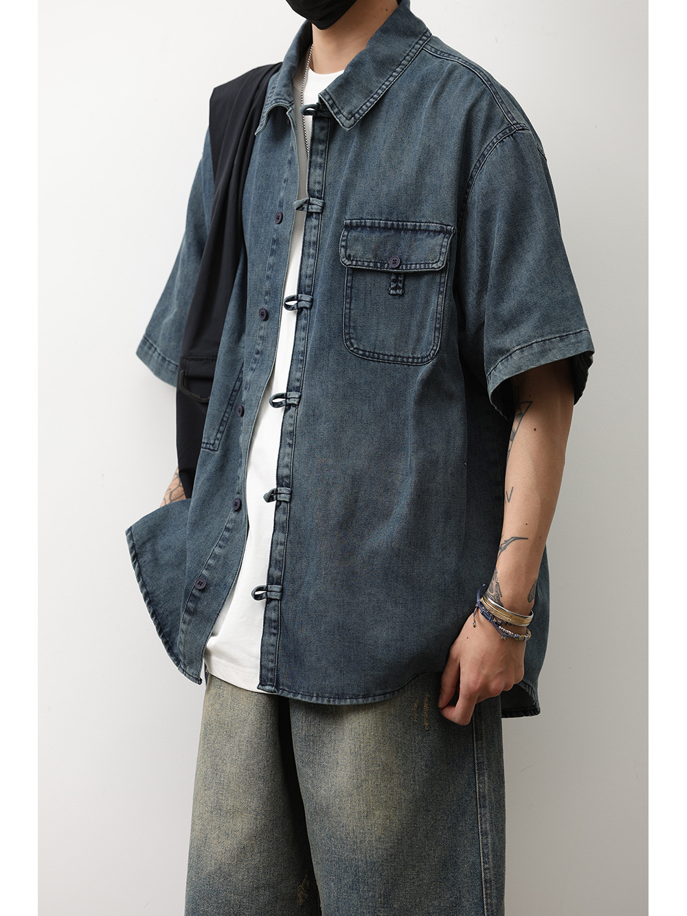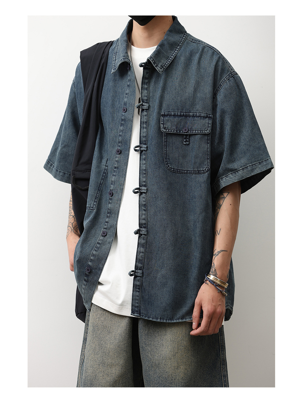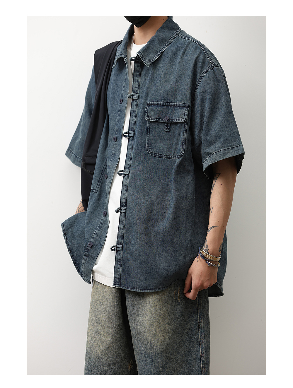 데님 반팔 셔츠 여름 새로운 중국 틈새 디자인 센스 버클 다크 블루 셔츠 남성 국가 스타일 코트 트렌드스토어 가기