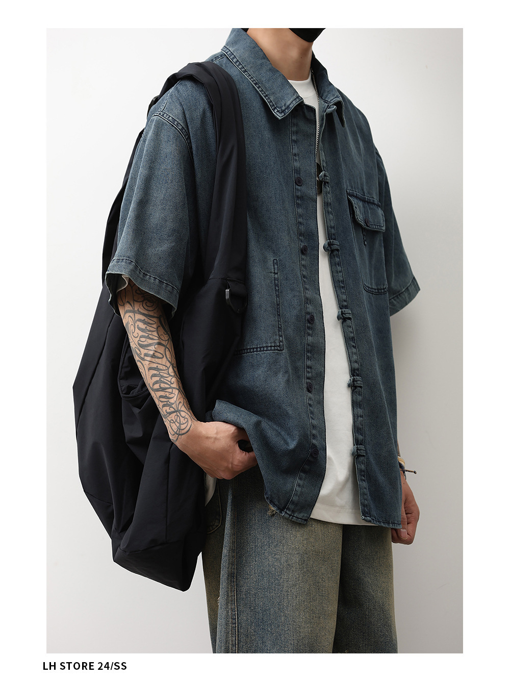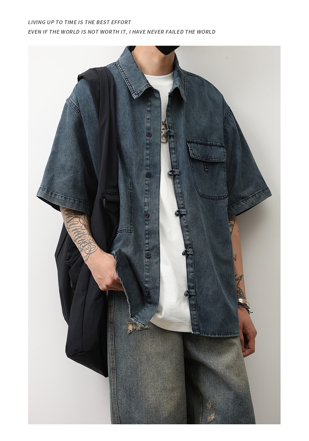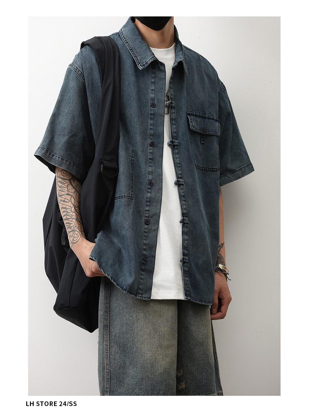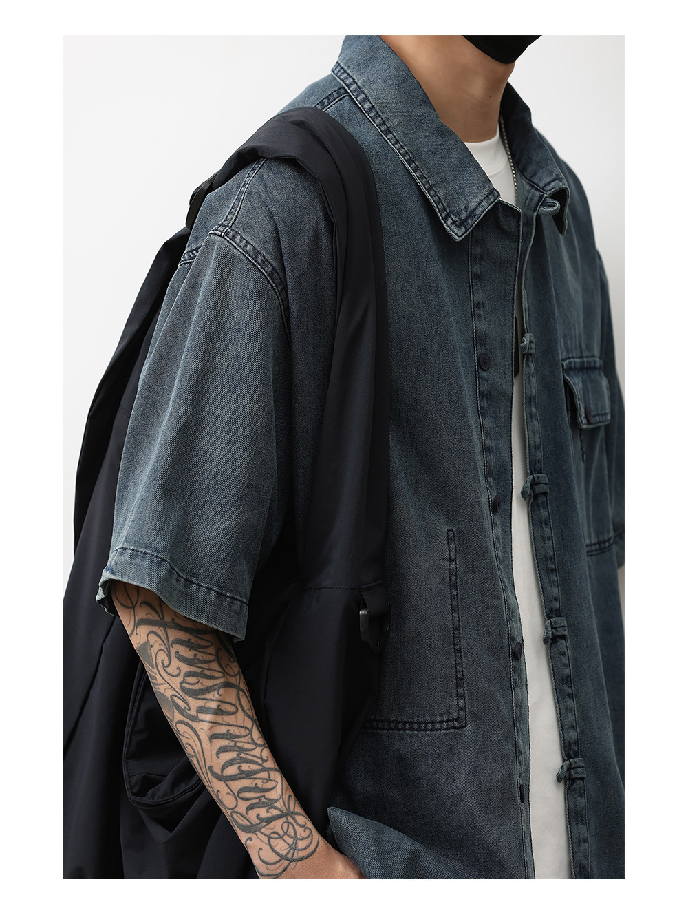 데님 반팔 셔츠 여름 새로운 중국 틈새 디자인 센스 버클 다크 블루 셔츠 남성 국가 스타일 코트 트렌드스토어 가기