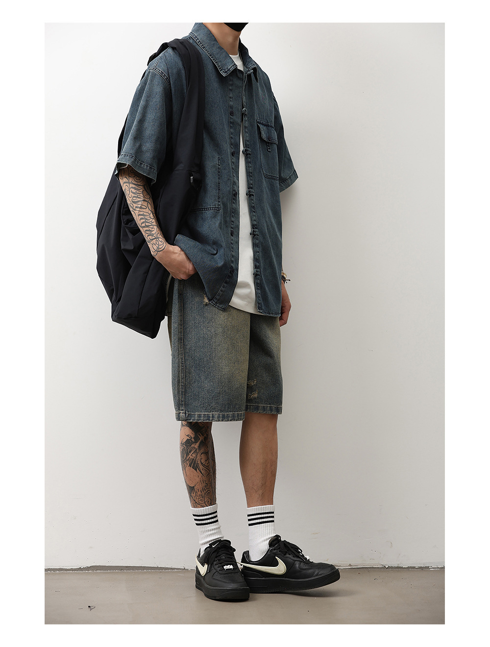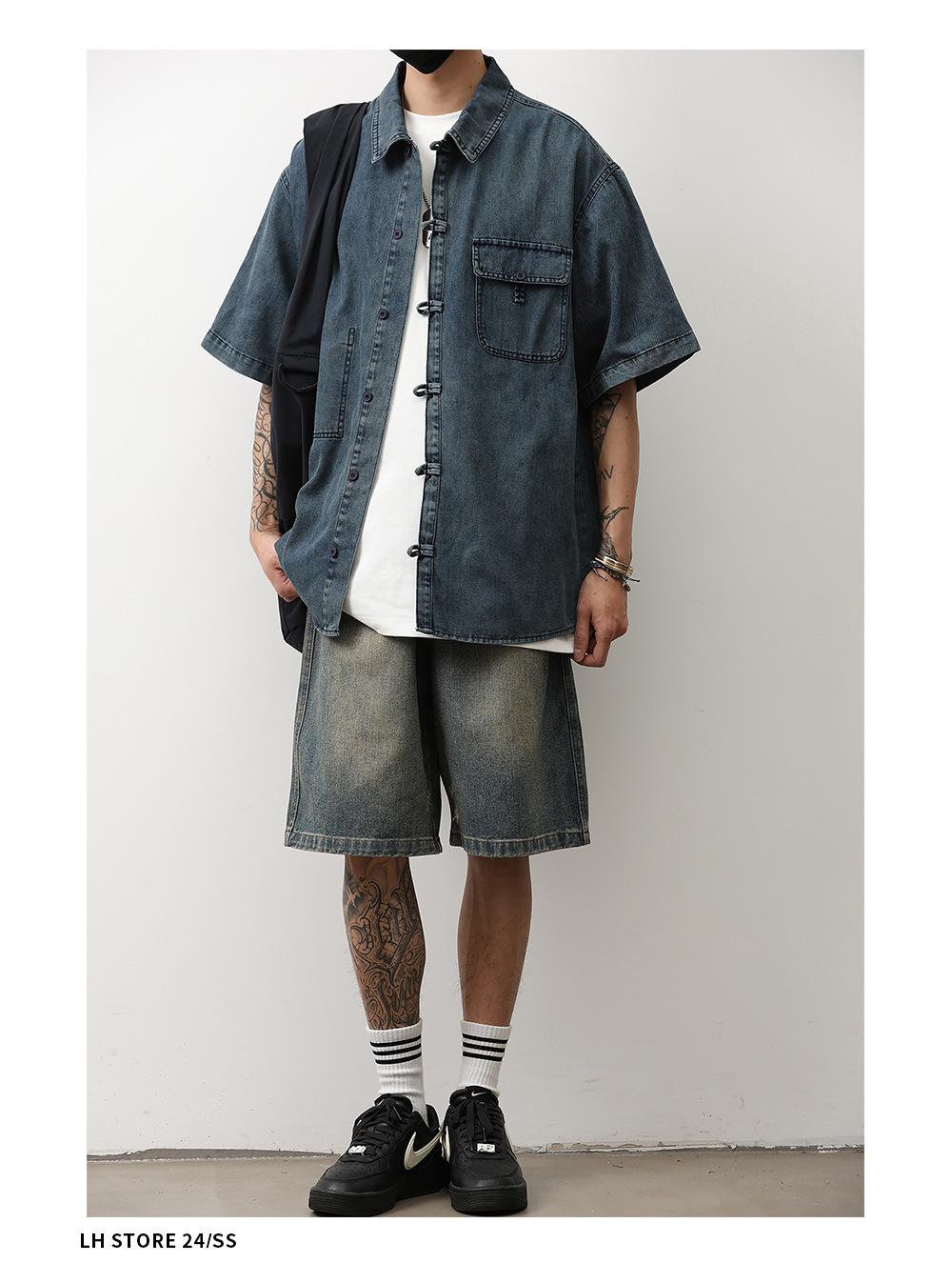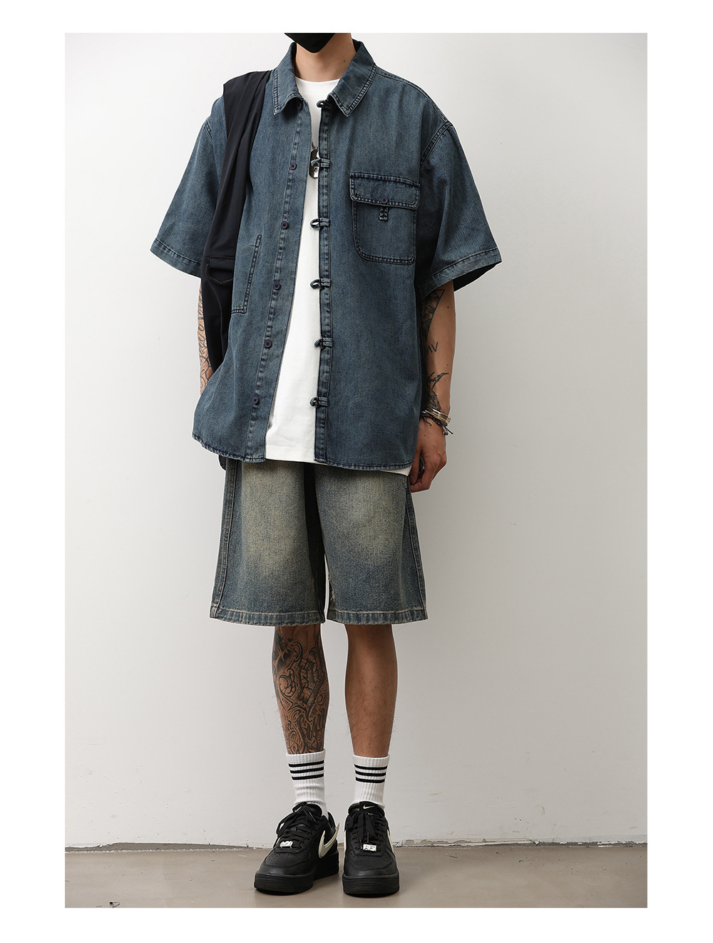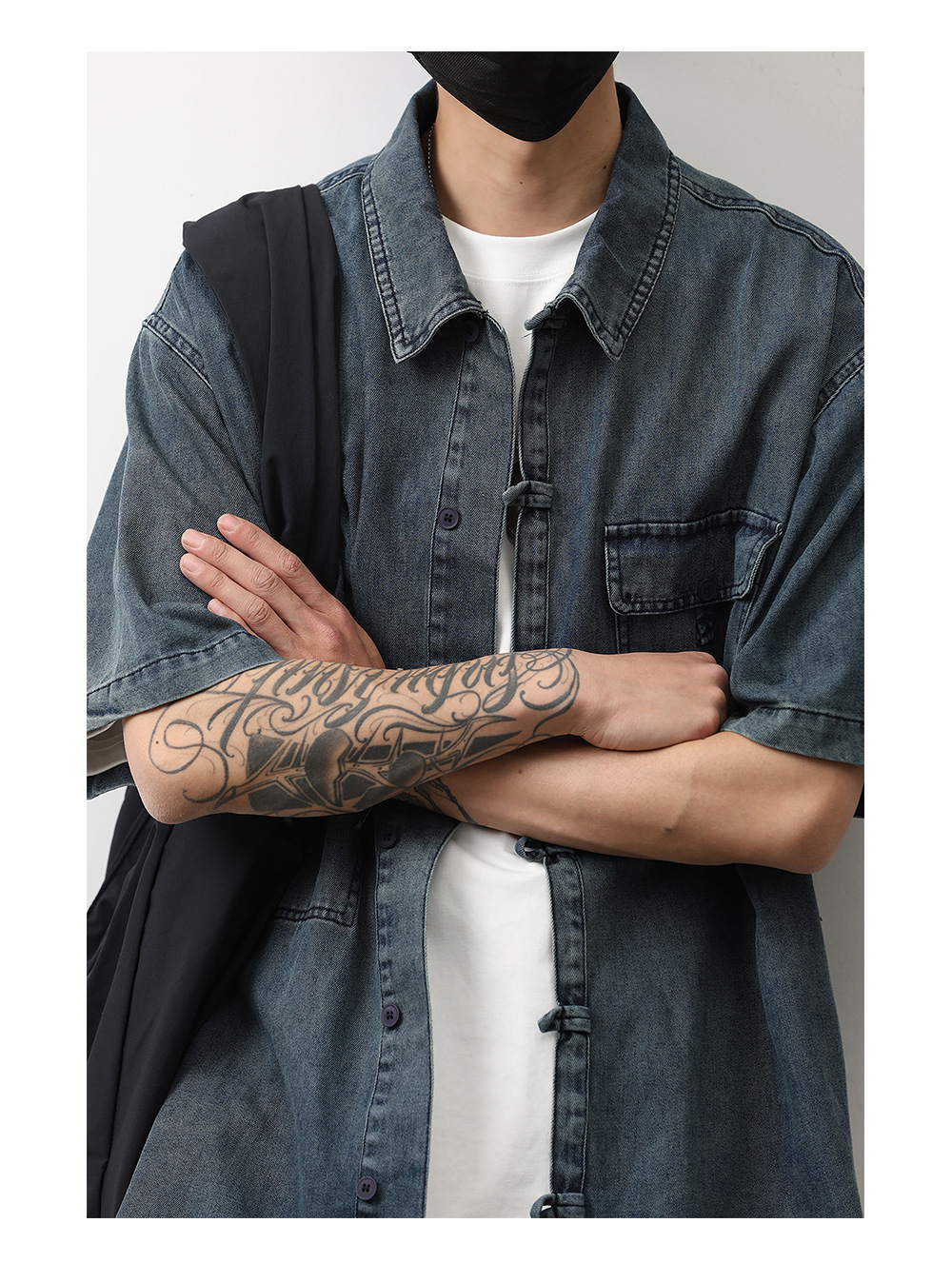 데님 반팔 셔츠 여름 새로운 중국 틈새 디자인 센스 버클 다크 블루 셔츠 남성 국가 스타일 코트 트렌드스토어 가기
