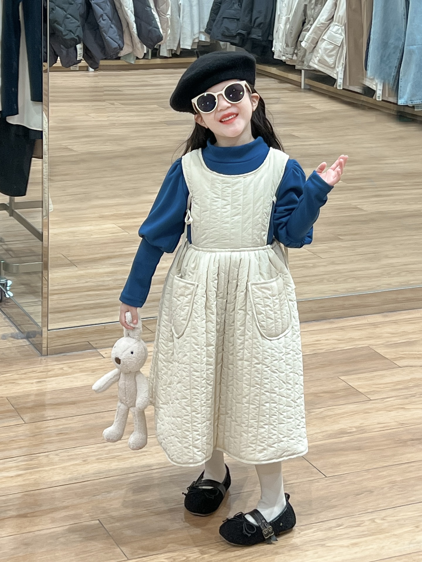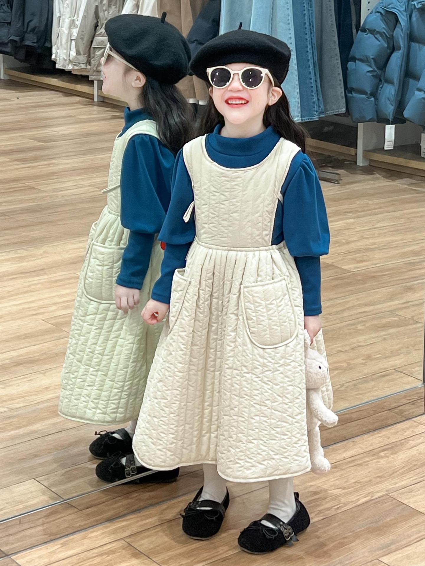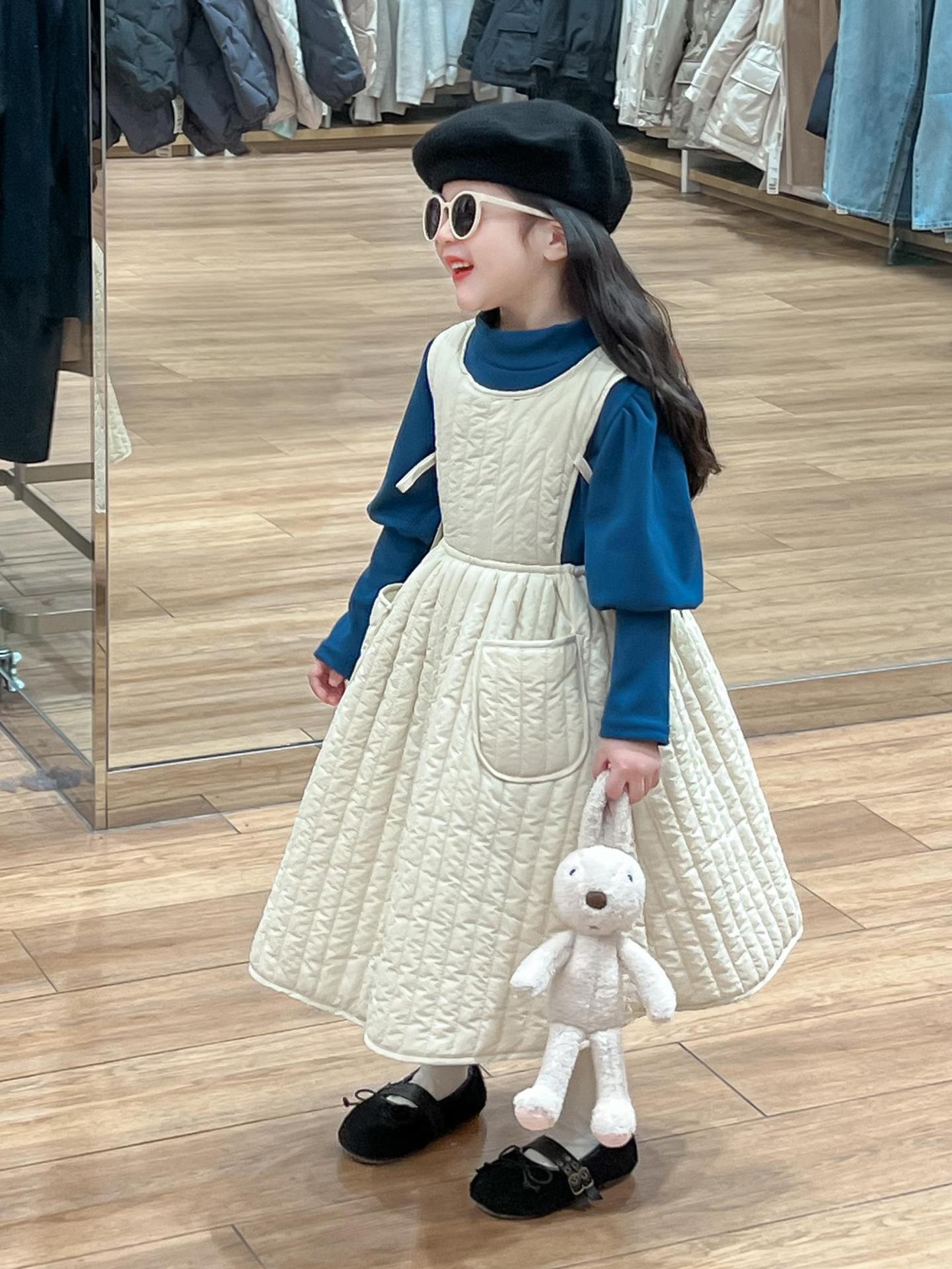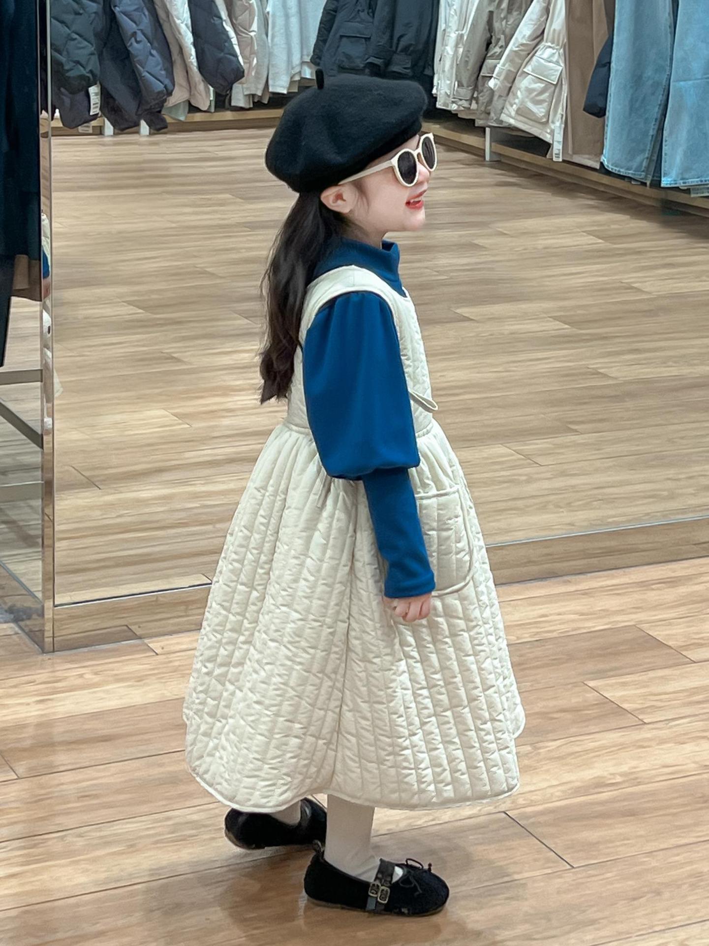 여자 겨울 한국 스타일 긴 두꺼운 퀼트 조끼 원피스 블루 퍼프 소매 높은 목 싱글 비트