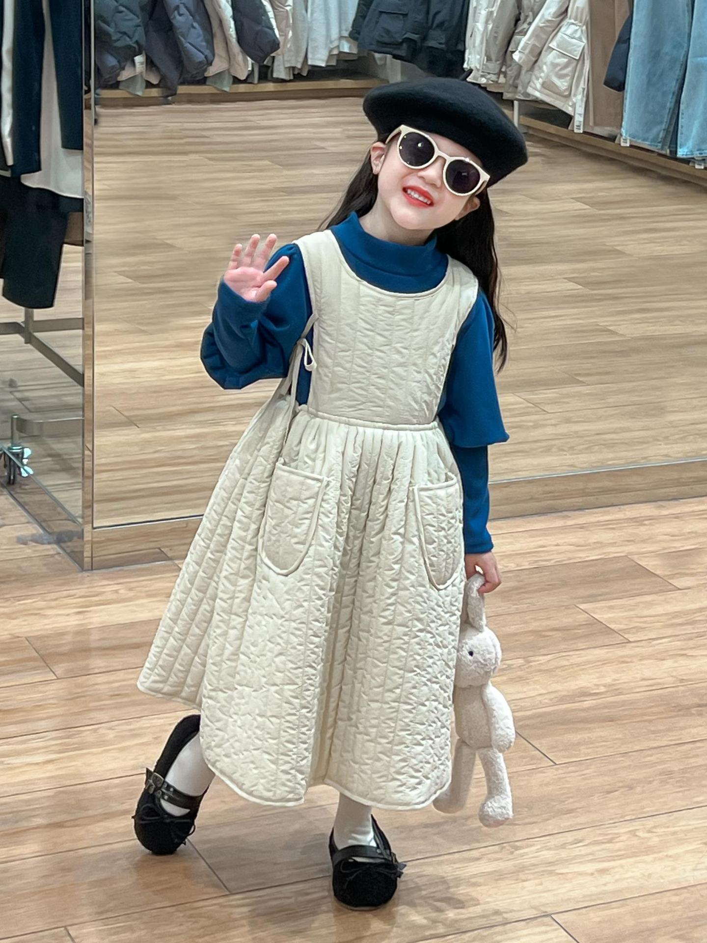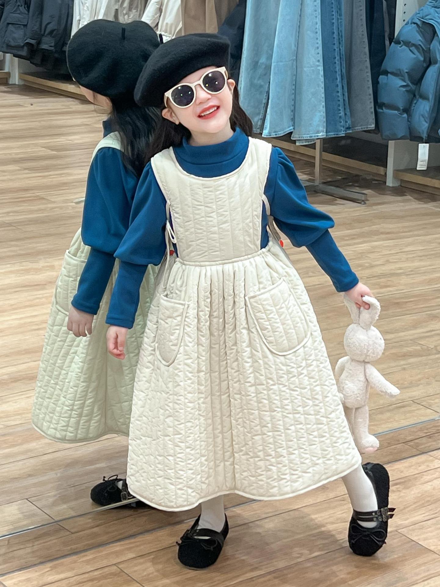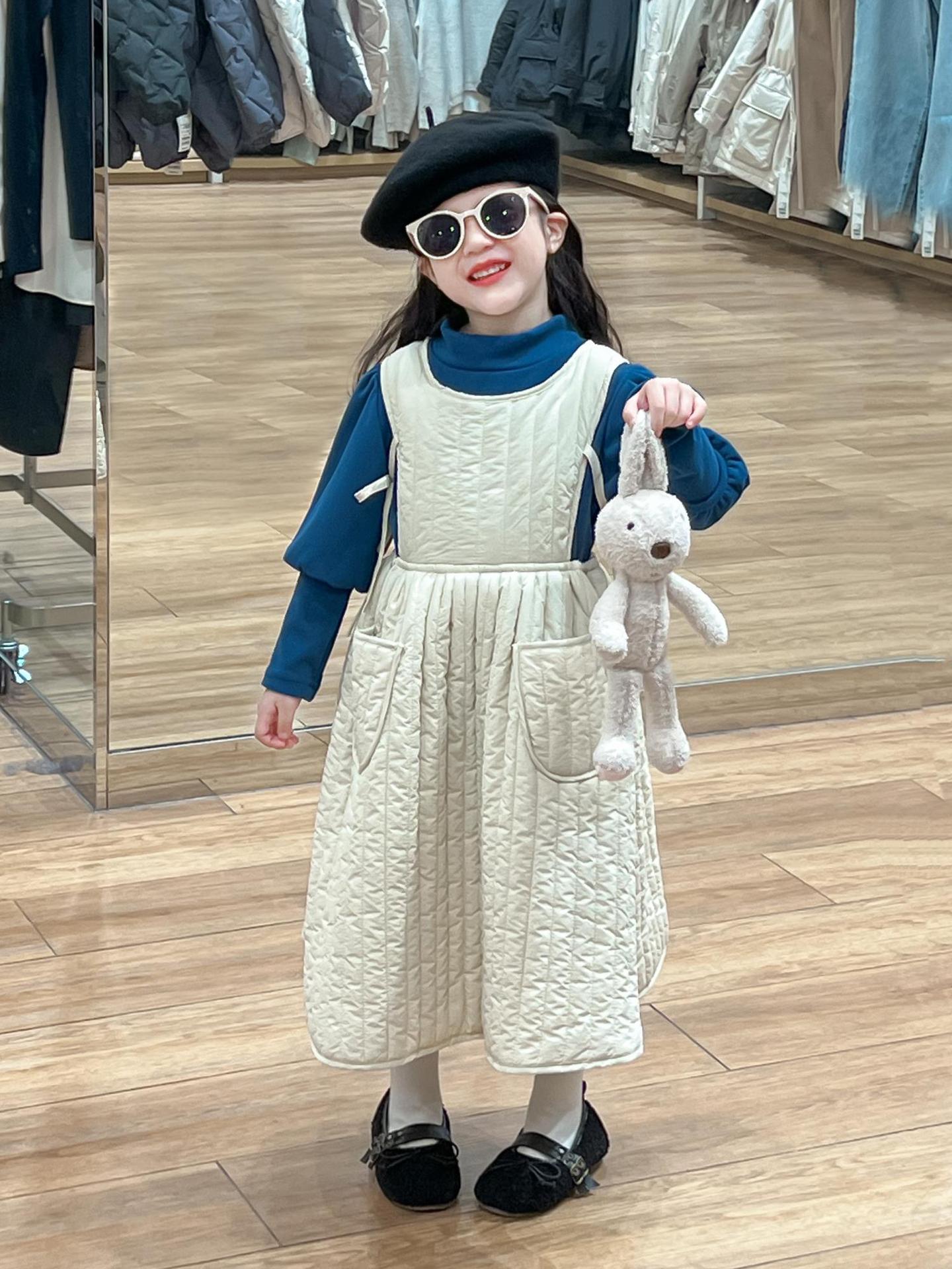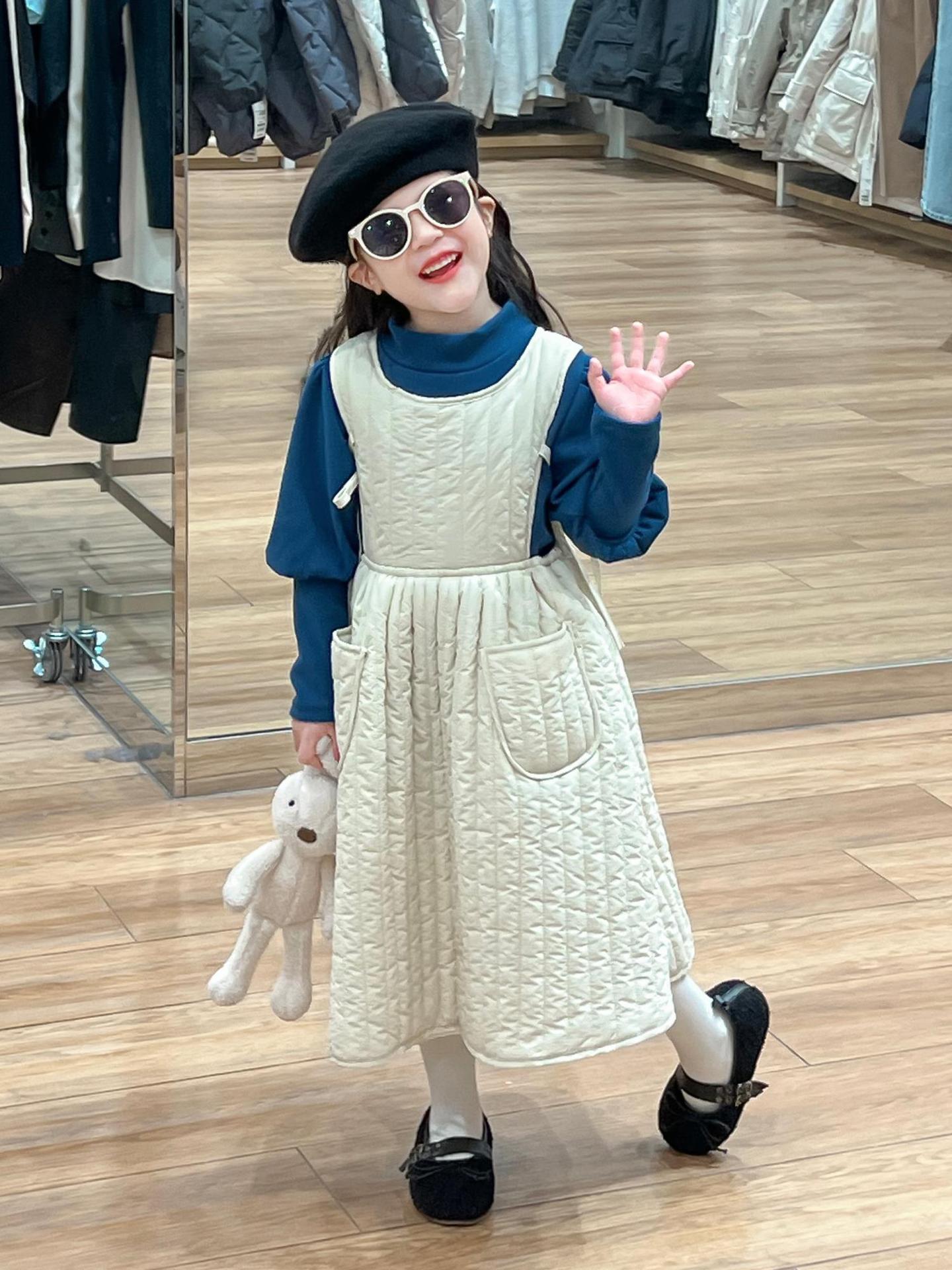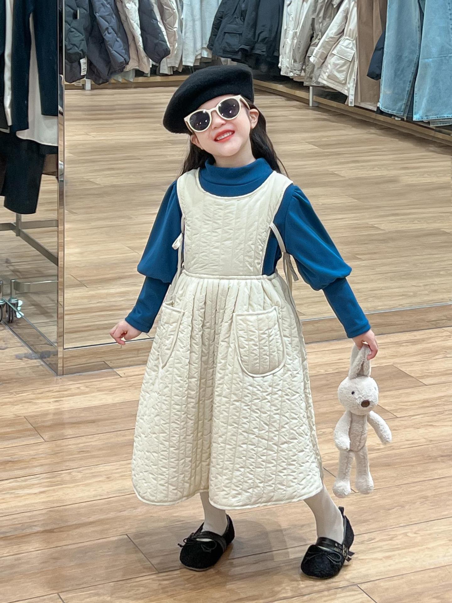 여자 겨울 한국 스타일 긴 두꺼운 퀼트 조끼 원피스 블루 퍼프 소매 높은 목 싱글 비트