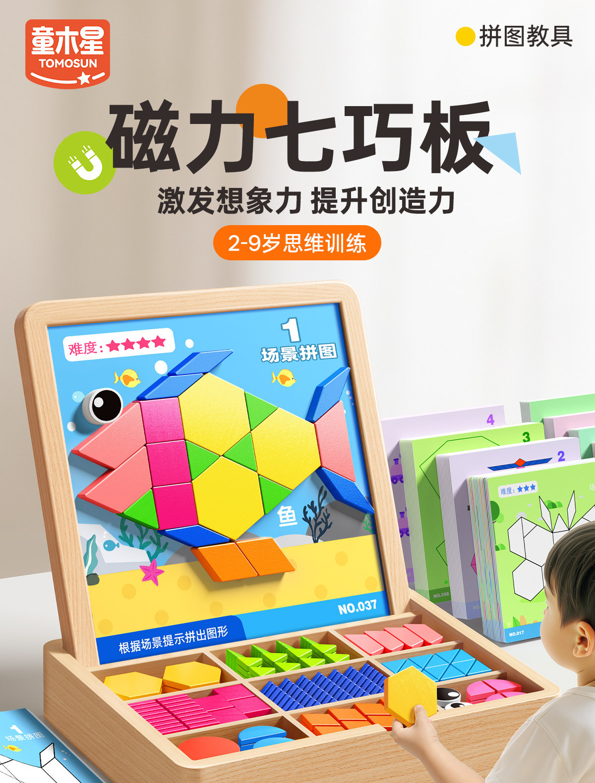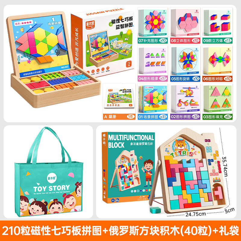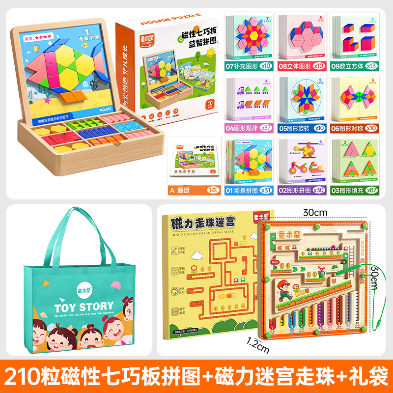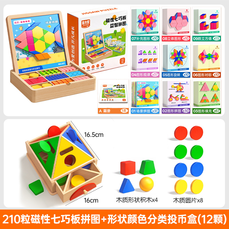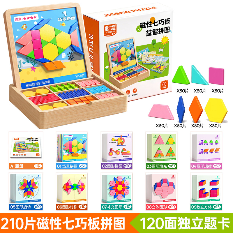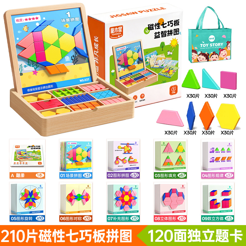 • 【선물세트】 자석 칠교놀이 퍼즐 【210조각, 5000개 이상의 도형 조립 가능 + 120페이지 문제 카드 + 조립 문제집】