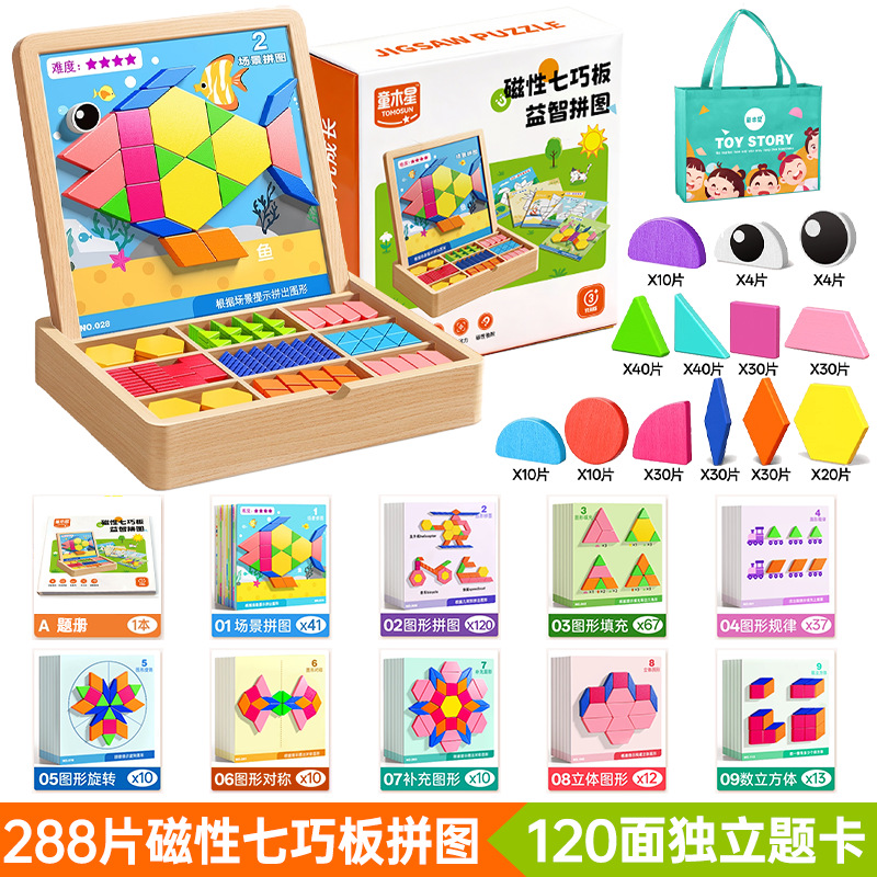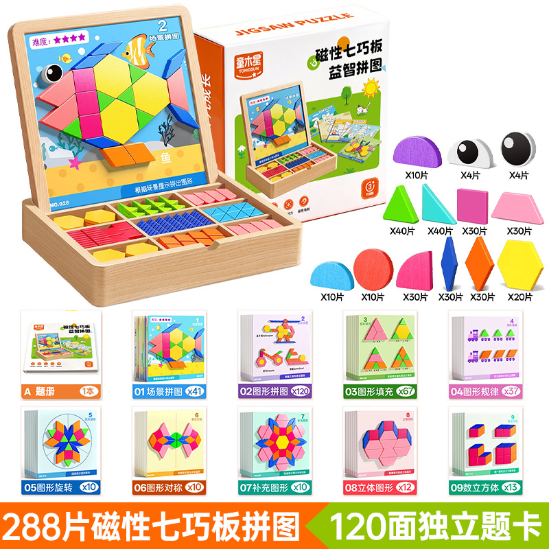 • 【선물 세트】 자석 칠교놀이 퍼즐 【288개 조각으로 8000개 이상의 도형 조립 가능 + 120페이지 문제 카드 + 조립 문제집】