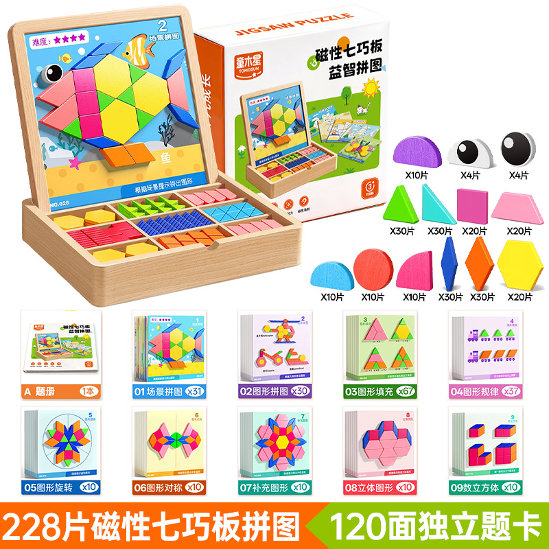 • 【선물 세트 + 선물 가방 포장】 자석 칠교놀이 퍼즐 【228조각, 6500개 이상의 도형 조립 가능 + 120페이지 문제 카드 + 조립 문제집】