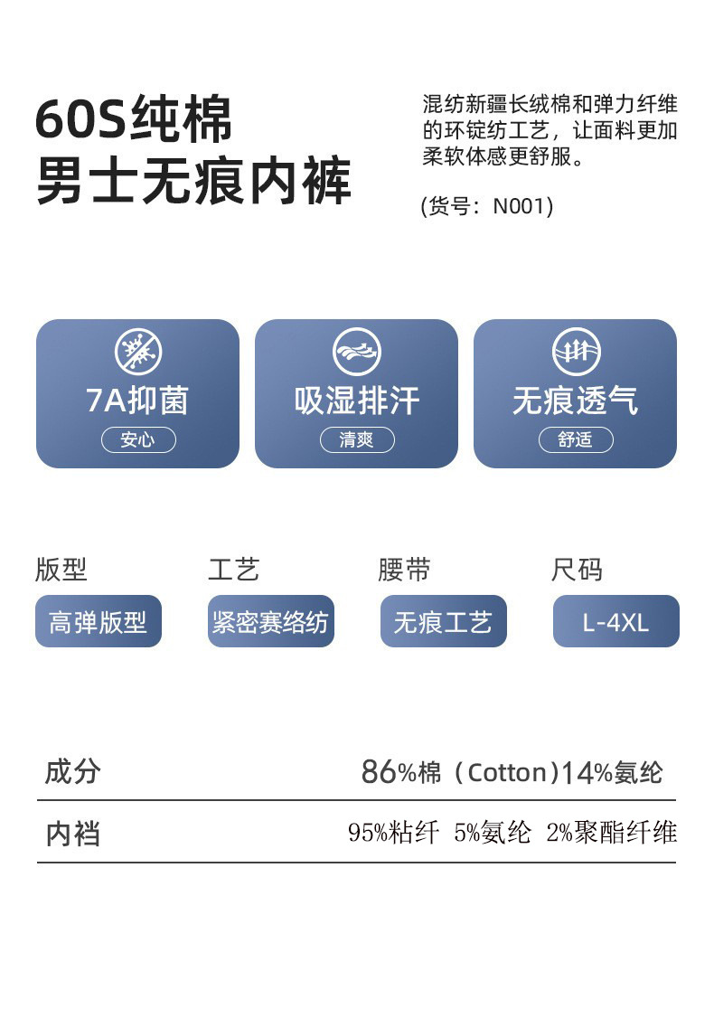남성용 순면 A급 60수 편안한 무봉제 10A 항균 안감 미드웨이스트 사각팬티 남성용