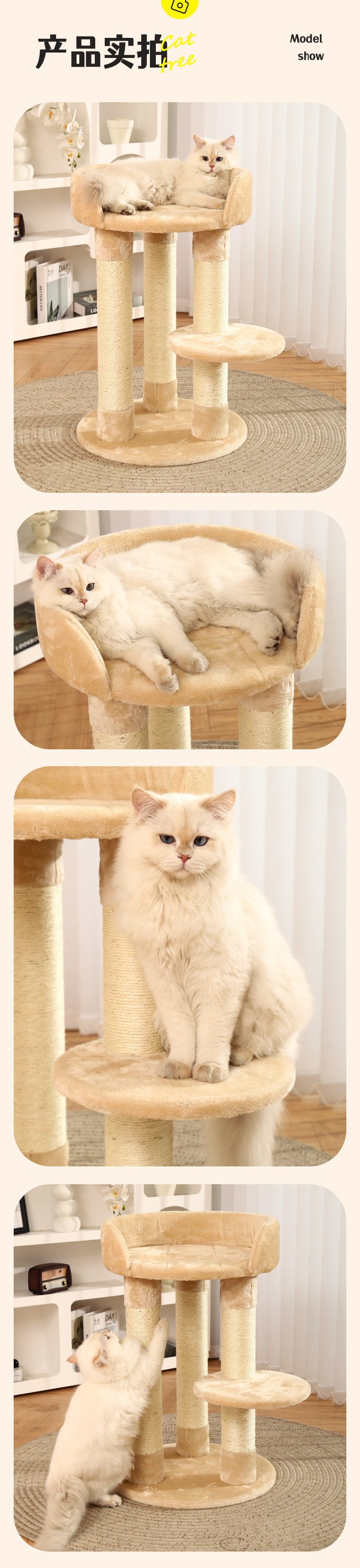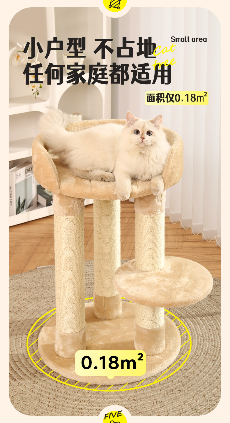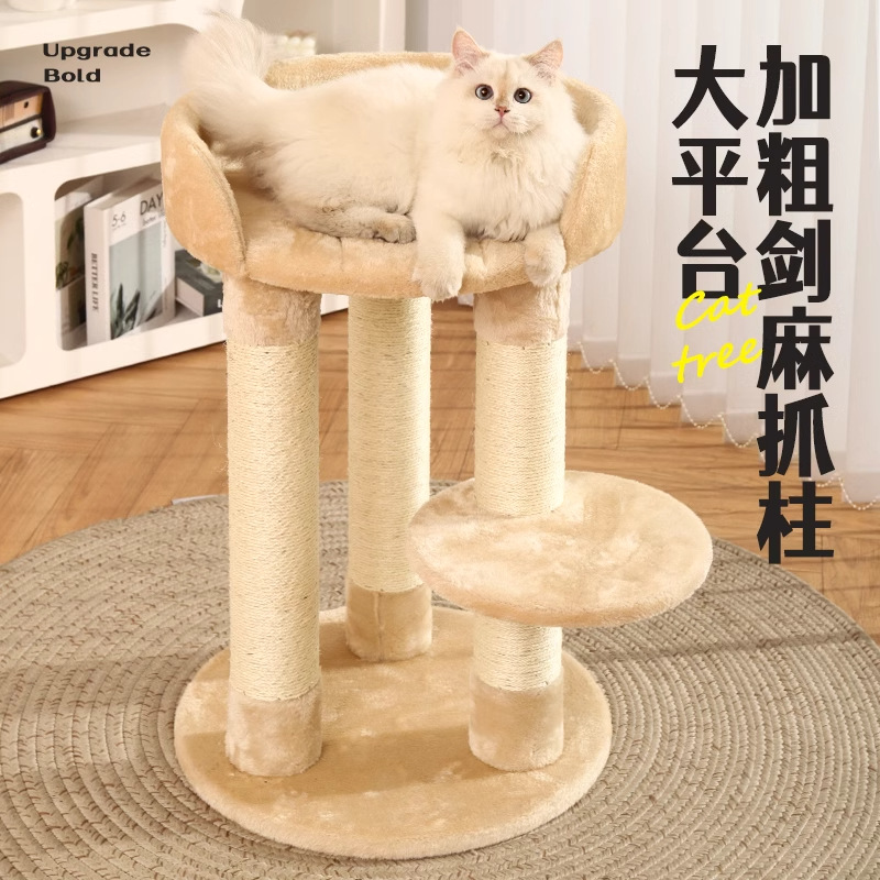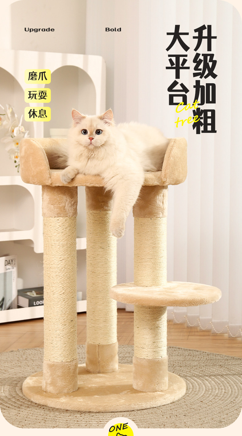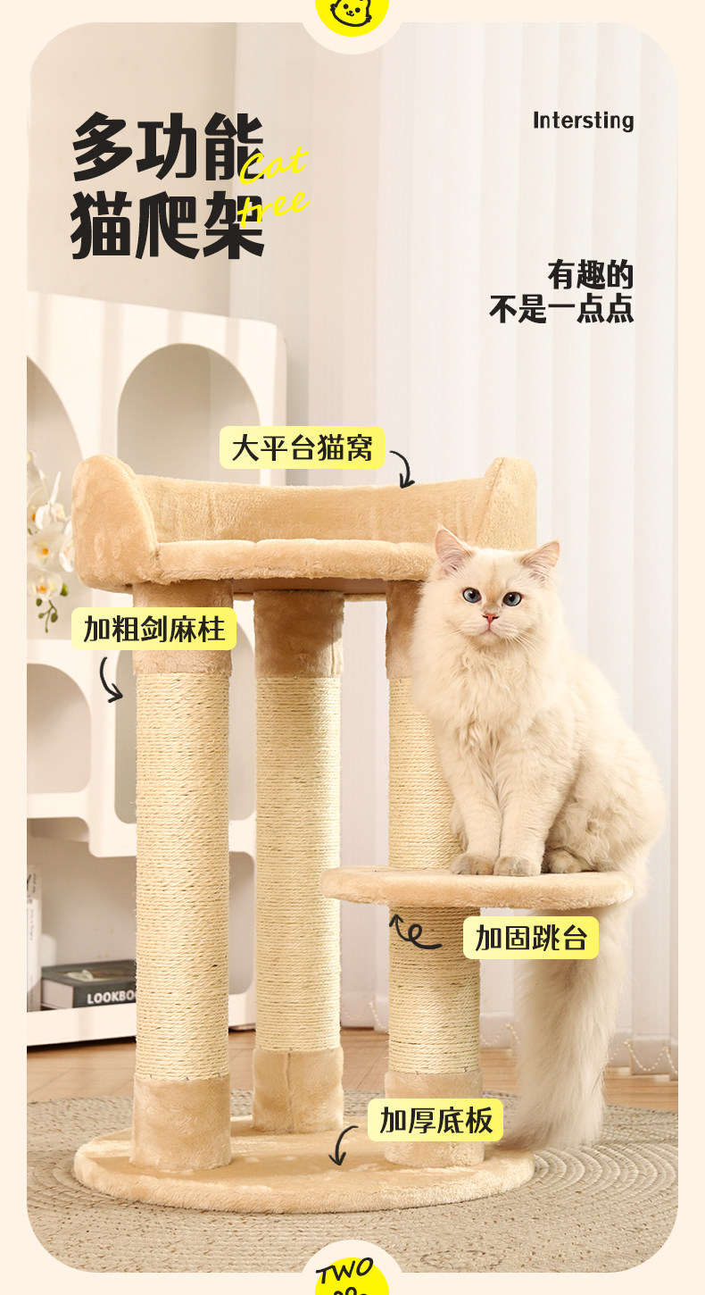 【品名】:Hoopet粗柱大平台小型爬架(米色)/粗柱大平台带窝猫爬架(米色)