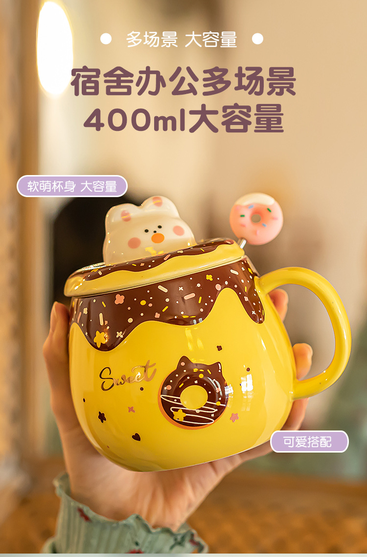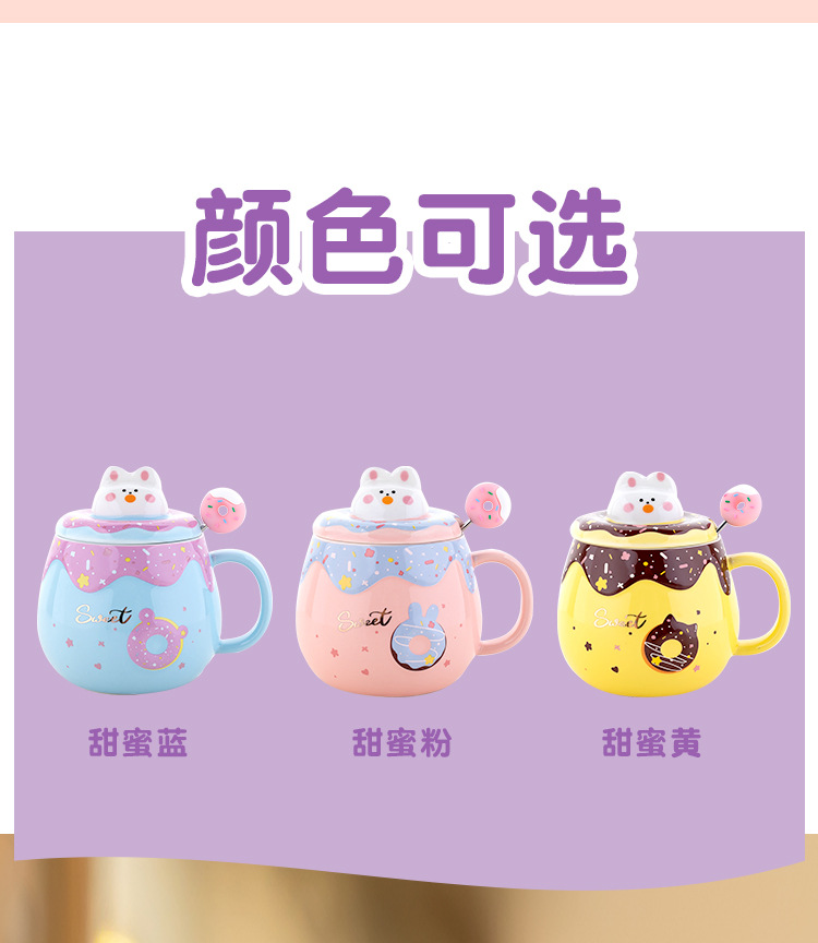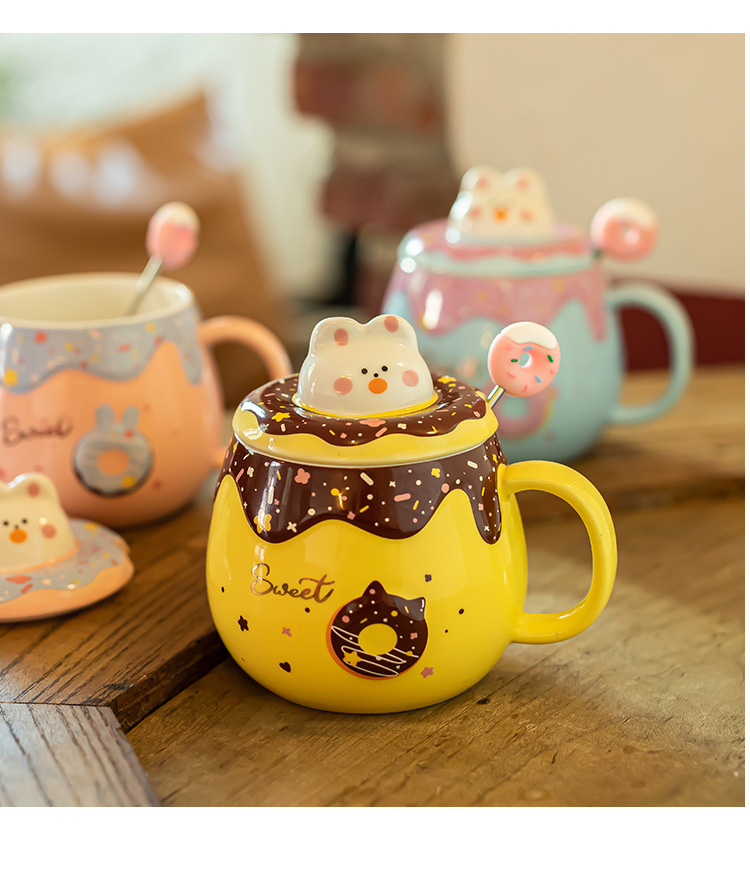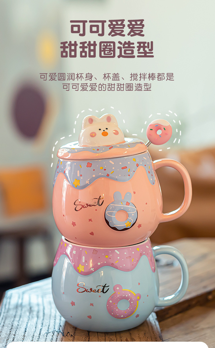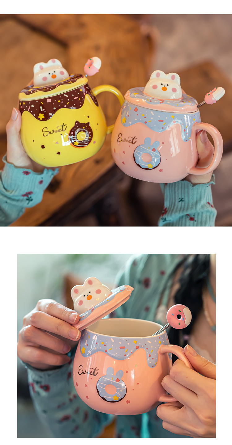 귀여운 도넛 머그컵 뚜껑과 스푼 포함, 예쁜 여성용 커피잔, 가정 및 사무실용 세라믹 물컵