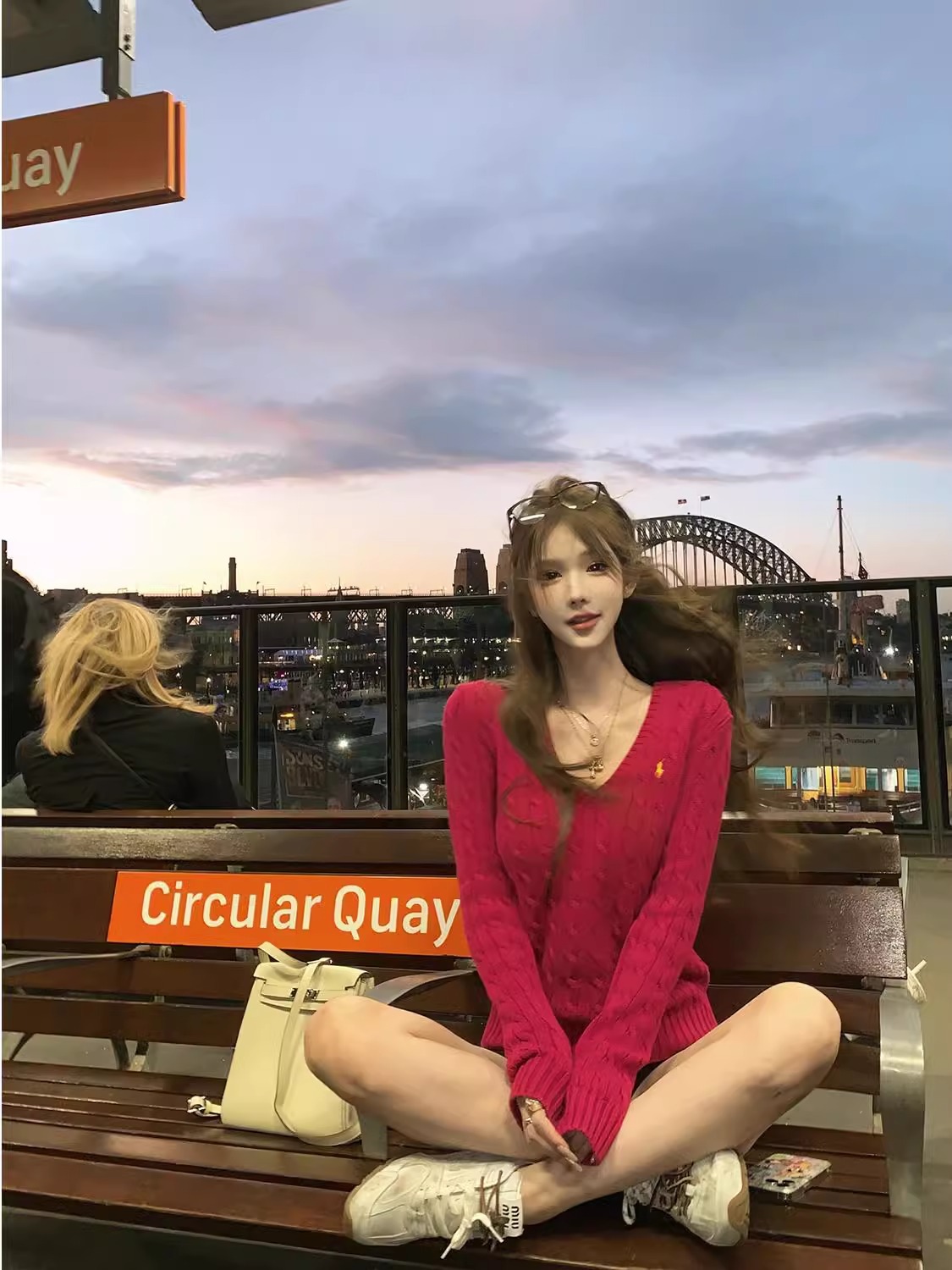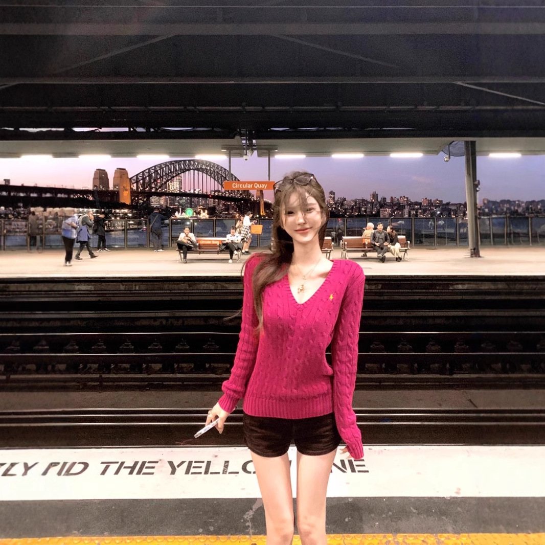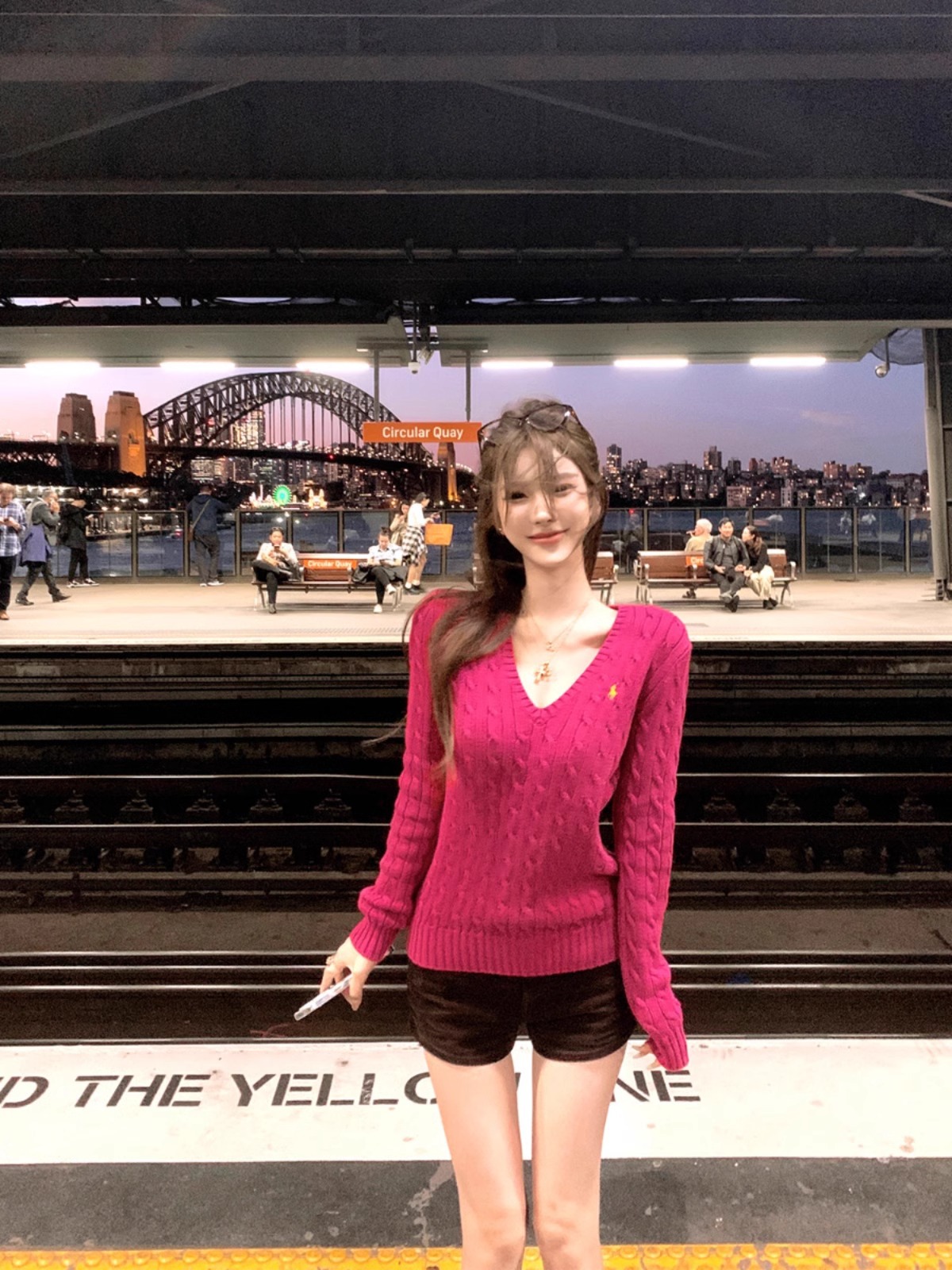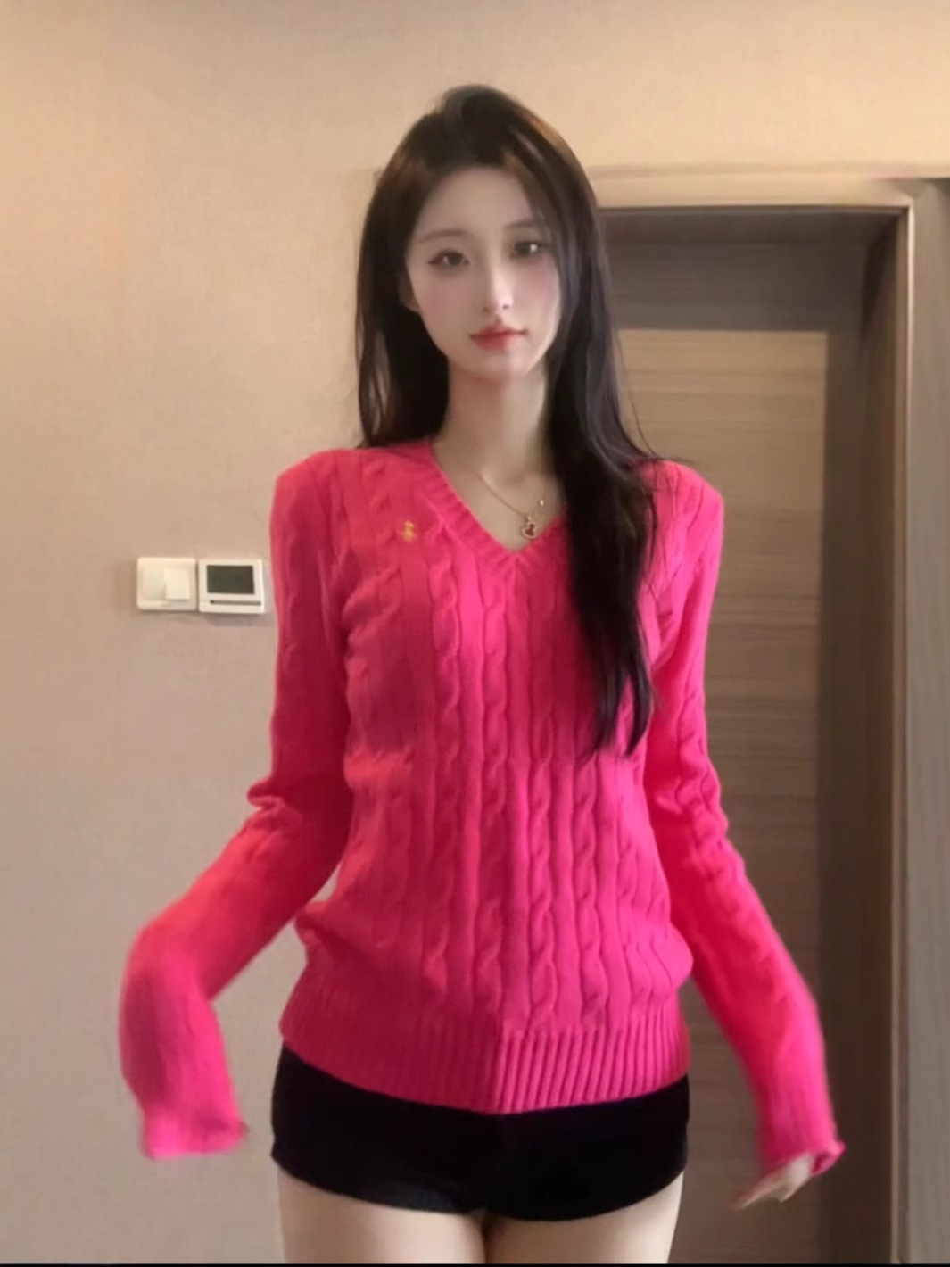 퍼스 바비 로즈 레드 V 넥 슬림 핏 트위스트 스웨터 여성 가을과 겨울 긴팔 니트 탑스토어 가기
